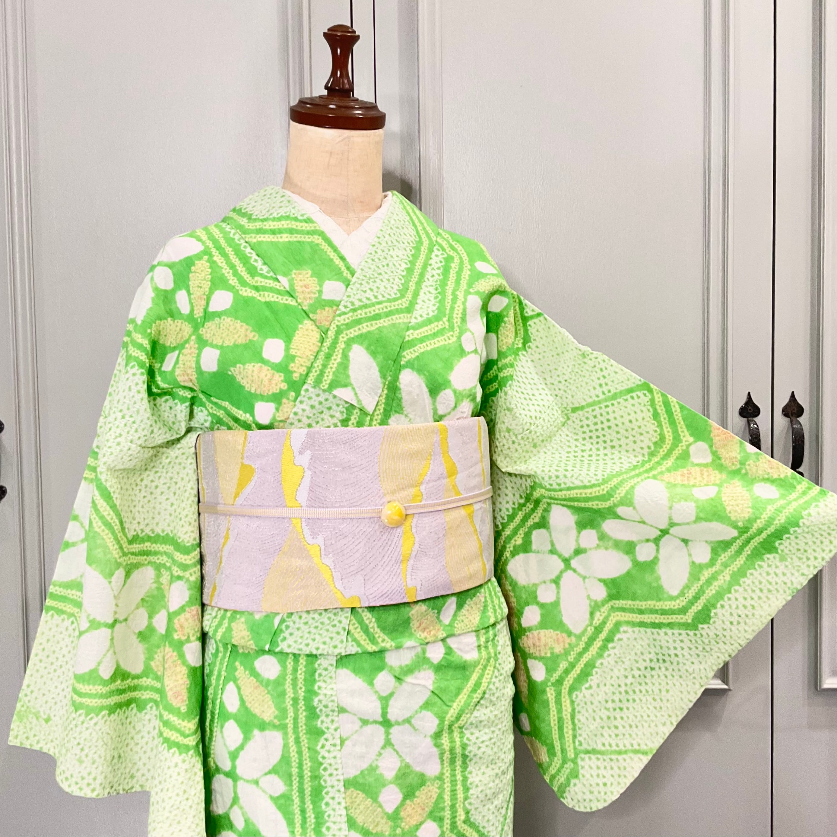 爽やかなイエローグリーンの地色に、七宝のような花模様がデザインされた有松鳴海絞り浴衣です