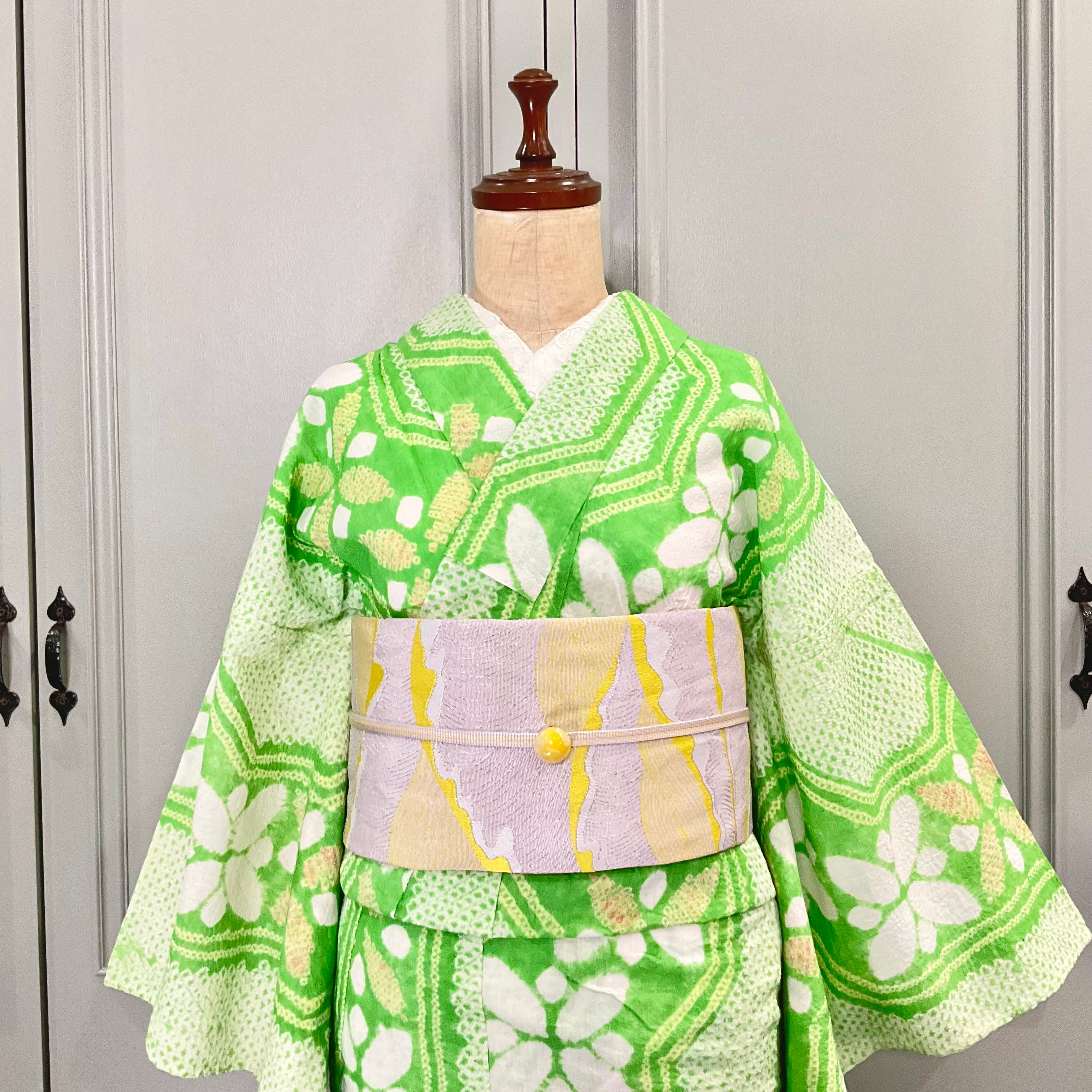 long*apple green*有松鳴海絞り浴衣 グリーン 花 爽やか A726