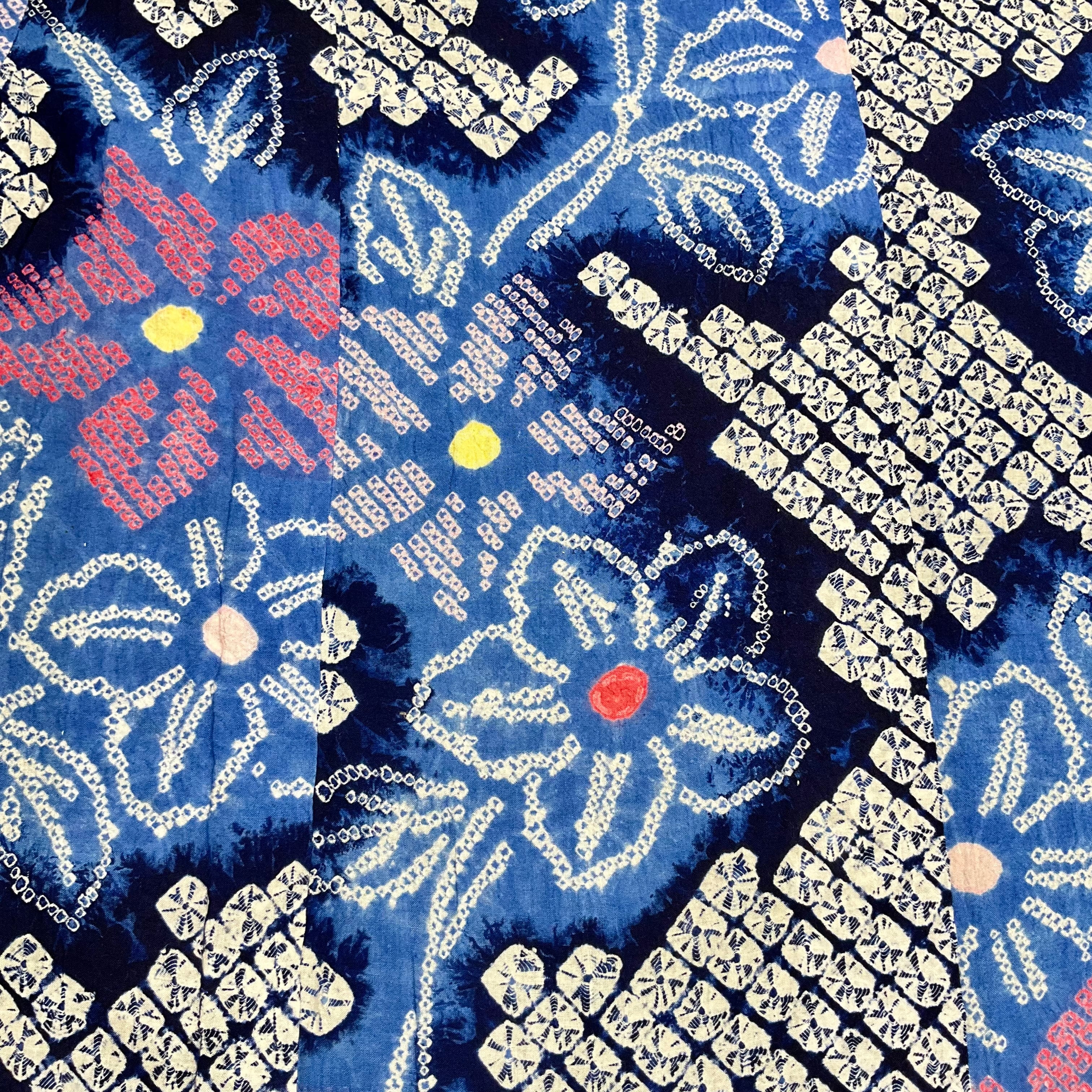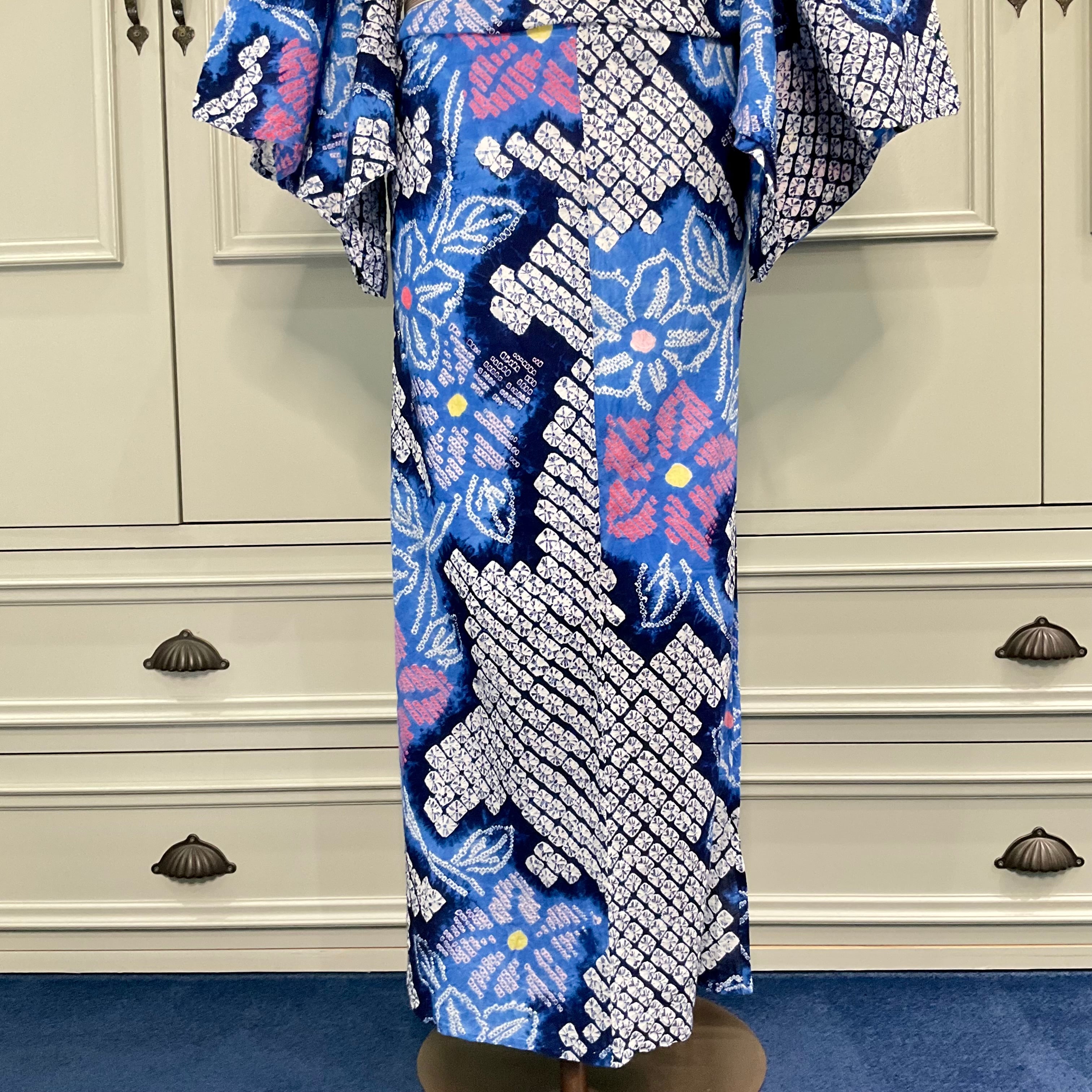 大ぶりのお花たちは流れるように動きがあり、お花が浮かび上がるように縁取られたスカイブルーと濃紺が綺麗で、定番カラーの絞り浴衣の中でも華やかさと愛らしさが格段とありますね✨