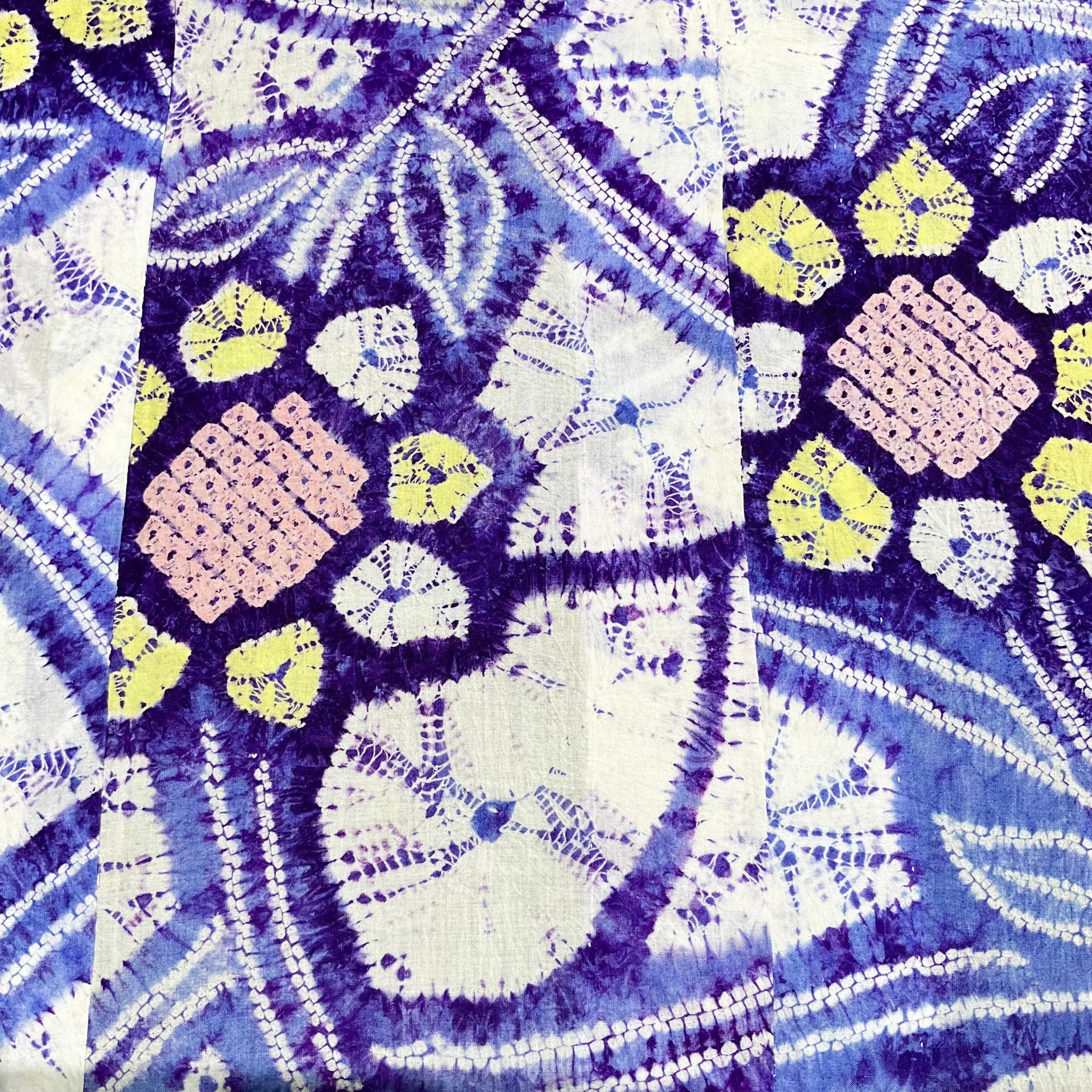 白地に紫と水色のグラデーションが綺麗な地色にひまわりがデザインされた、有松鳴海絞り浴衣です
