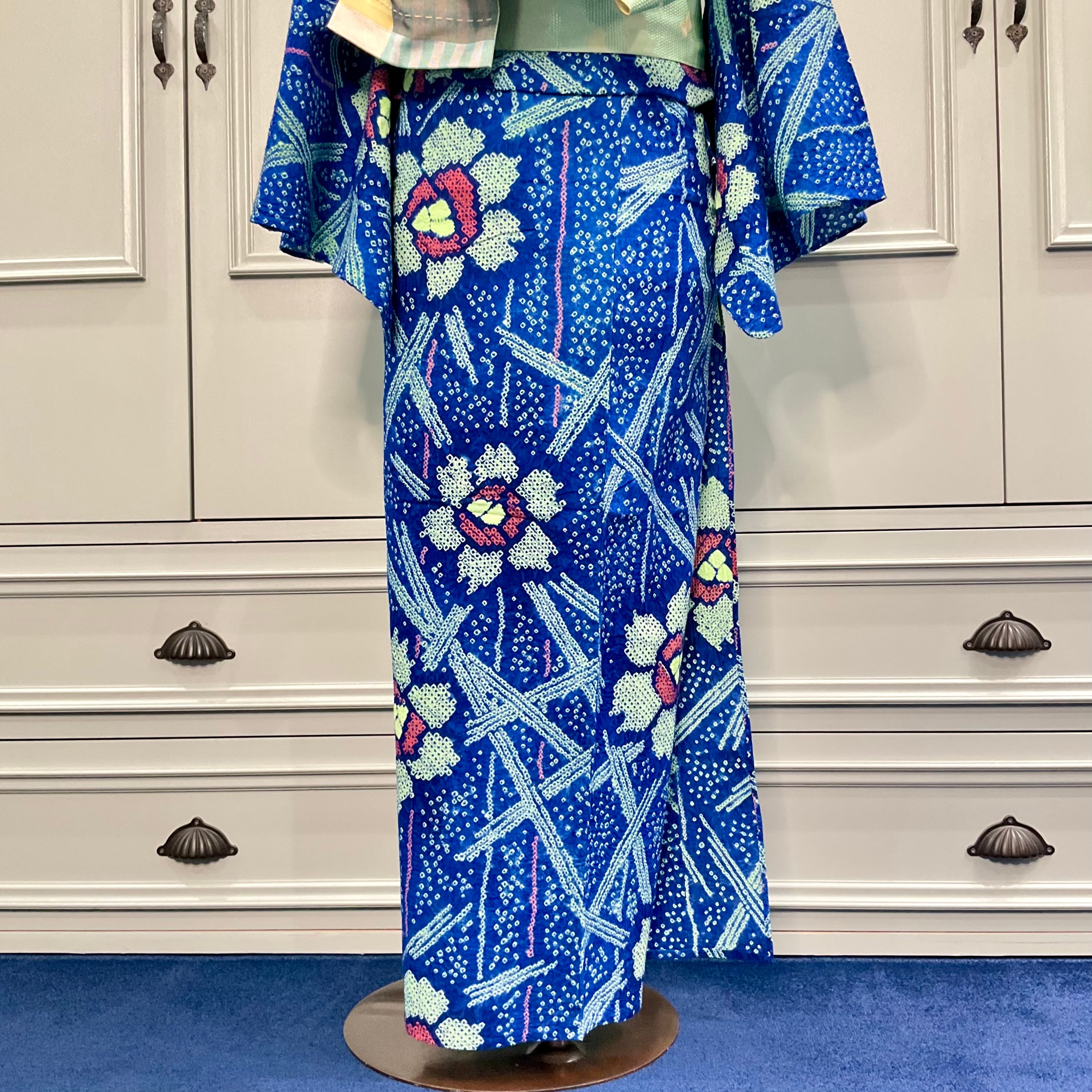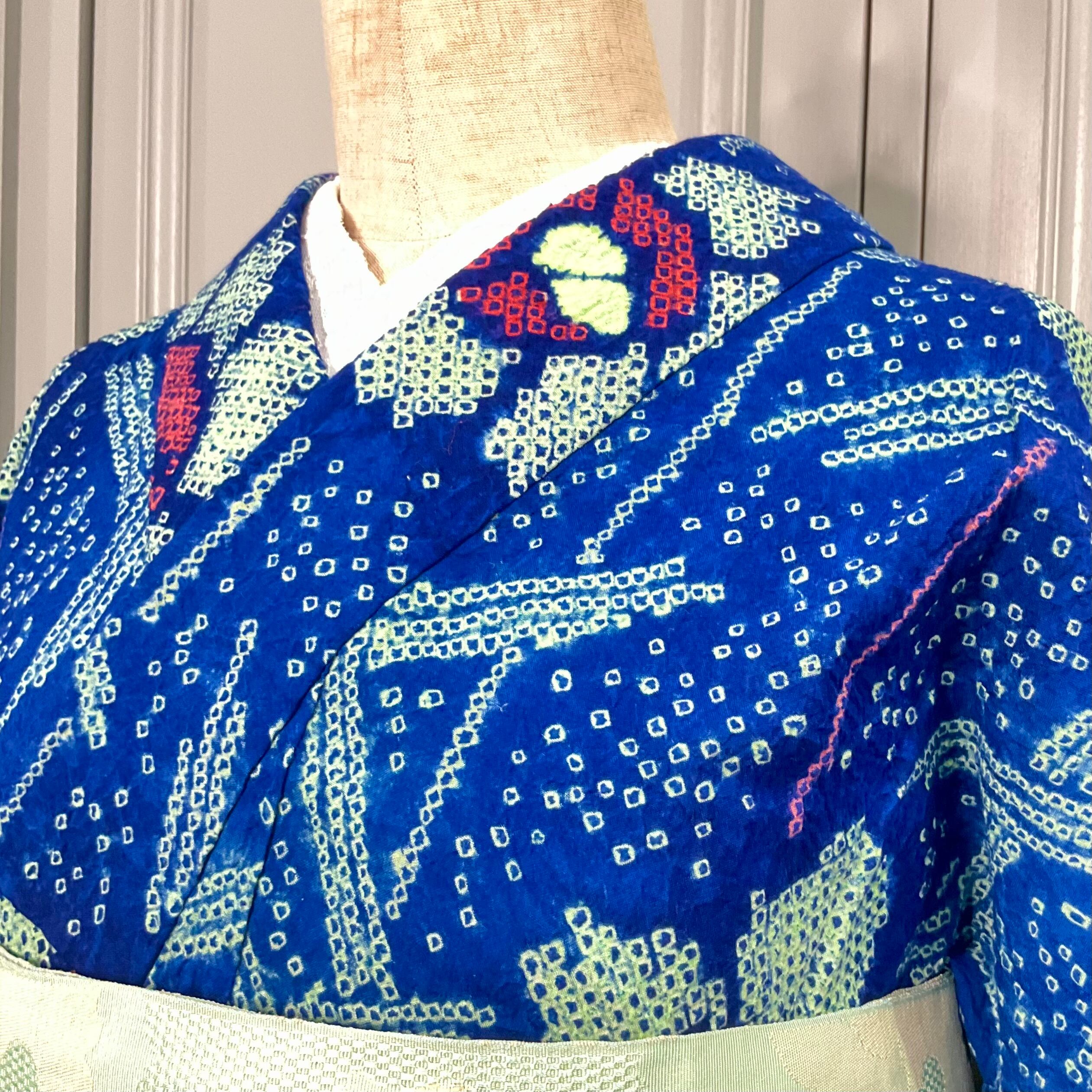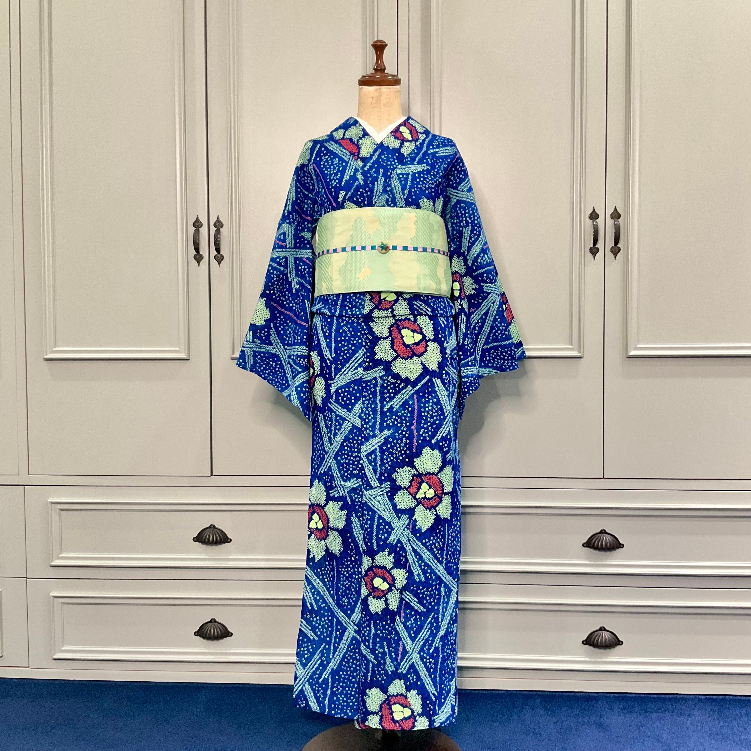 ブルーに近い明るめの紺地に、絞りでデザインされた花模様が白抜きではなく、ネオンのようなグリーンに彩られ、とってもレトロな雰囲気に!