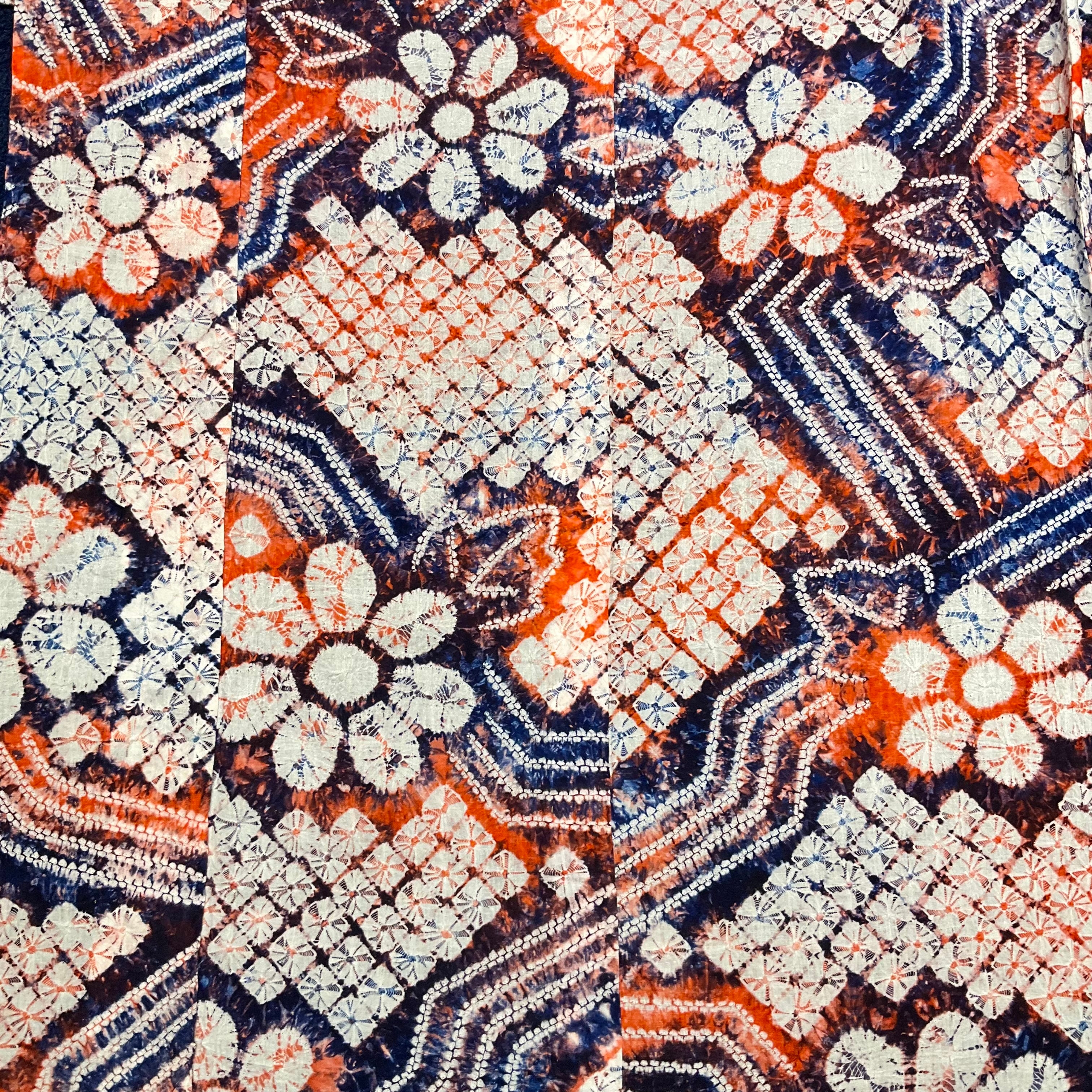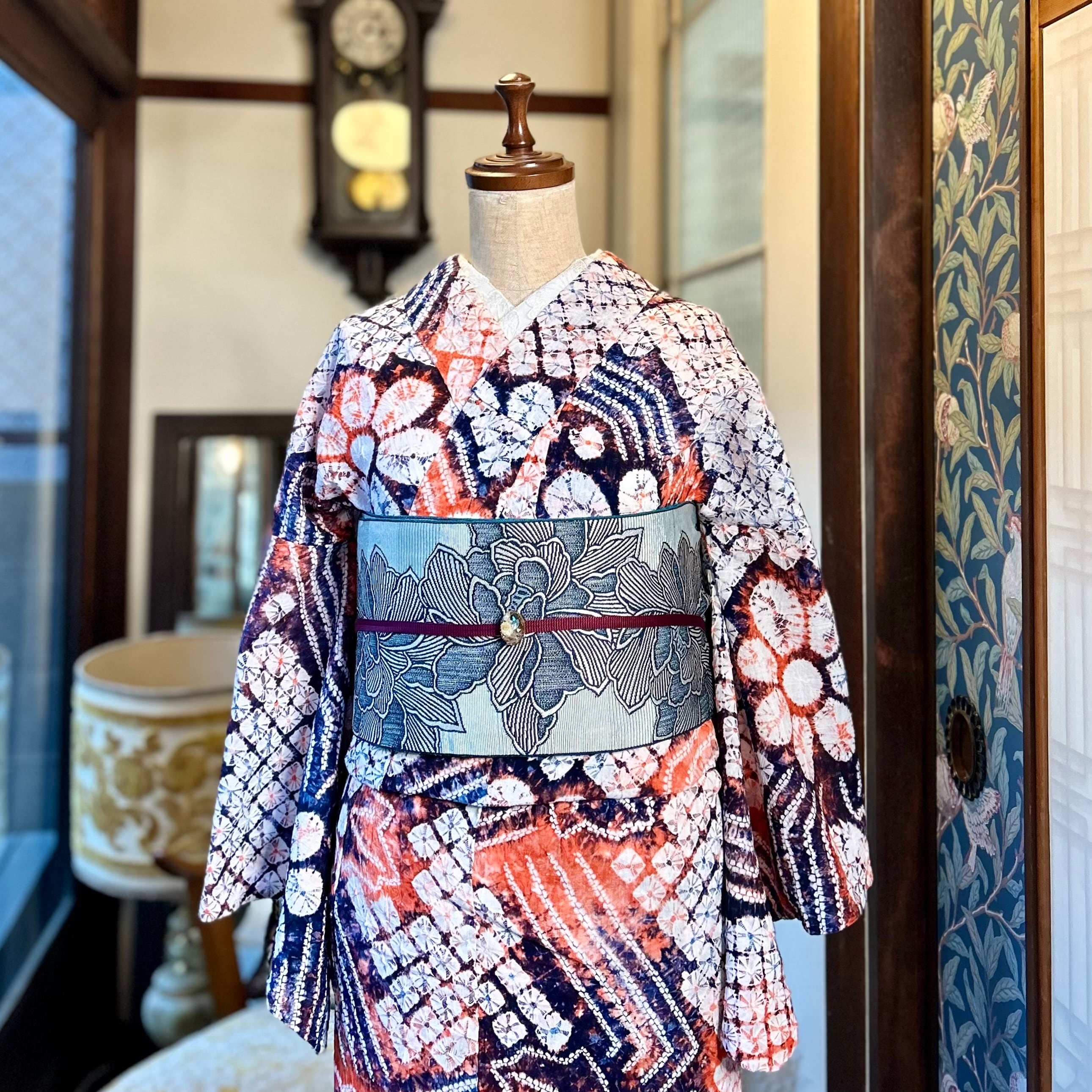 珍しい藍色×朱色の地色がパッと目を惹き、大胆な花の絞りと直線の模様に、地には機械蜘蛛絞りが隙間なくぎっしりとデザインされ、華やかさ満載です