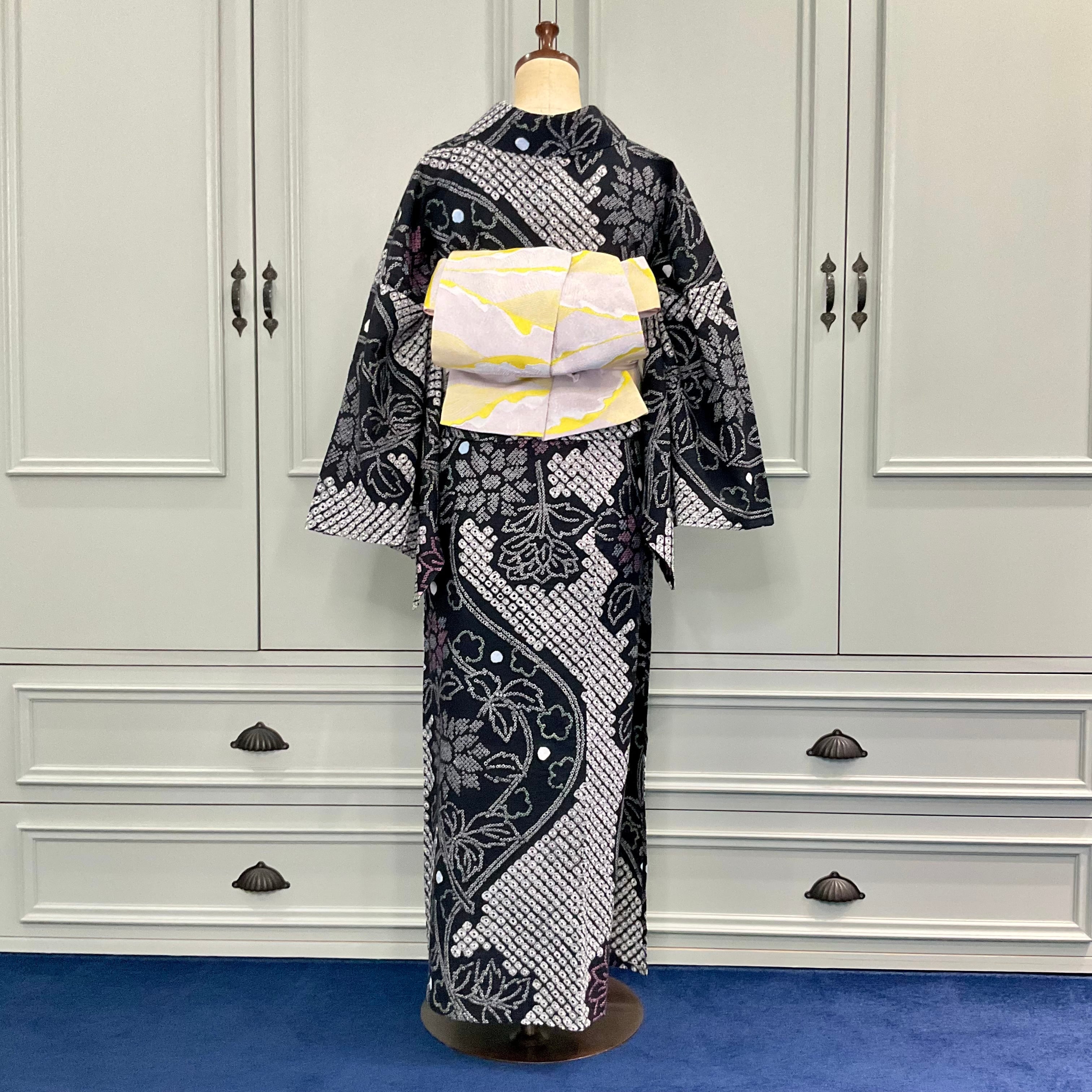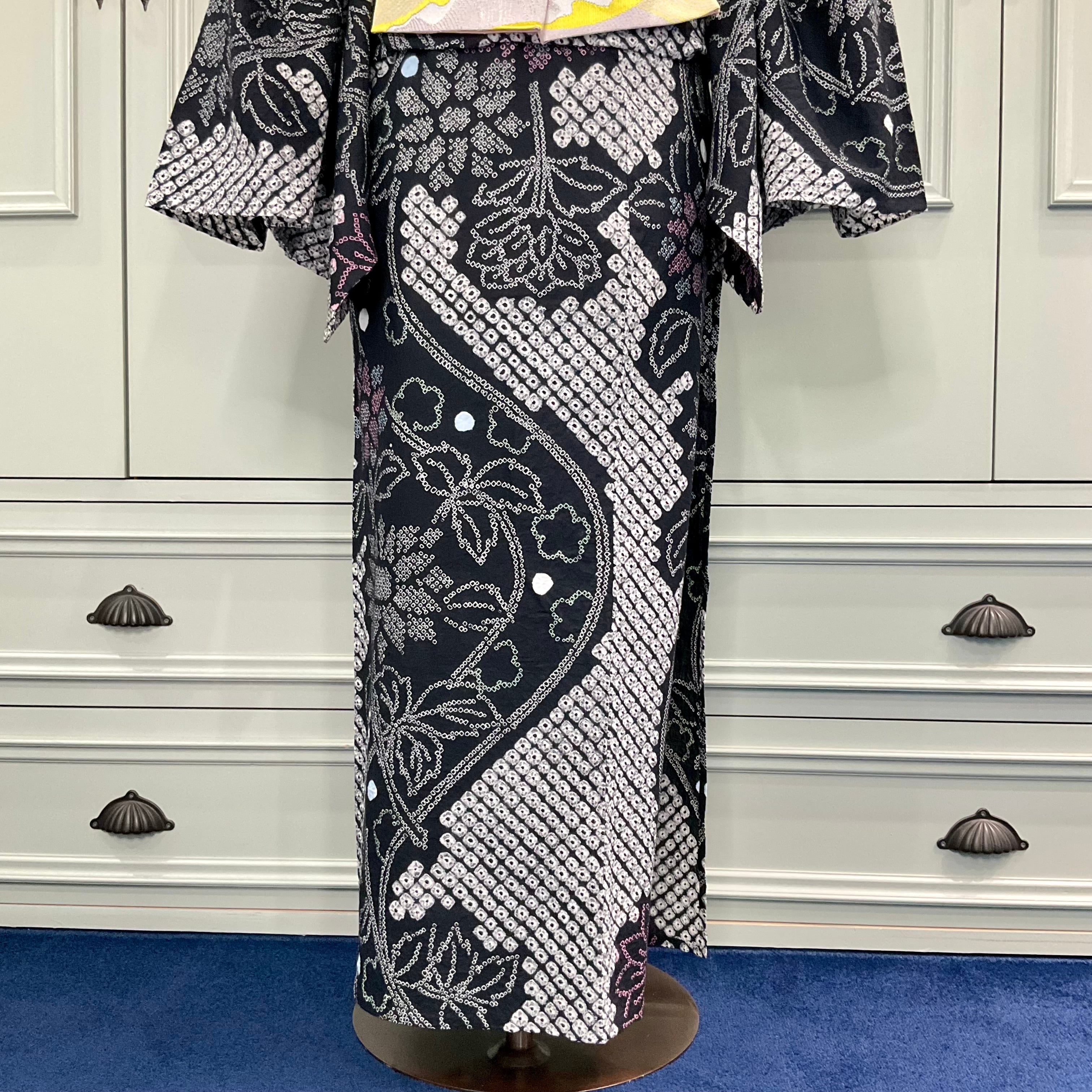 ブラックの地色に、白抜きの鹿の子模様と花柄がシャープで美しい有松鳴海絞り浴衣です
