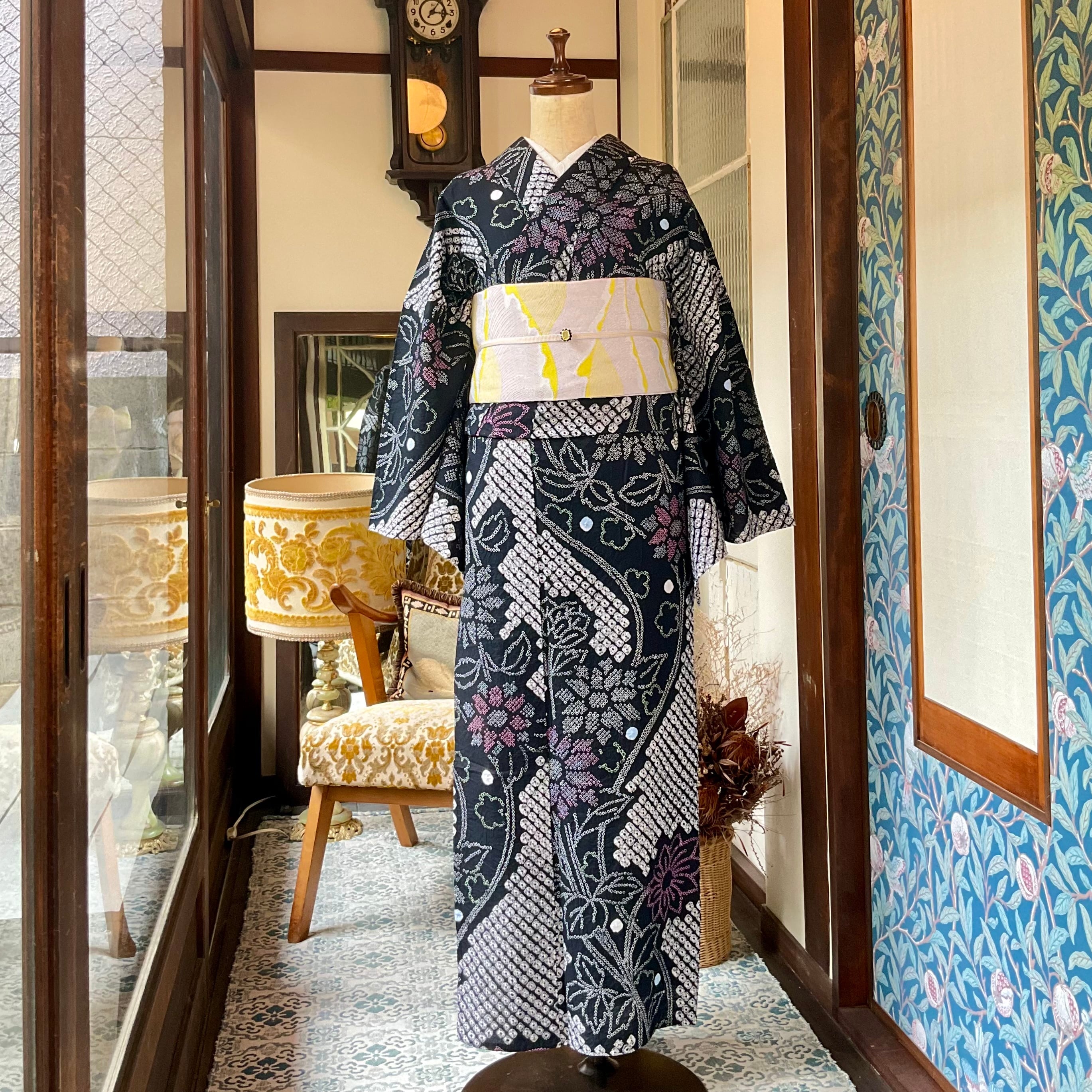 long*night garden*有松鳴海絞り浴衣 ブラック 黒 花 A741