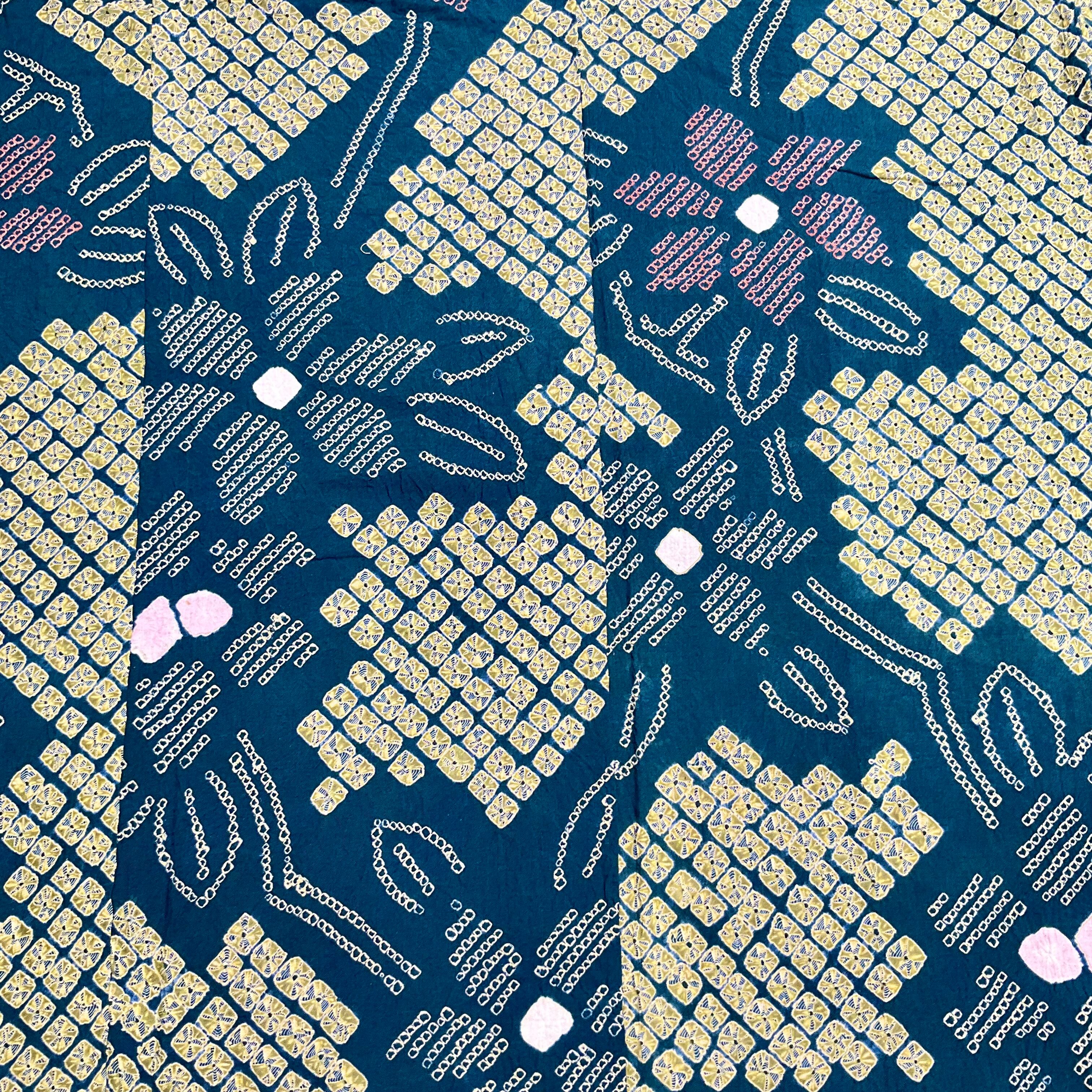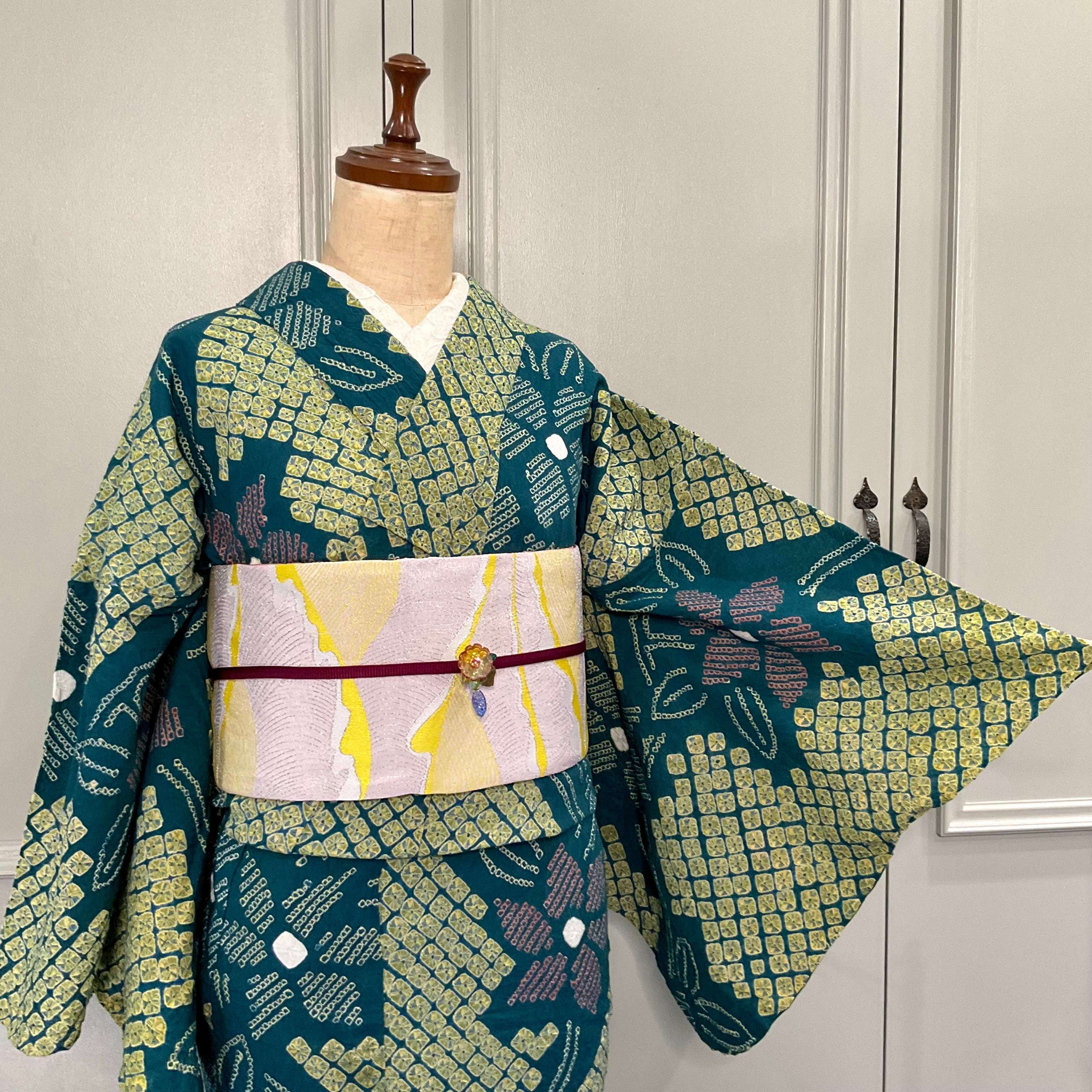 ビリジアングリーンの地色に、花模様がデザインされたキレイな有松鳴海絞り浴衣です♪