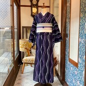 昔ながらの藍染にくっきりとホワイトとラベンダーカラーの絞りが映え、縦ラインにやわらかくデザインされた立涌模様がとっても粋で洗練された印象ですね♡