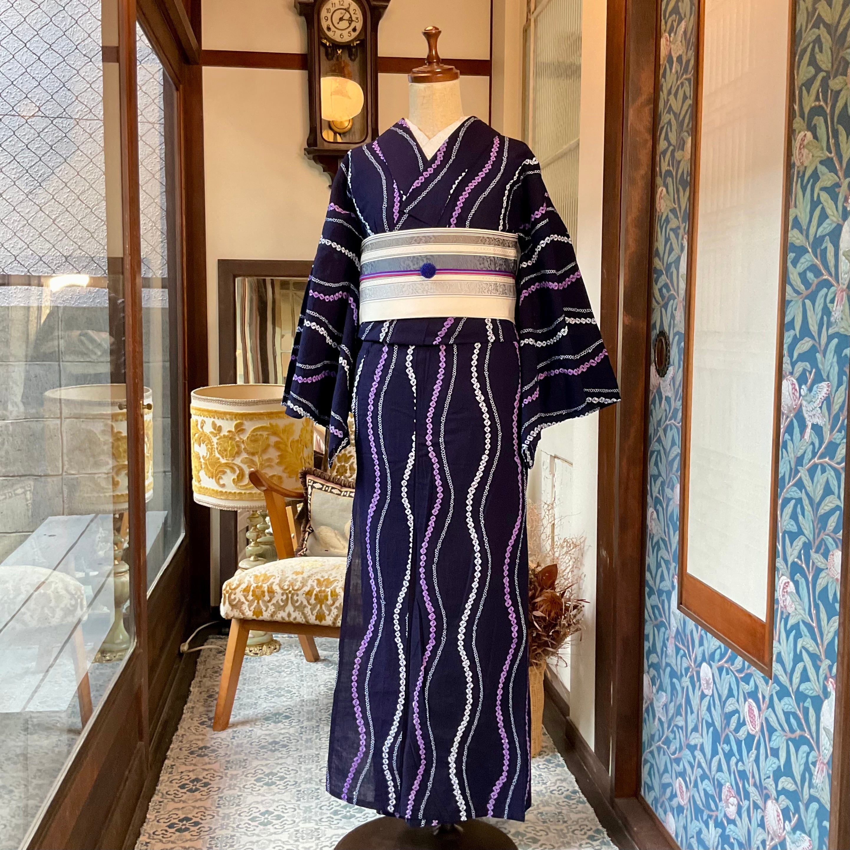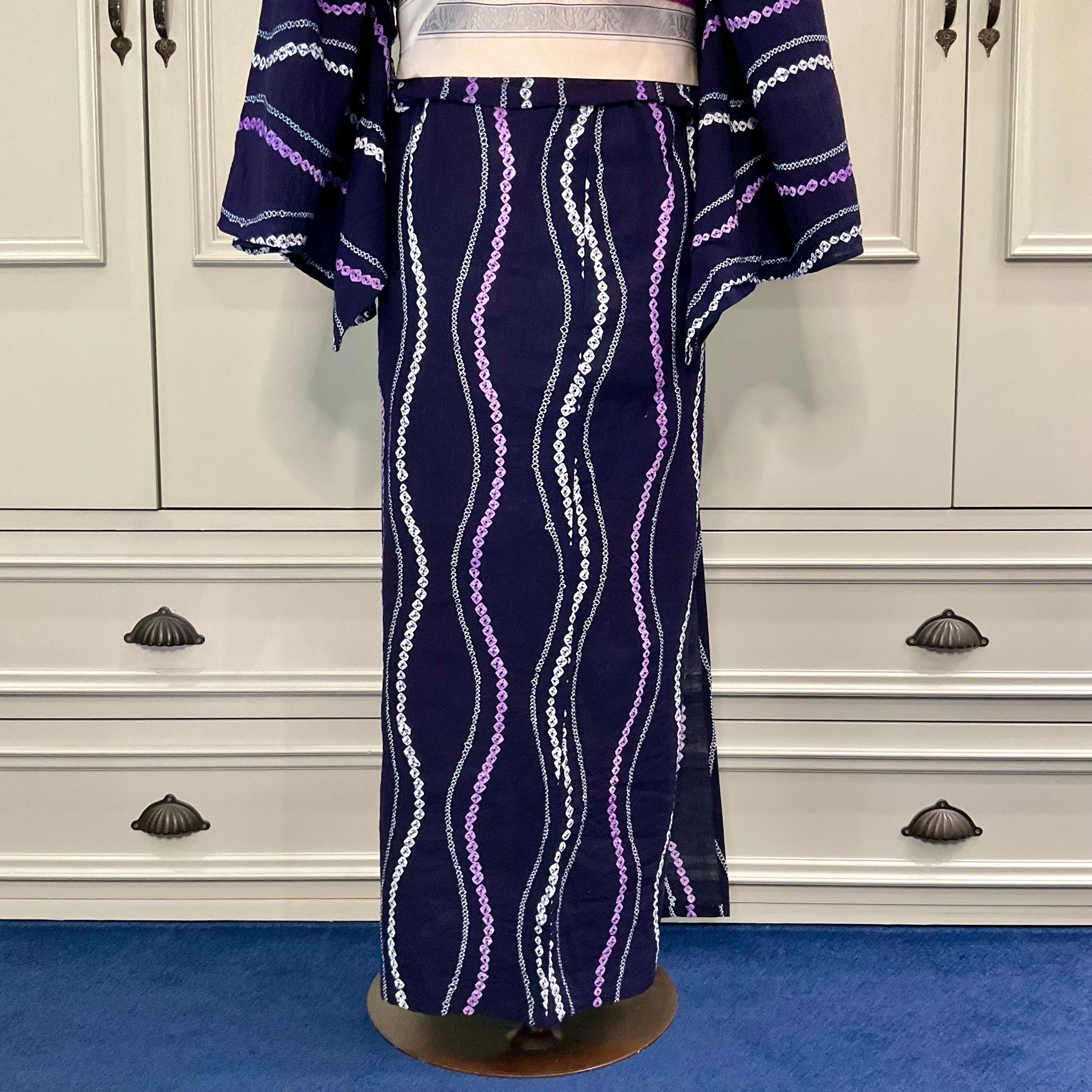 宵のゆらめき*有松鳴海絞り浴衣 立涌 紫 パープル 藍 紺 A748