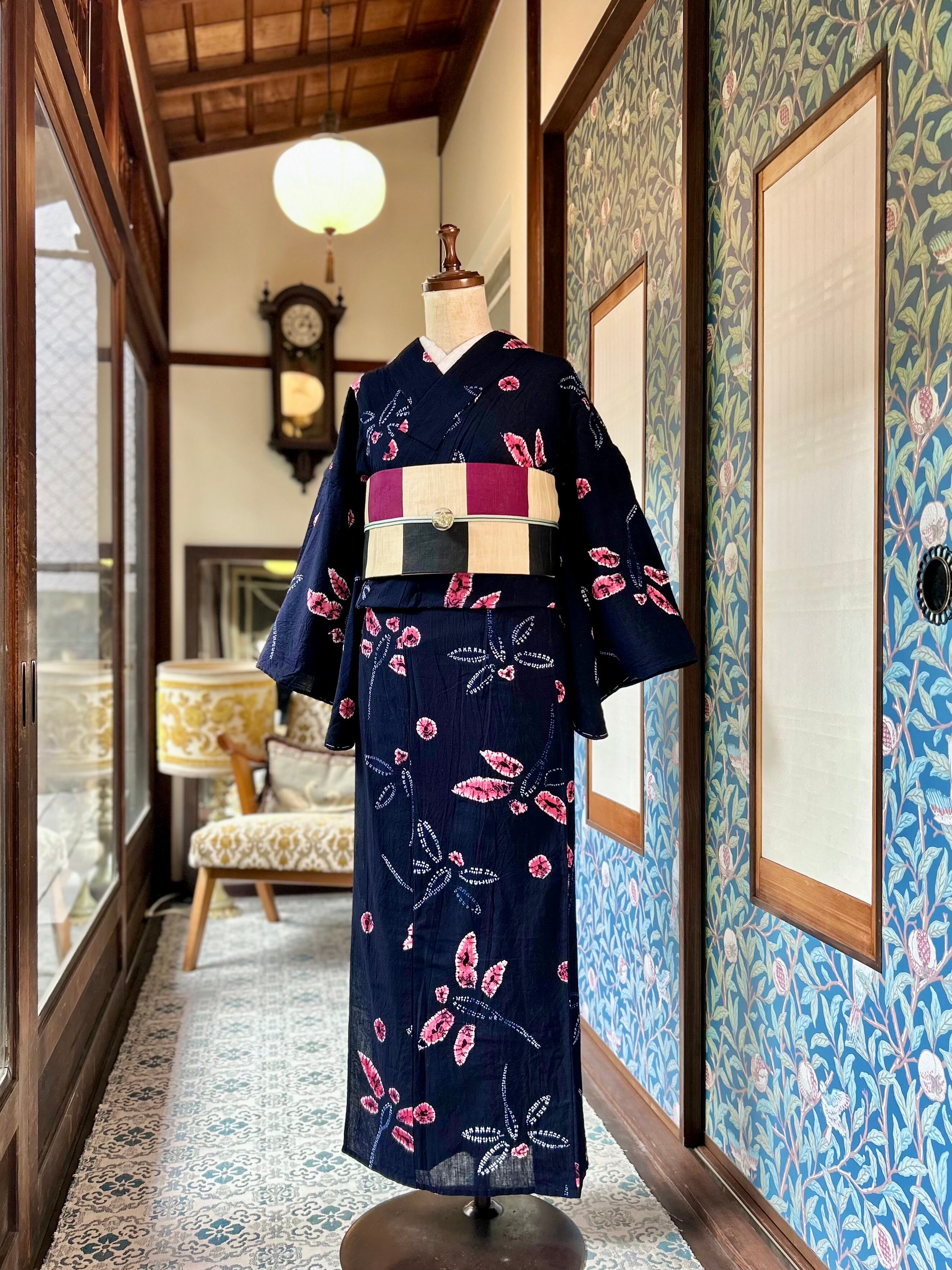 藍色の地色に、絞りでデザインされた赤トンボが風情ある有松鳴海絞り浴衣です♪