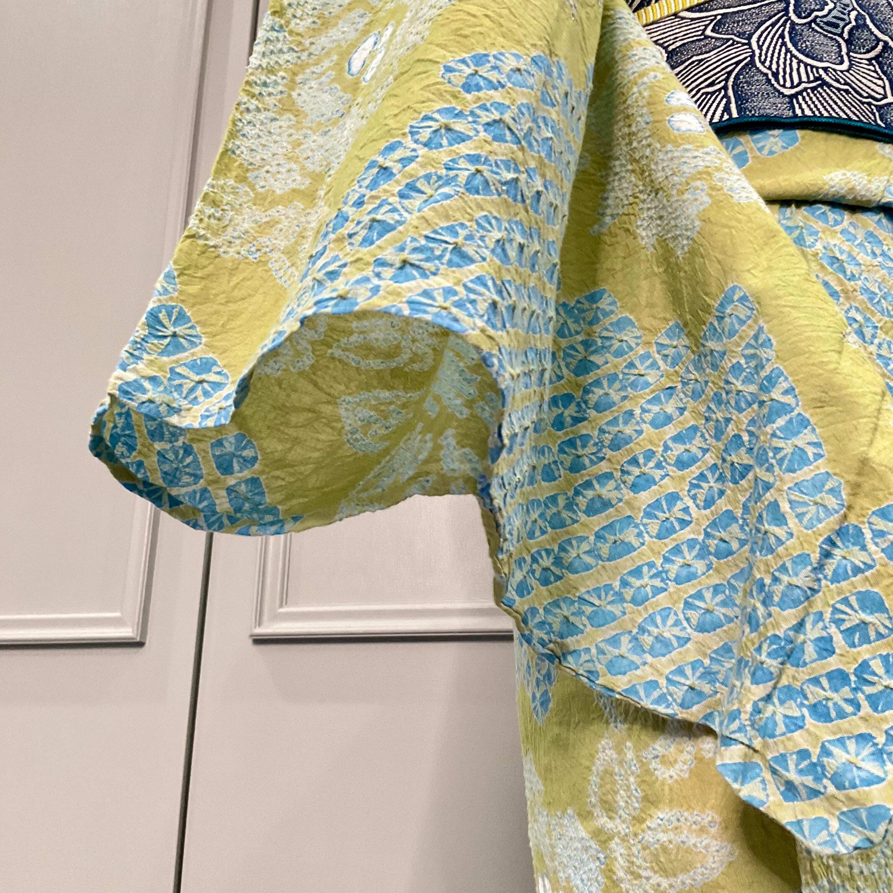 大きめの蜘蛛絞り模様は、落ち着いたブルーが使われ、モスグリーン×ブルーの組み合わせが上品で珍しく、とても綺麗です✨
