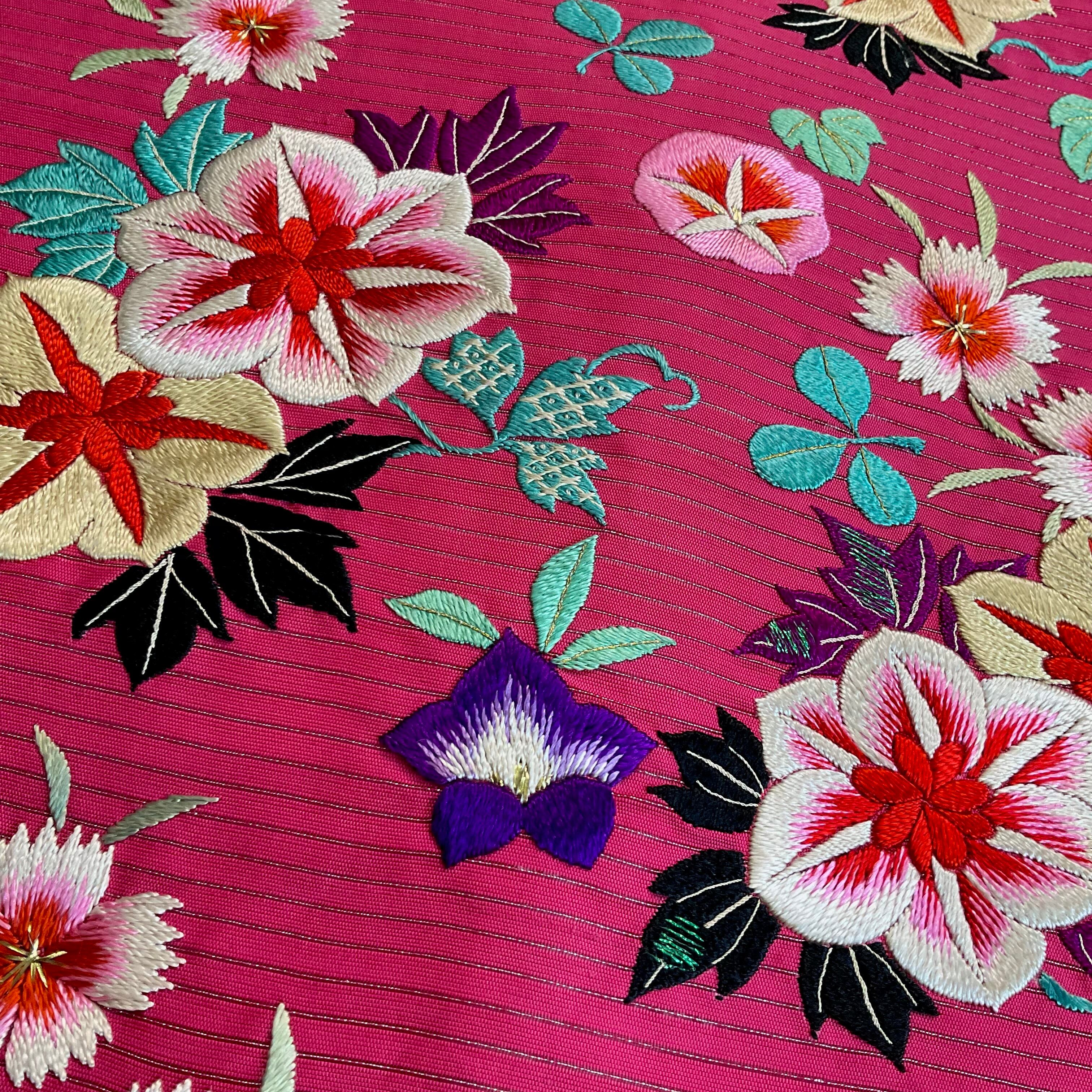クレマチスや撫子、桔梗、朝顔などのお花がふんだんに刺繍され、手刺繍ならではのふっくらとした立体感が豪華ですね✨