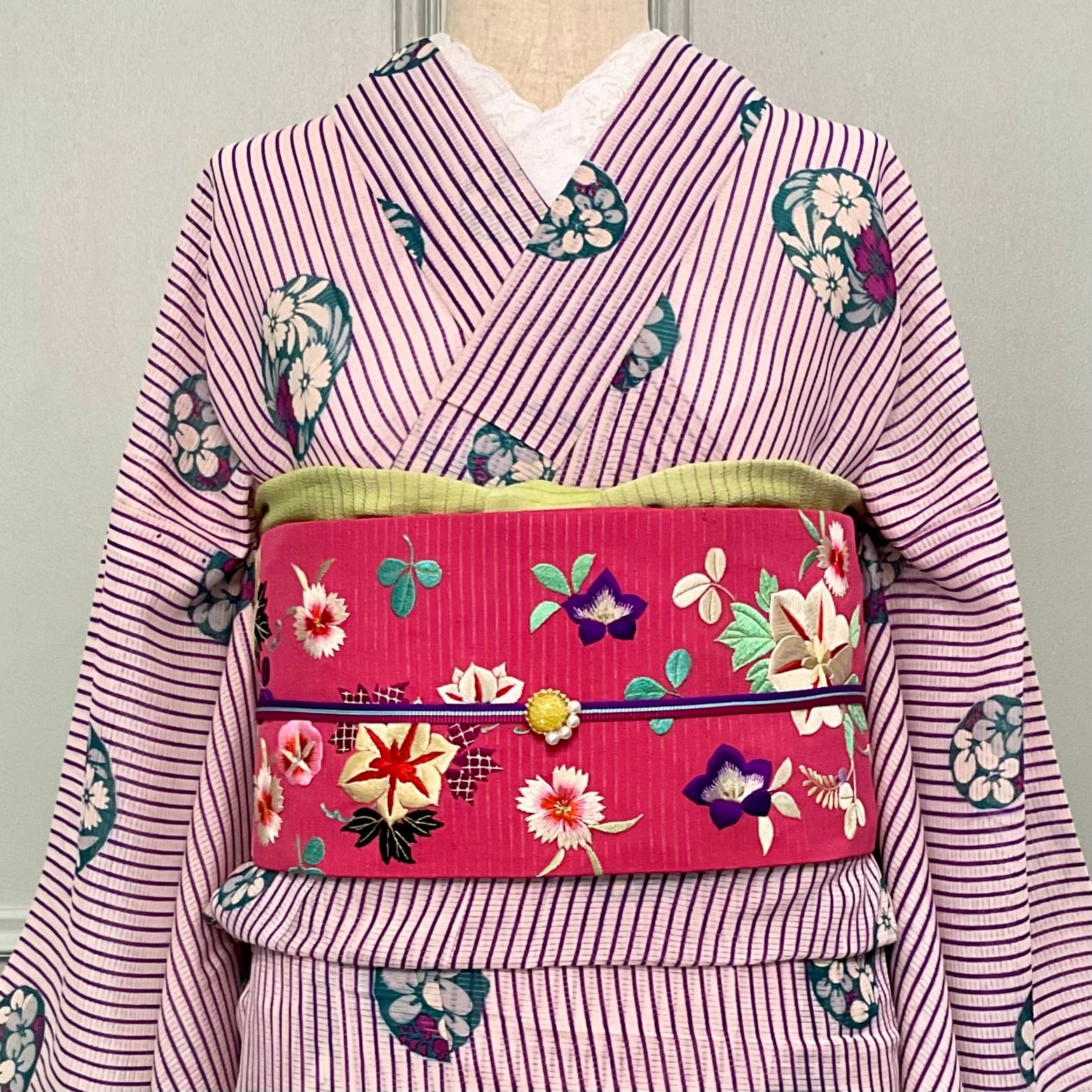 濃いピンク地に夏から秋の花々の刺繍が美しいアンティークの夏名古屋帯です♪