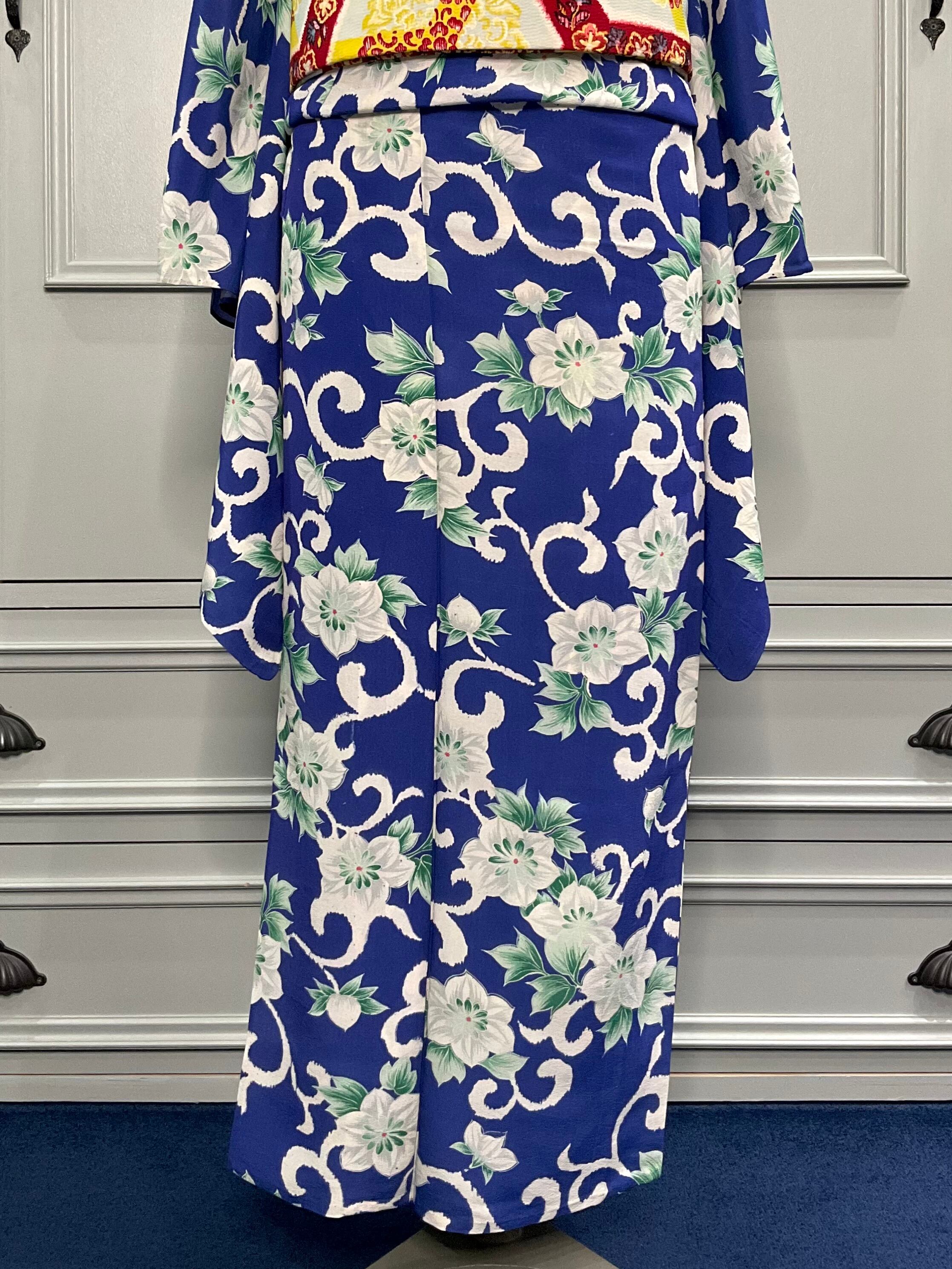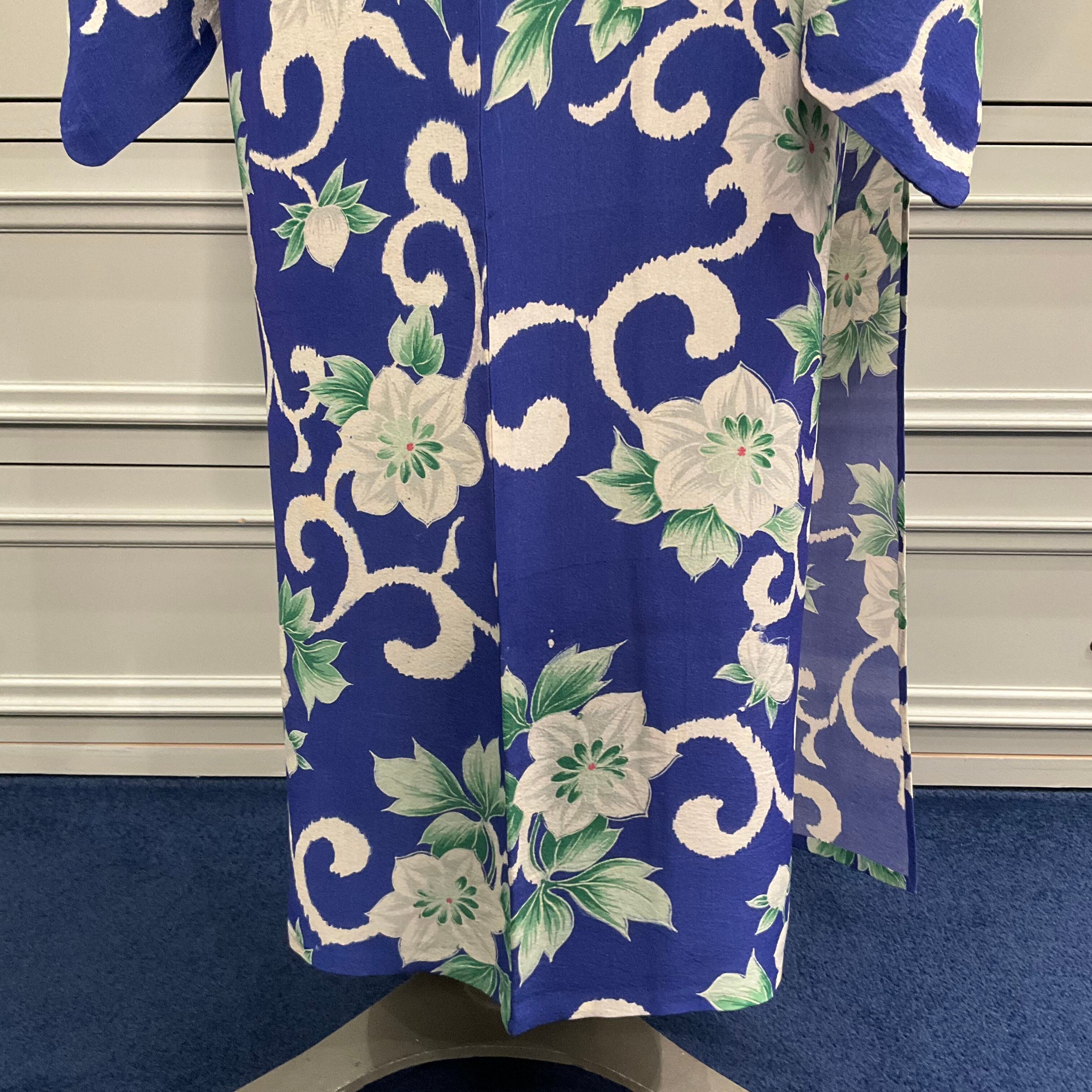 ブルー地に白いクレマチスと唐草柄のアンティーク単衣着物です