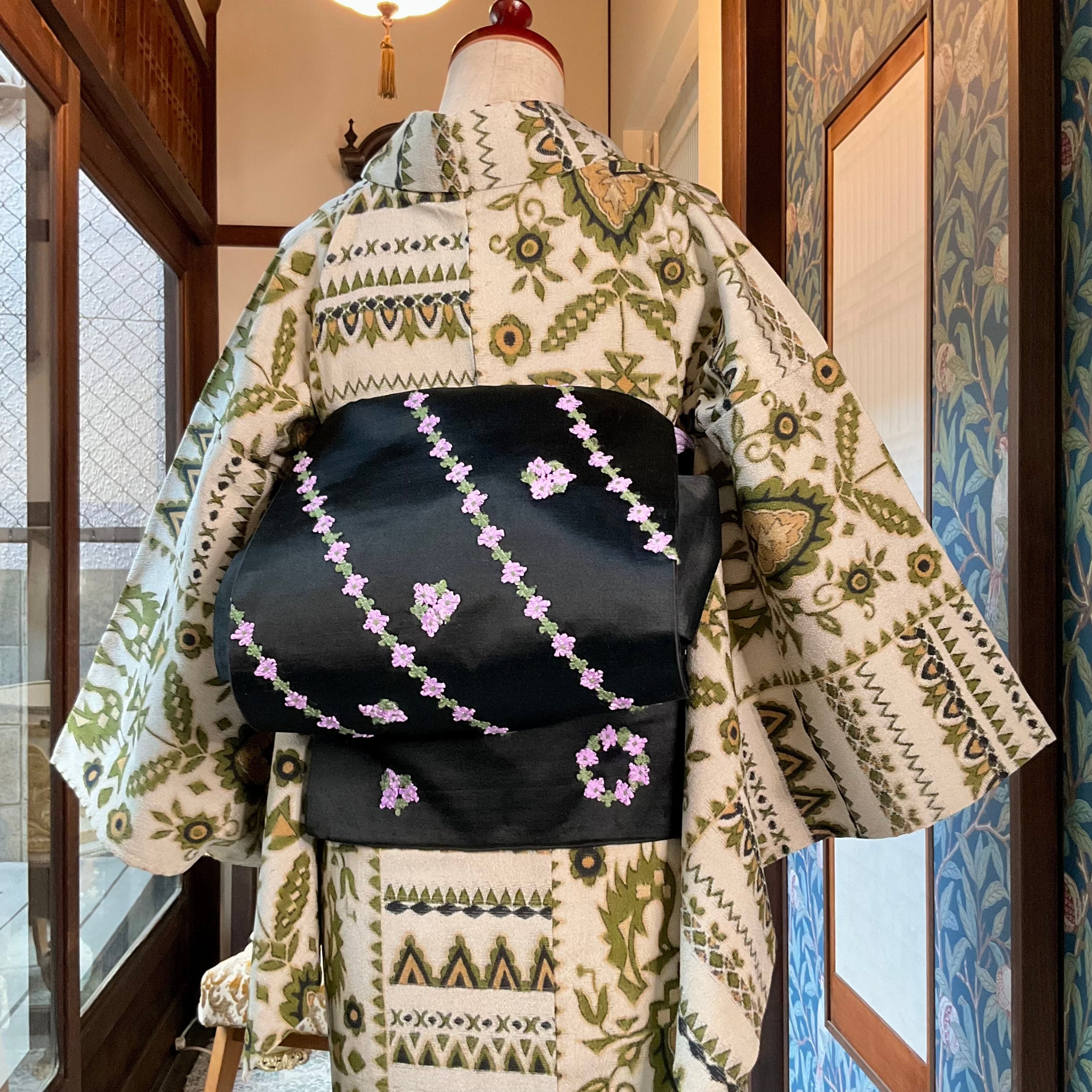 アンティークの生地ですが、お花のブレードが、現代モノの着物にもマッチさせてくれます♪