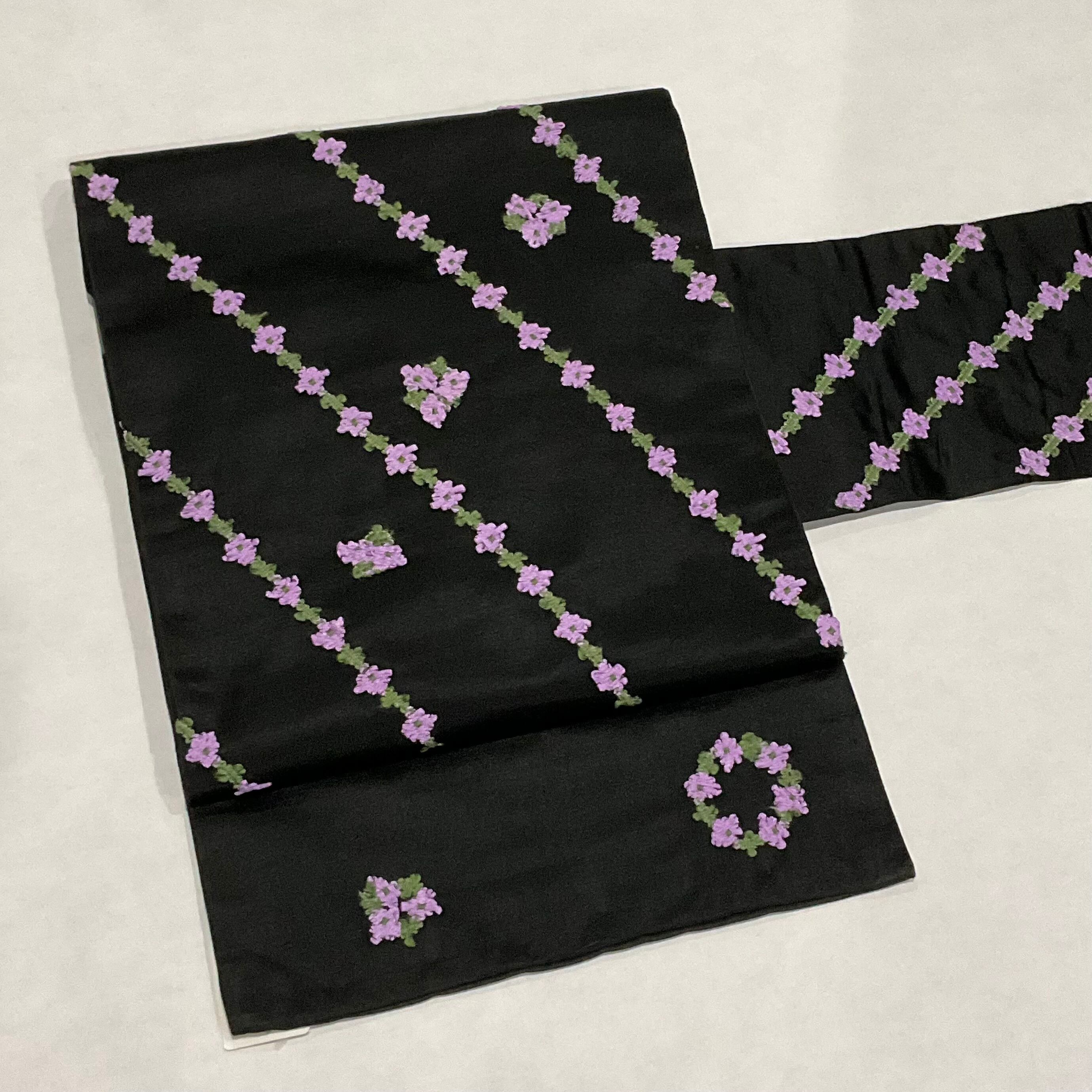 黒繻子地に、お花の刺繍ブレードがあしらわれたアンティーク名古屋帯です