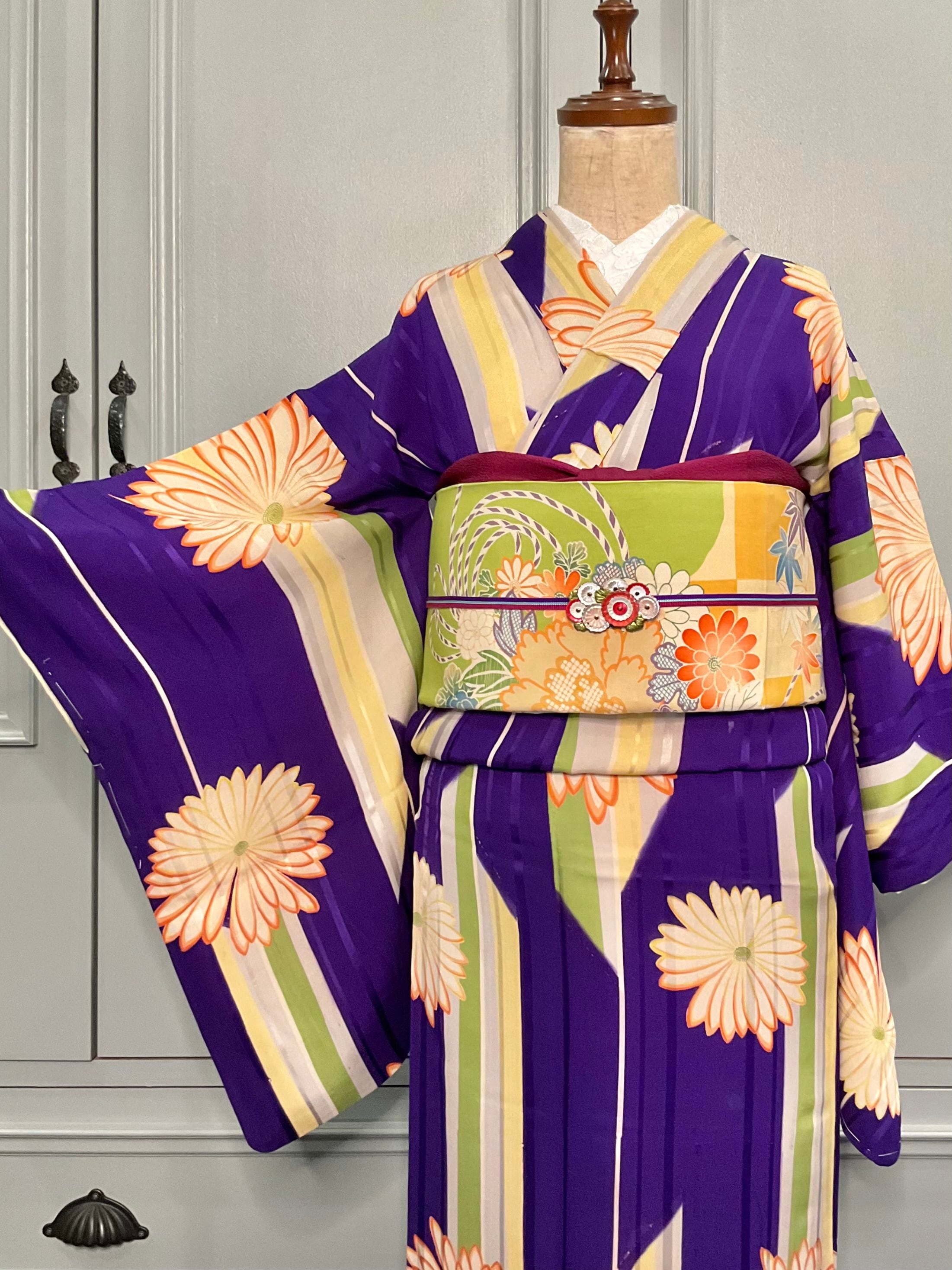 アンティークらしいパープル地に、大きな菊の花と矢羽根のモダンなデザインが素敵ですね♡