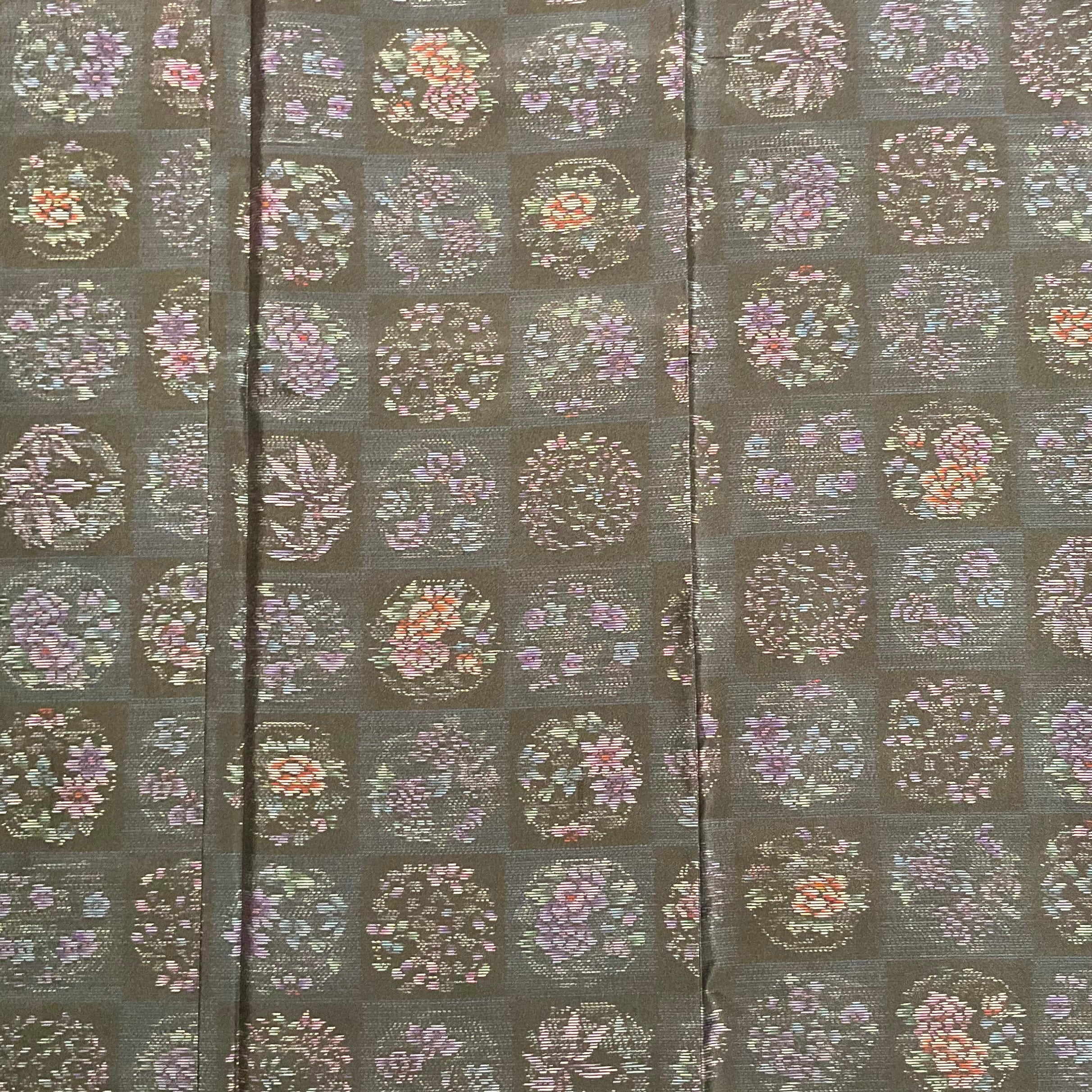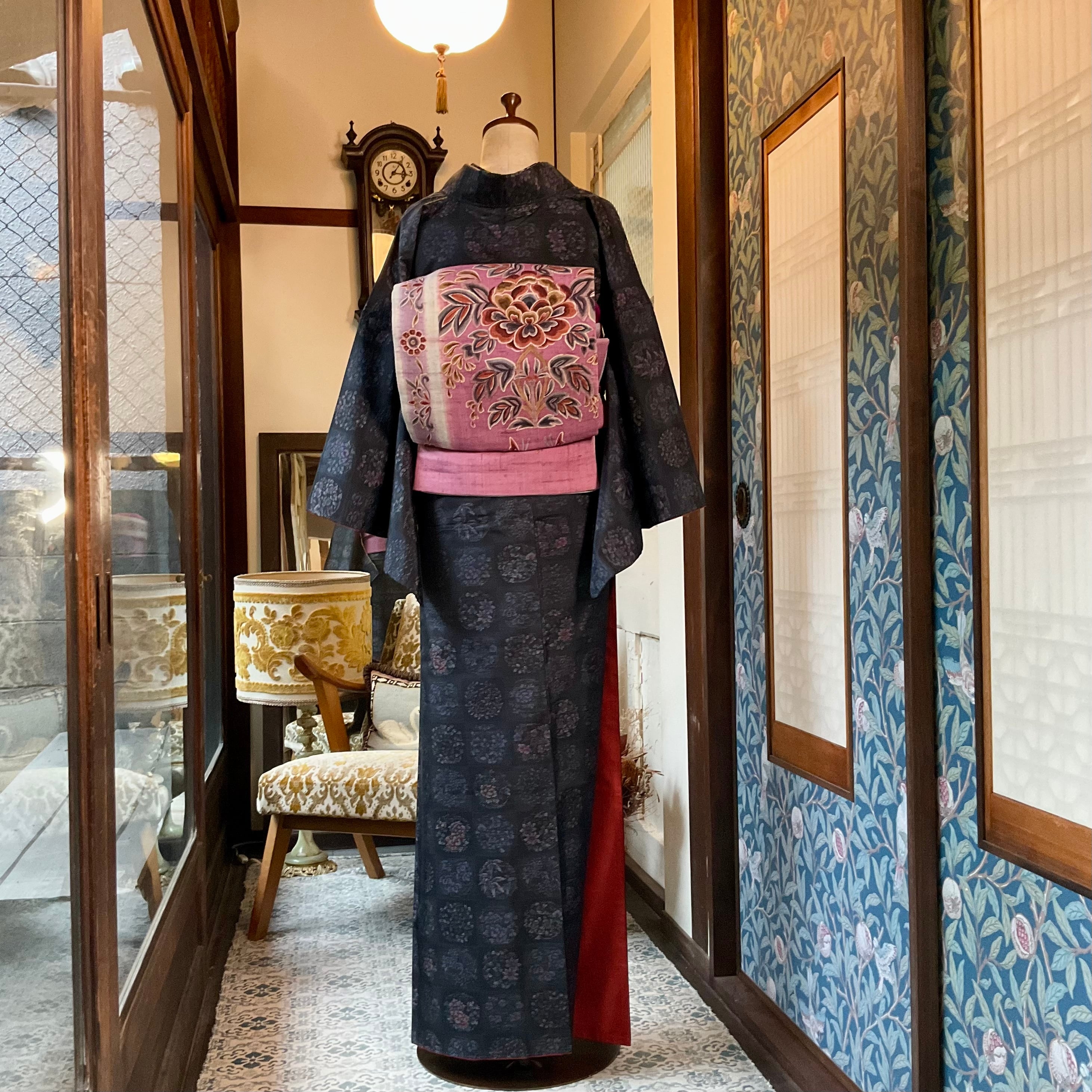さらりとしたハリのある生地感に大人の色使いが作り出す艶感、スラリと均一にデザインされた市松模様の中に様々な花丸文が美しく粋な着物です✨