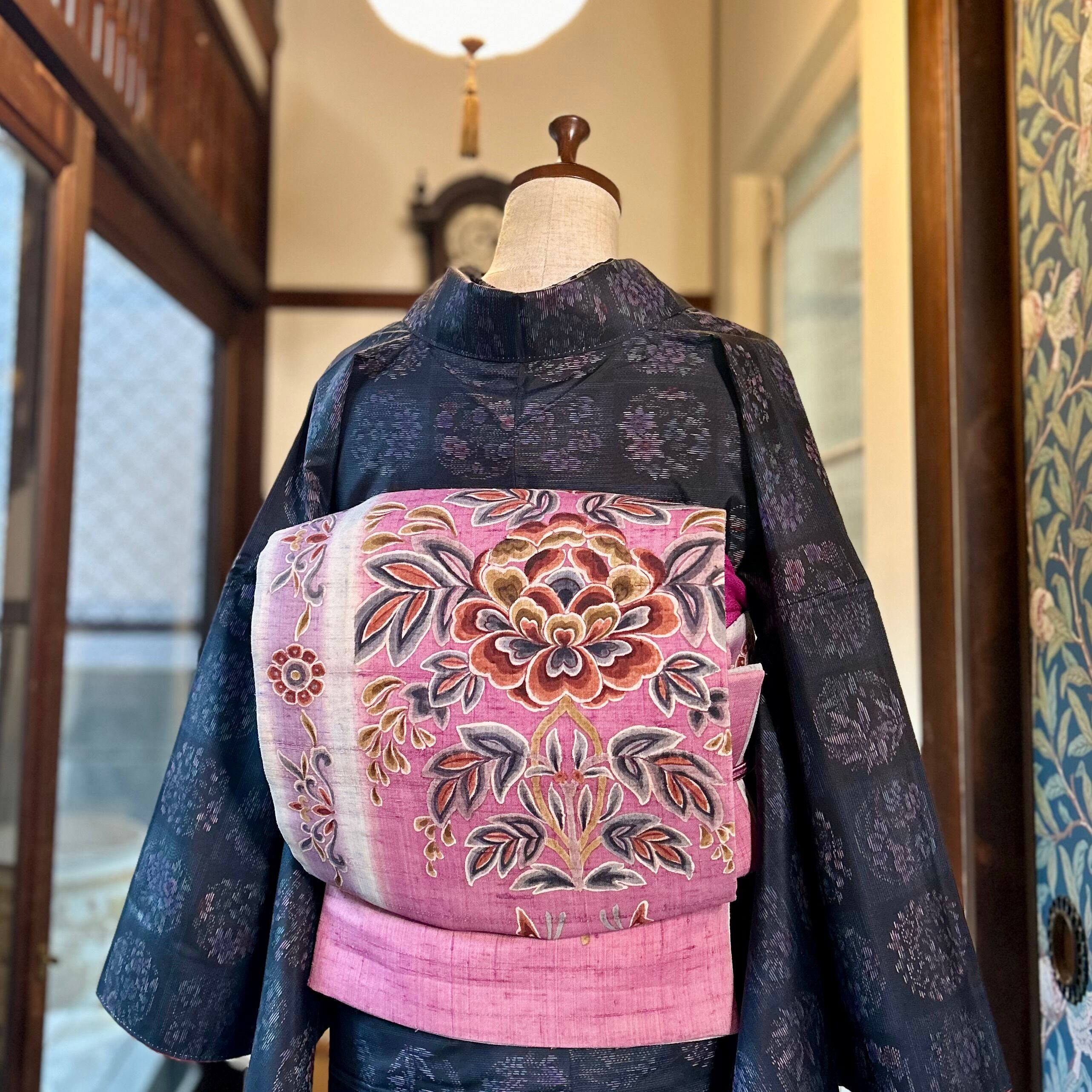 お太鼓柄の左側は菖蒲色をベースにし装飾のような花模様が描かれ、お太鼓柄、胴前も変化のあるデザインが洒落ていますね♡