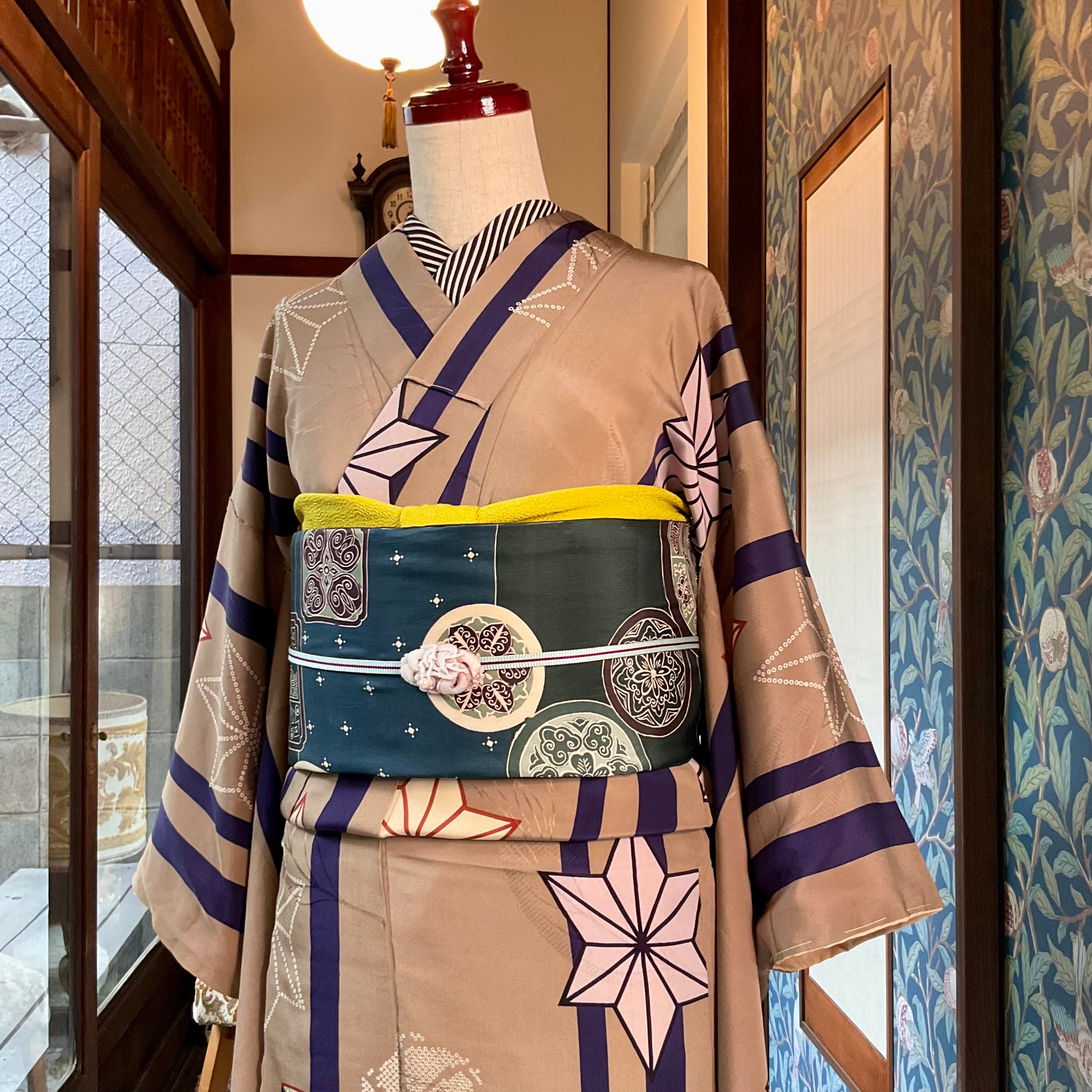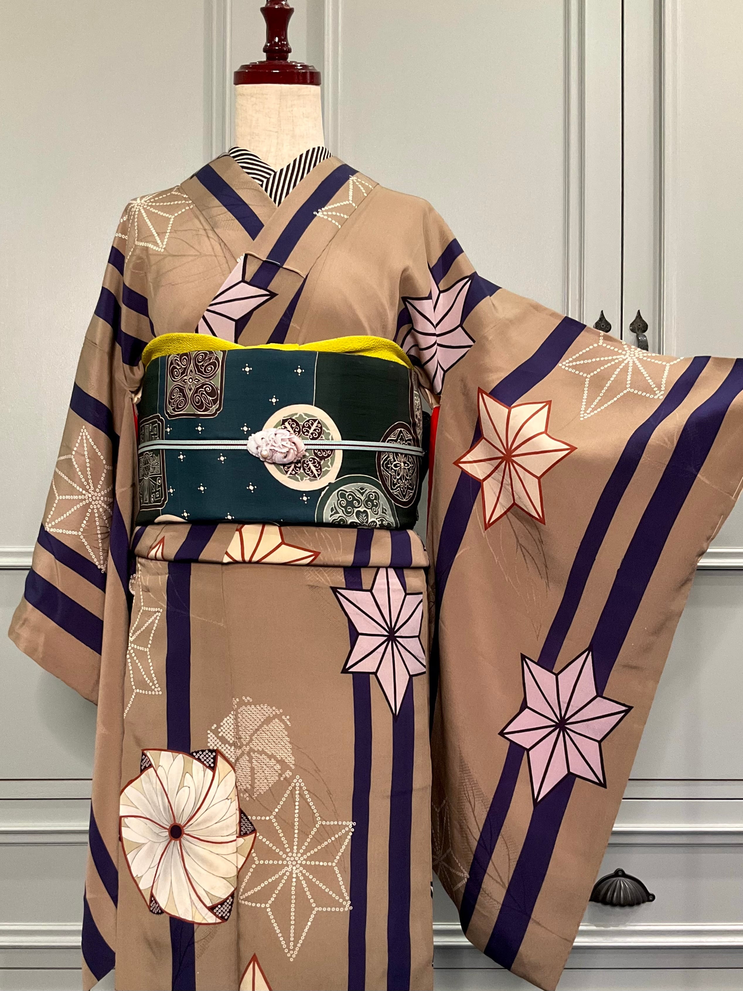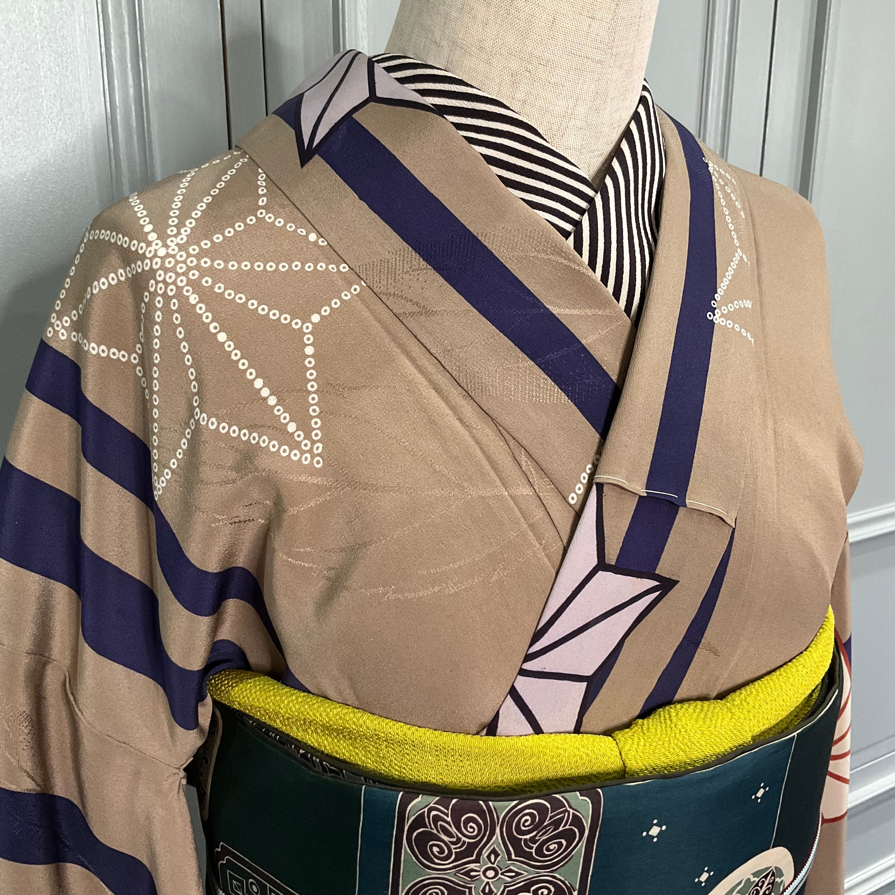 落ちついたモカベージュ地に、青紫の縞模様が粋で大人の雰囲気✨