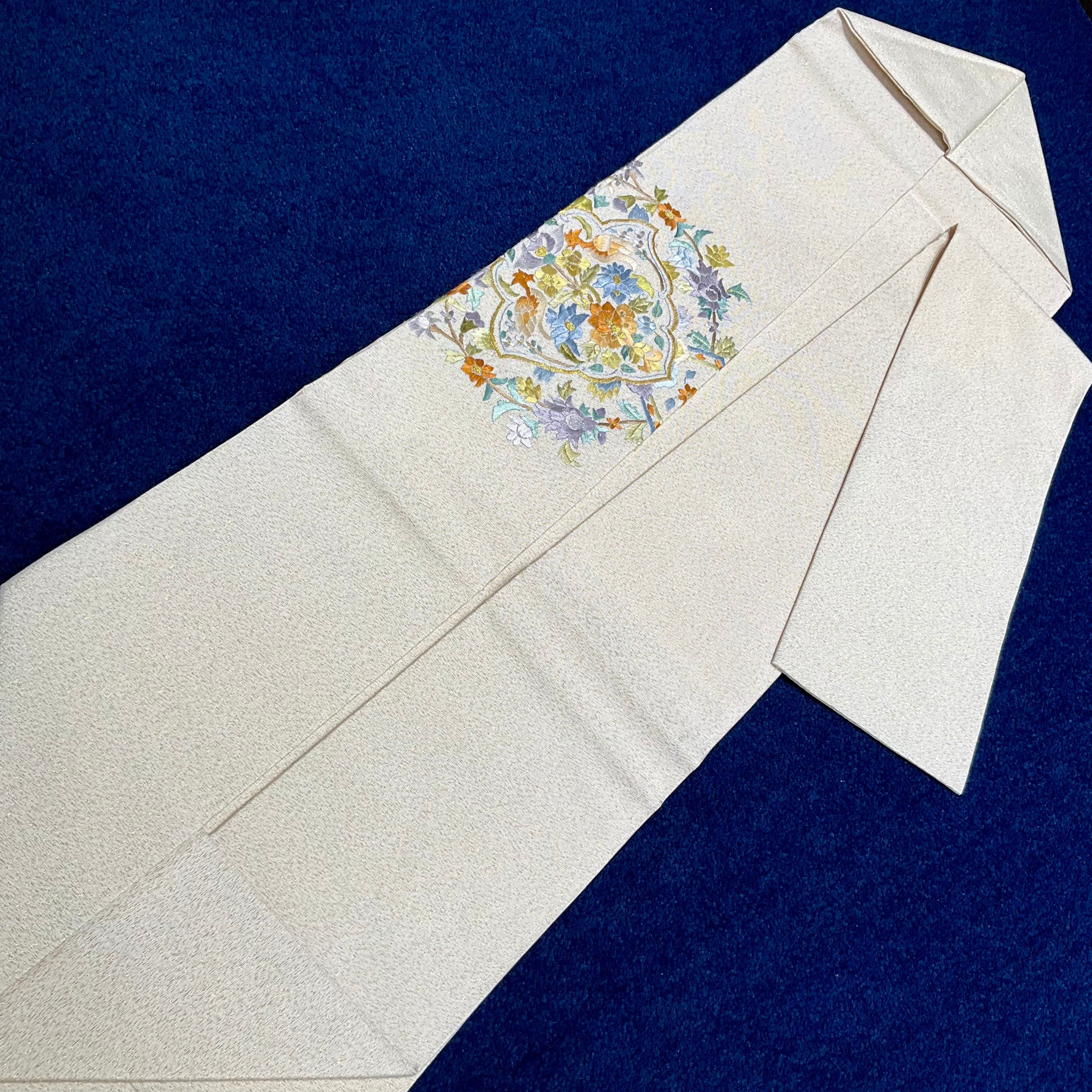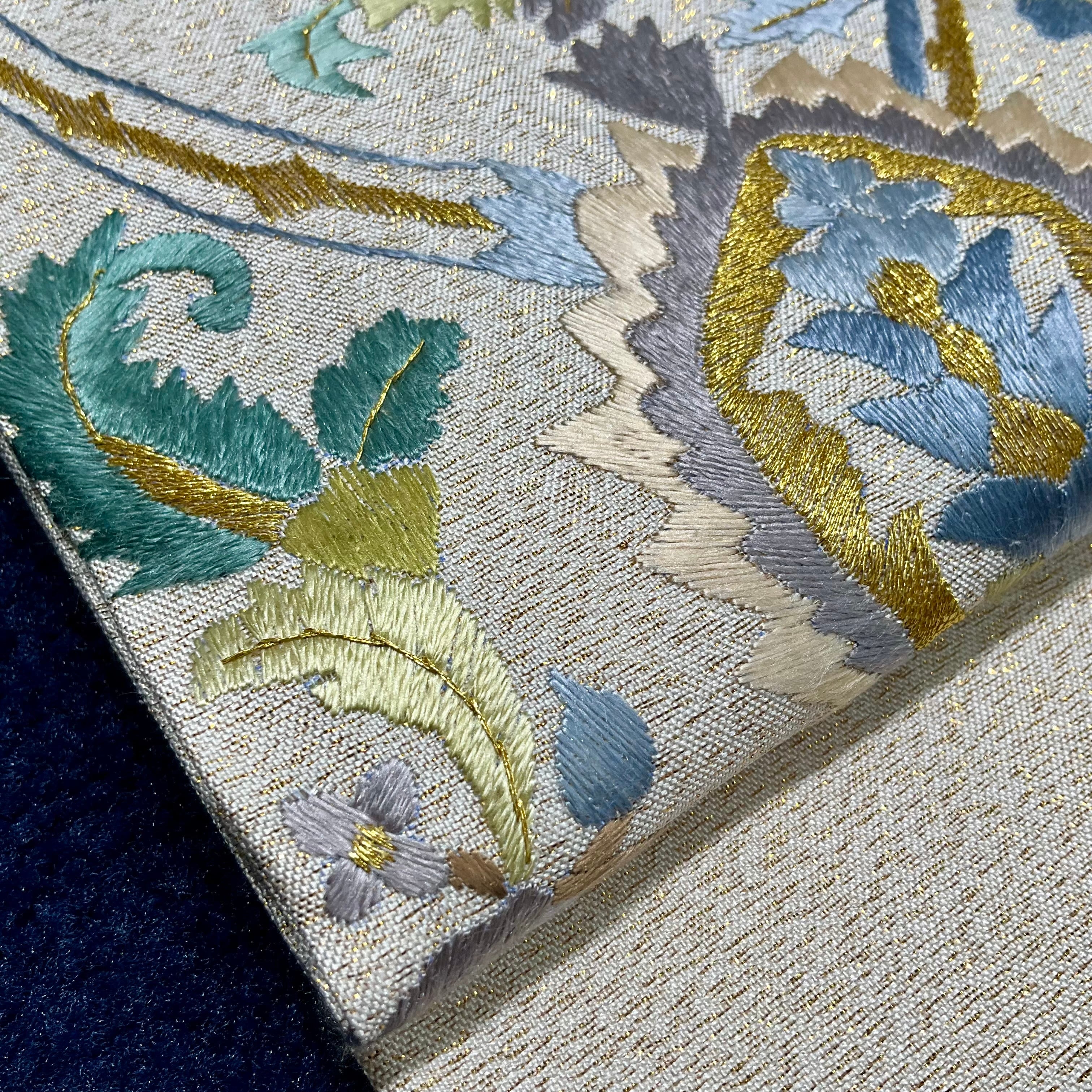 アイボリーの地色に金糸が細やかに織り込まれ、煌びやかな刺繍が目を惹く名古屋帯です