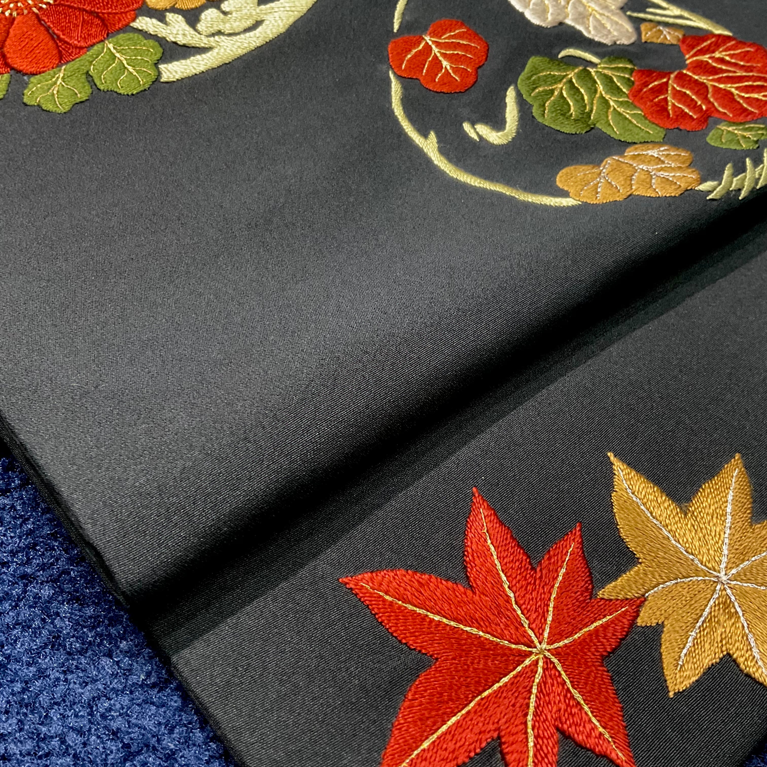黒地にもみじや菊の丸紋が刺繍されたアンティーク名古屋帯です