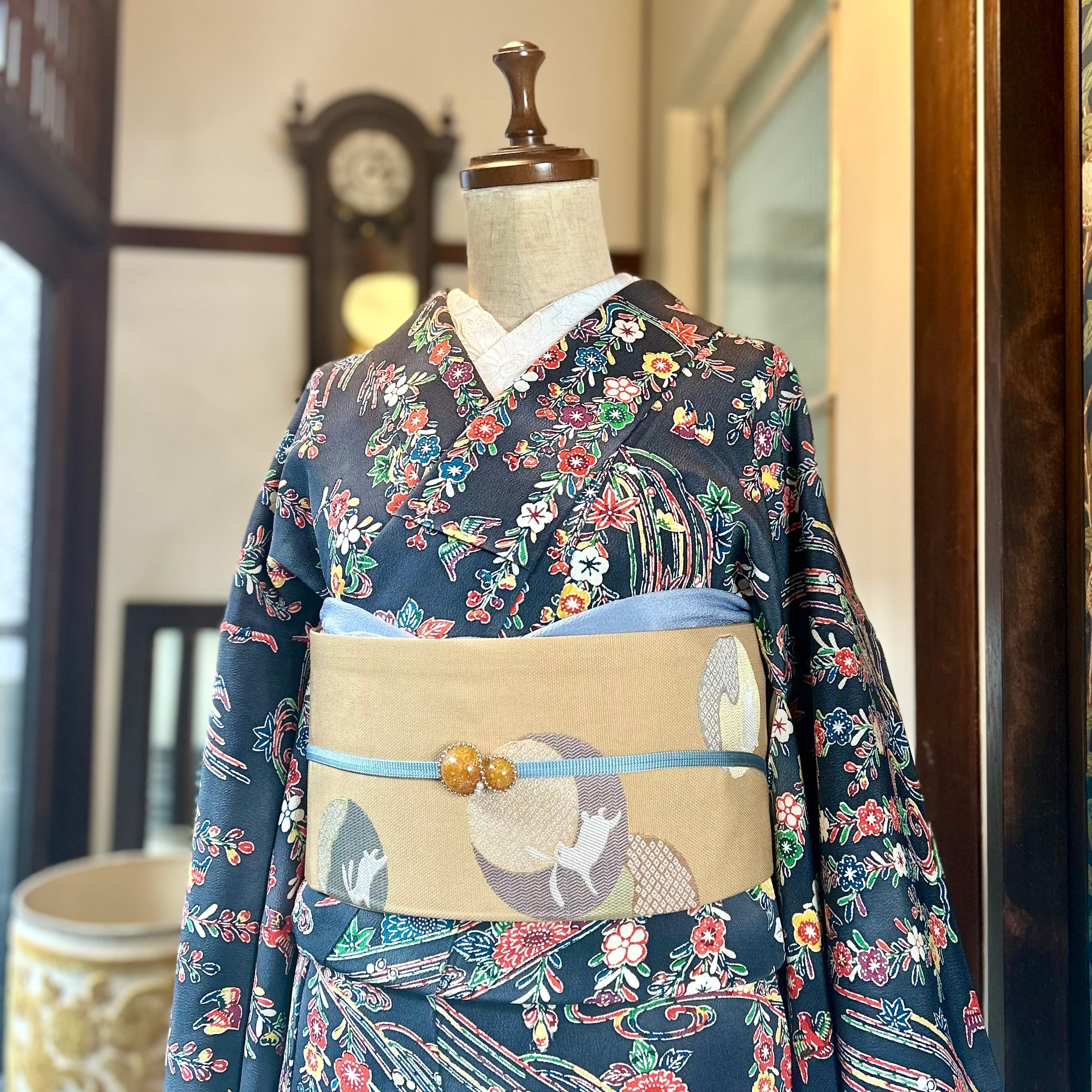 墨黒の地色に、色鮮やかに枝垂れ桜や鳥などが紅型調に描かれた付下げ小紋着物です