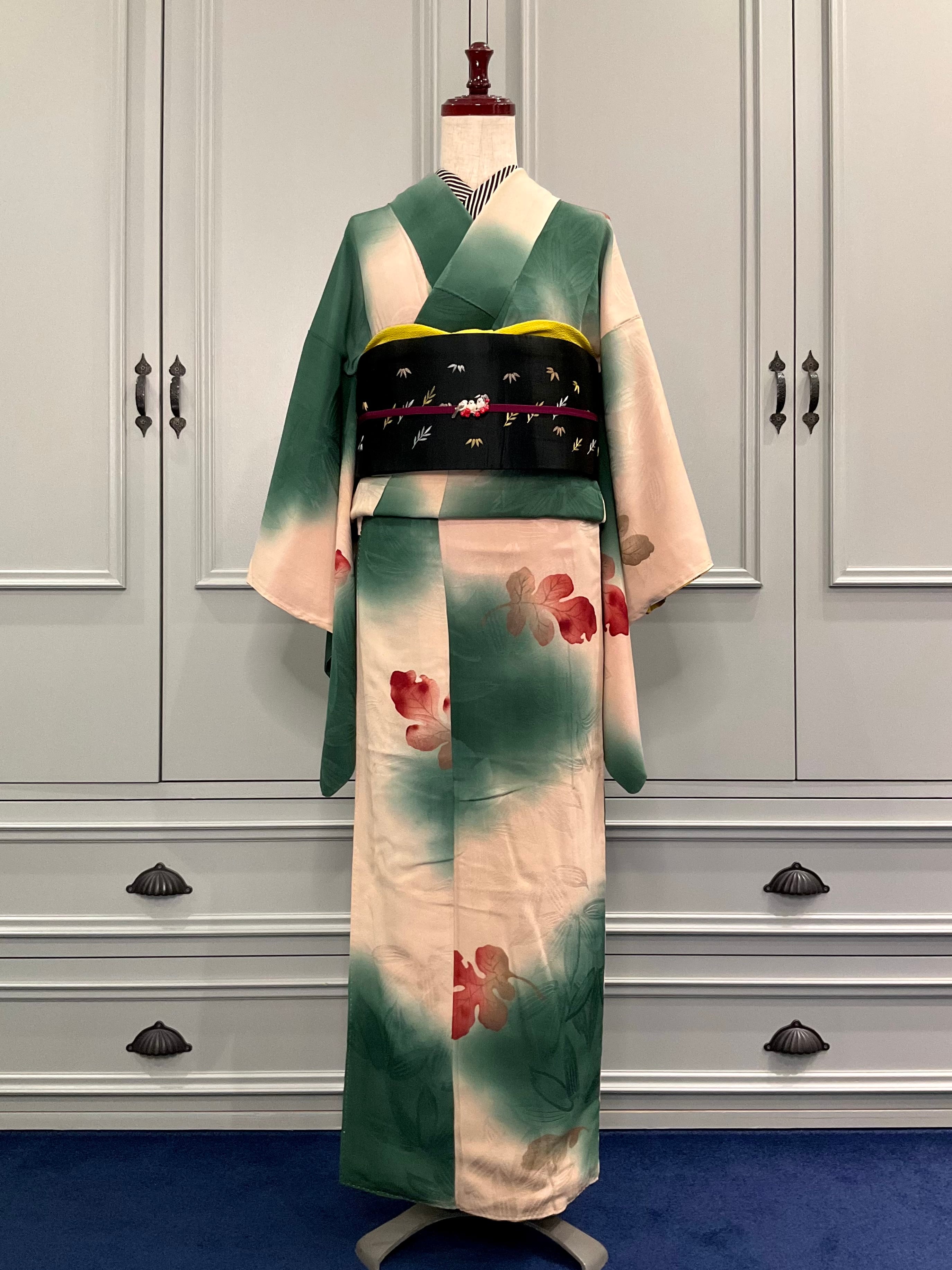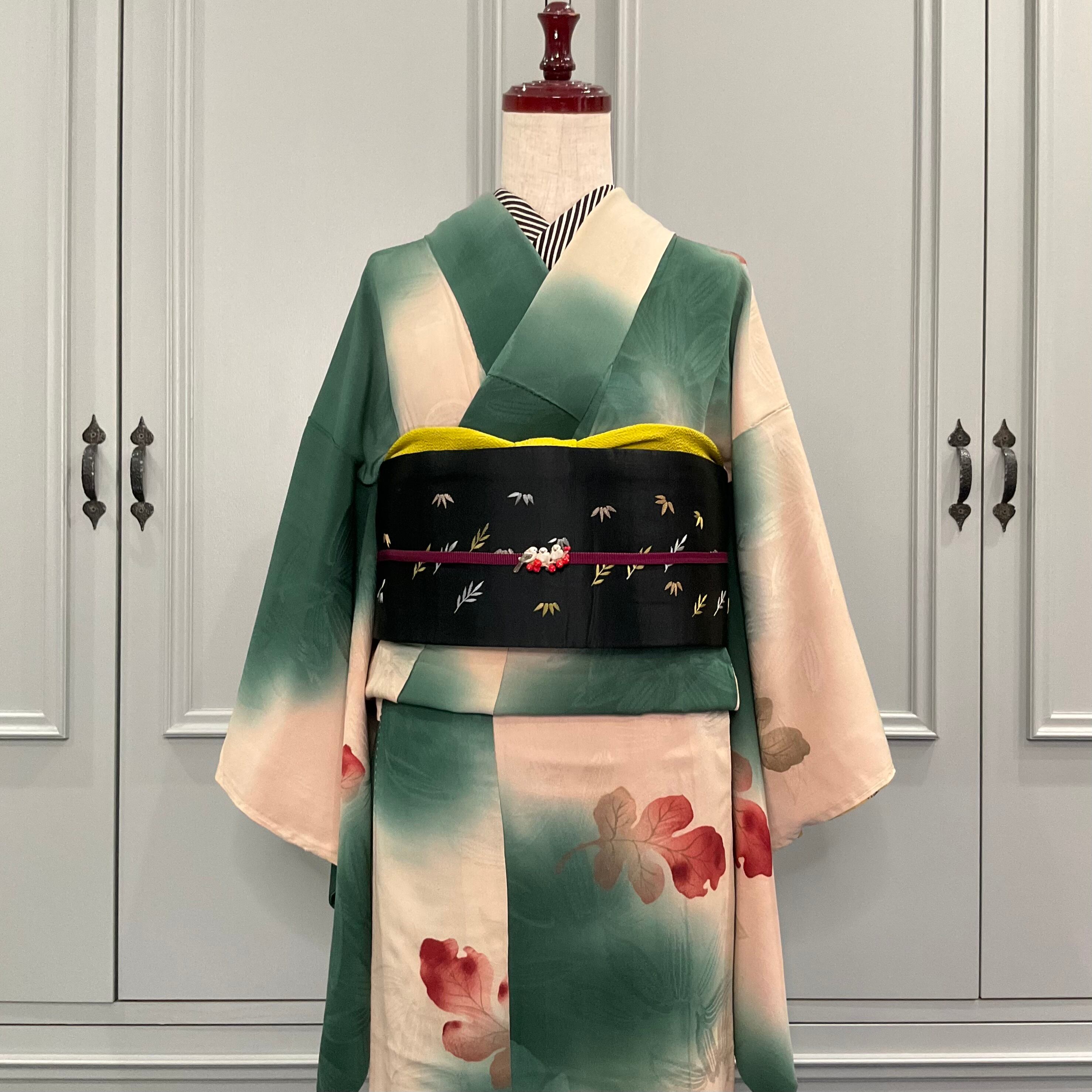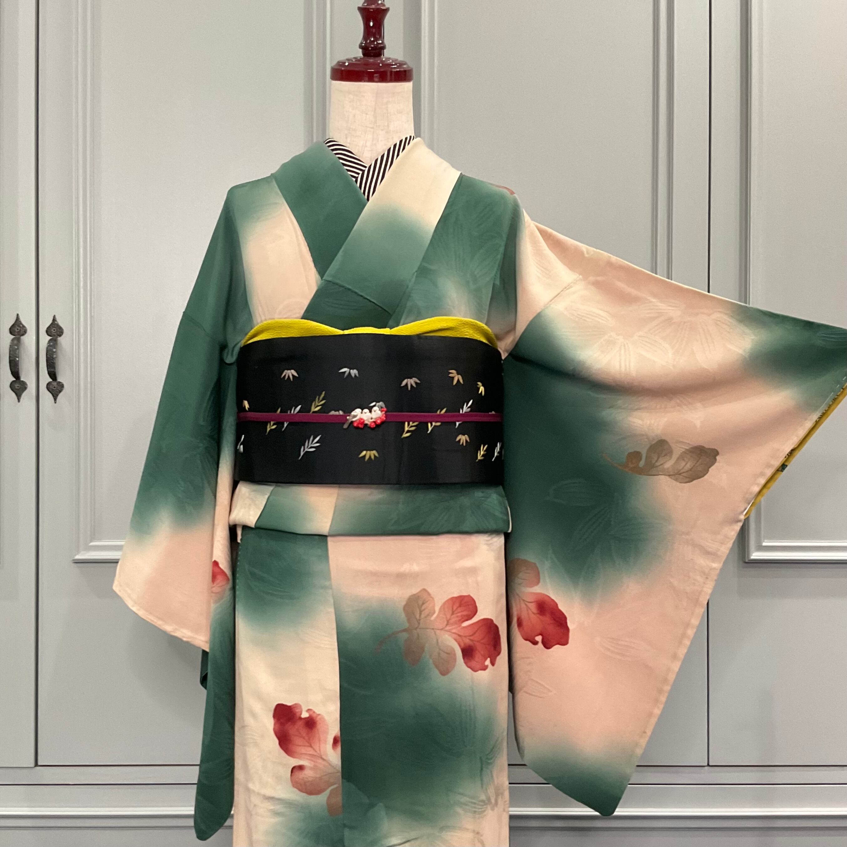 しっとりとした紅葉の風情をたっぷり感じる意匠とアンティークらしい色合い、たっぷりと揺れるお袖が、心揺らす1枚✨️
