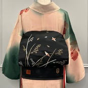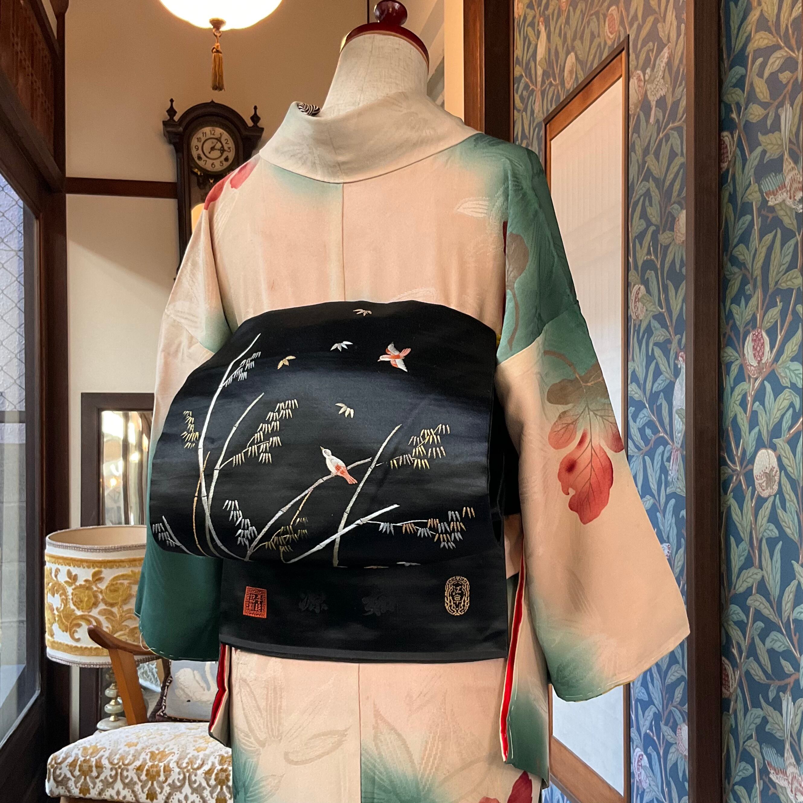 黒地に可愛らしい鳥と、風を感じるような竹やぶが哀愁漂う、アンティークの風情を感じる名古屋帯です✨