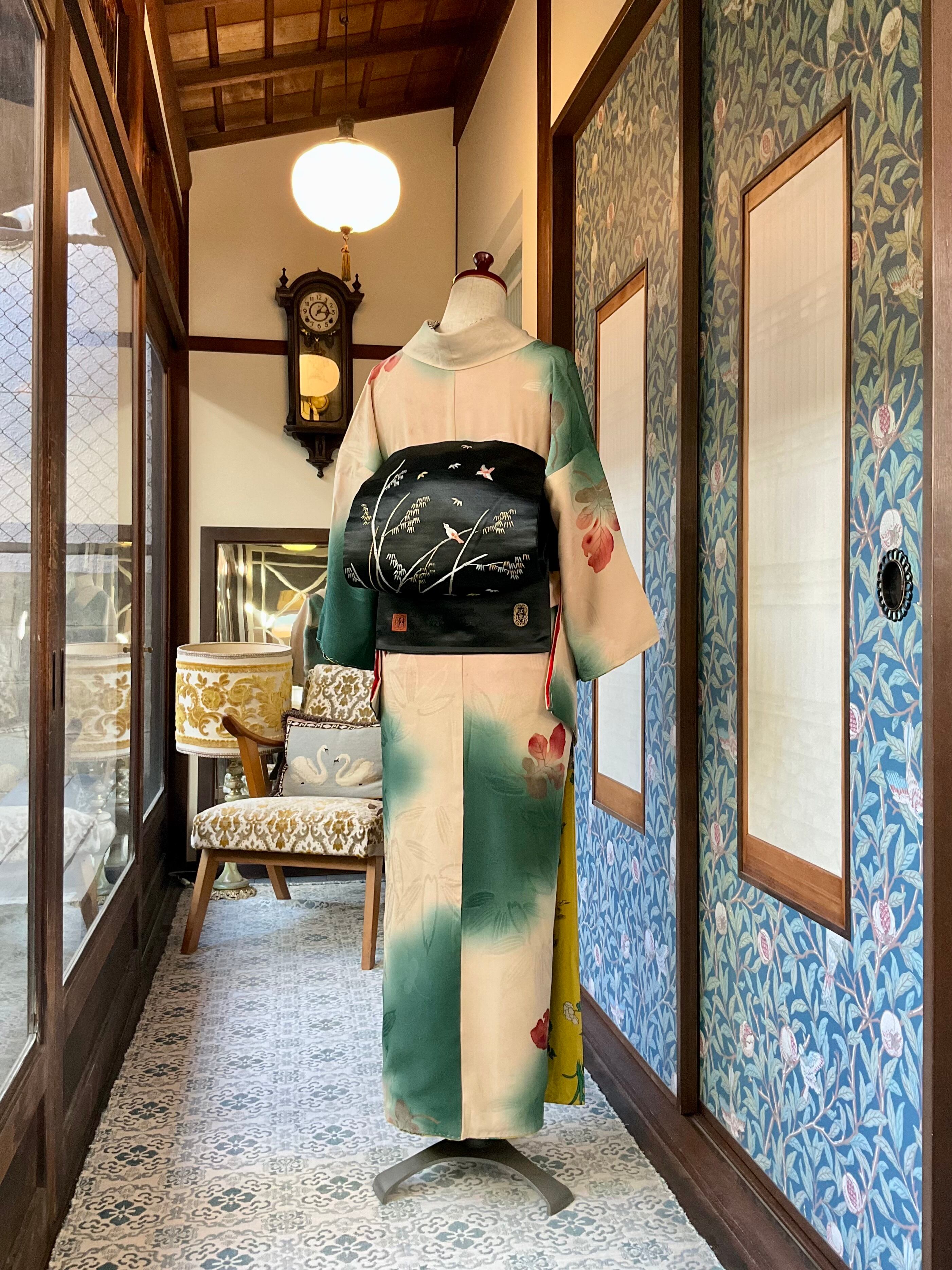 ○合わせたアンティーク着物、オリジナル帯揚げライムグリーン、オリジナル三分紐 リバーシブルライン プラム×ミントもweb shop掲載品です♪