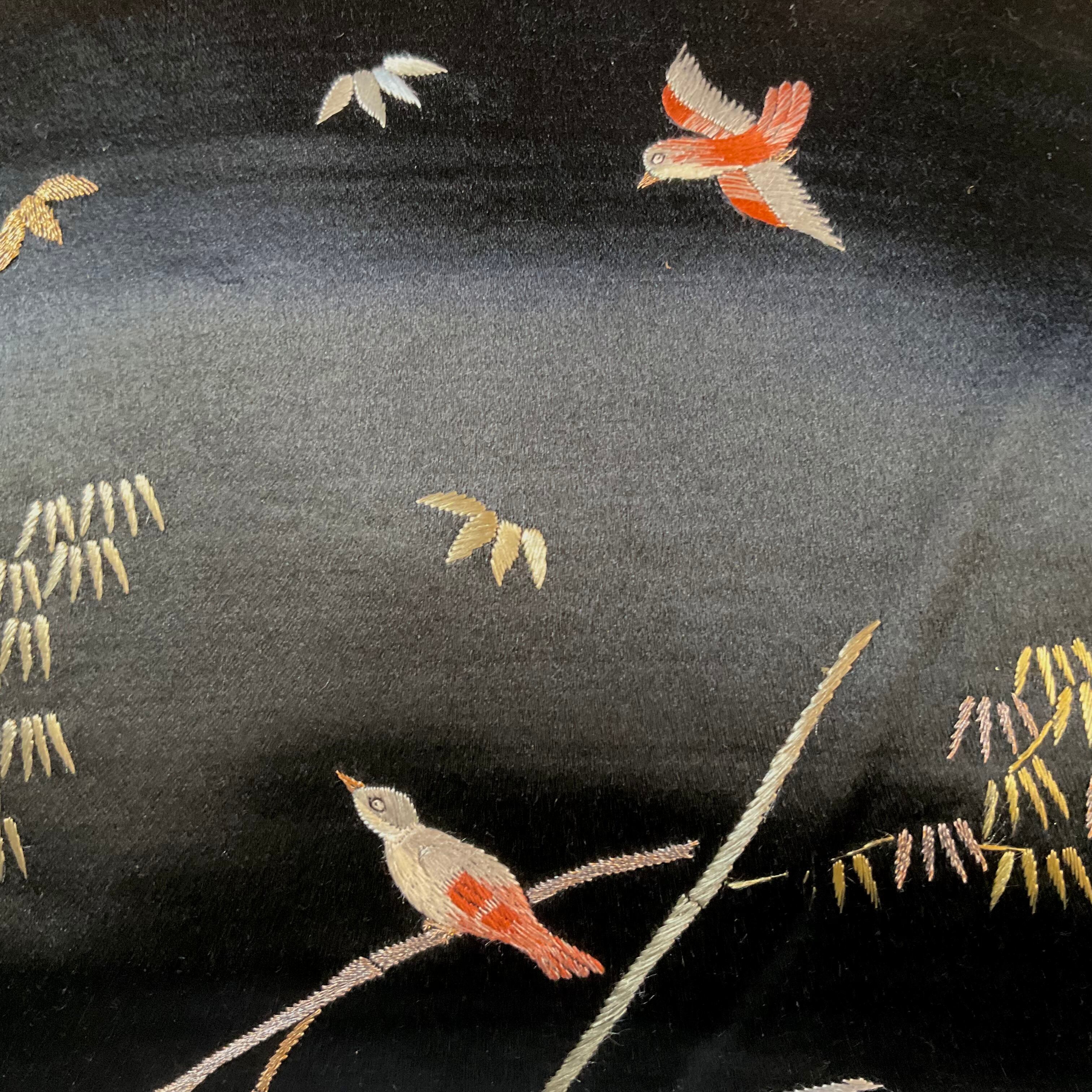 黒繻子地に竹と鳥が刺繍されたアンティーク名古屋帯です