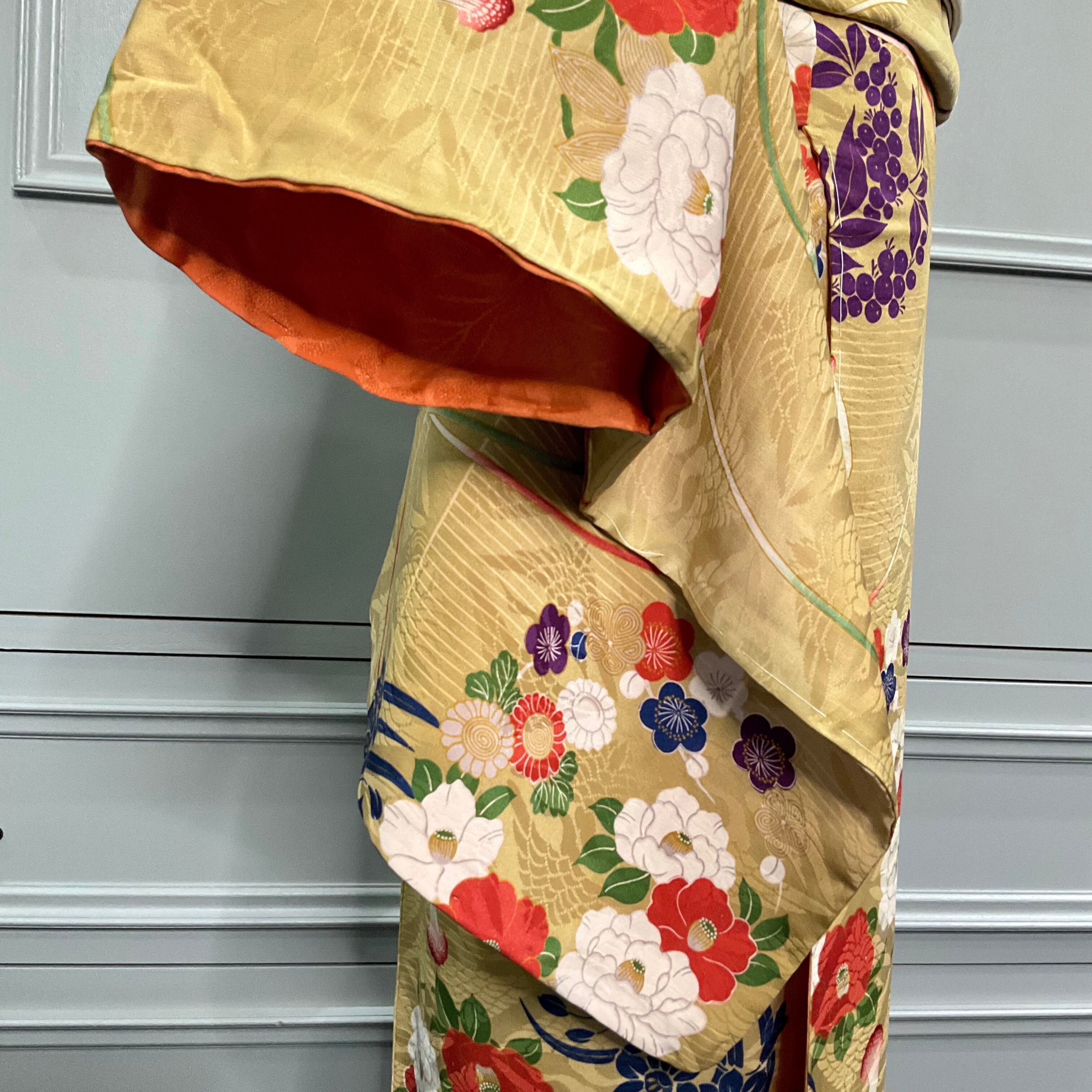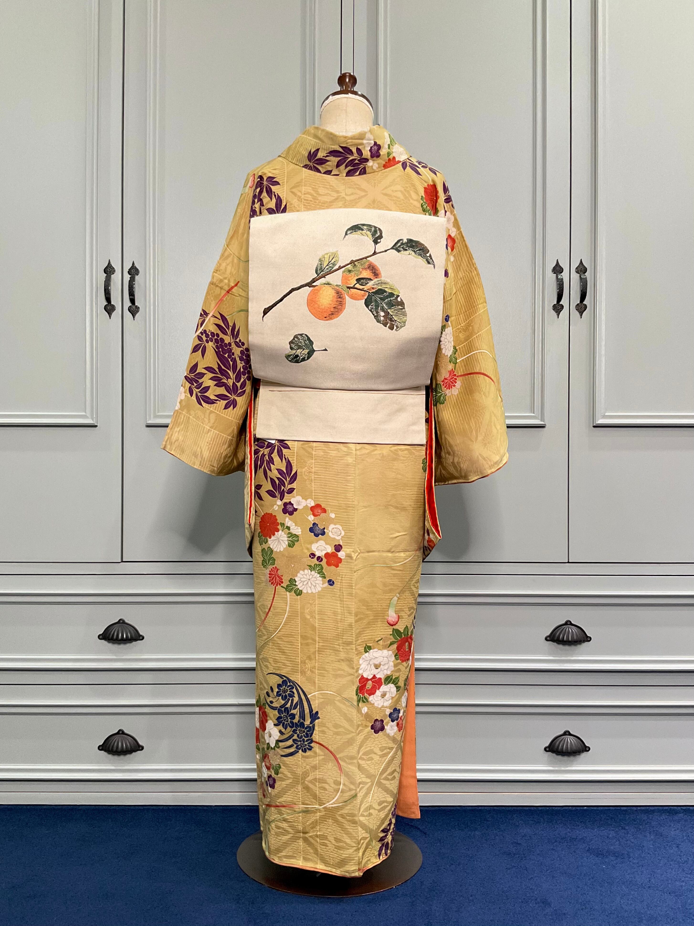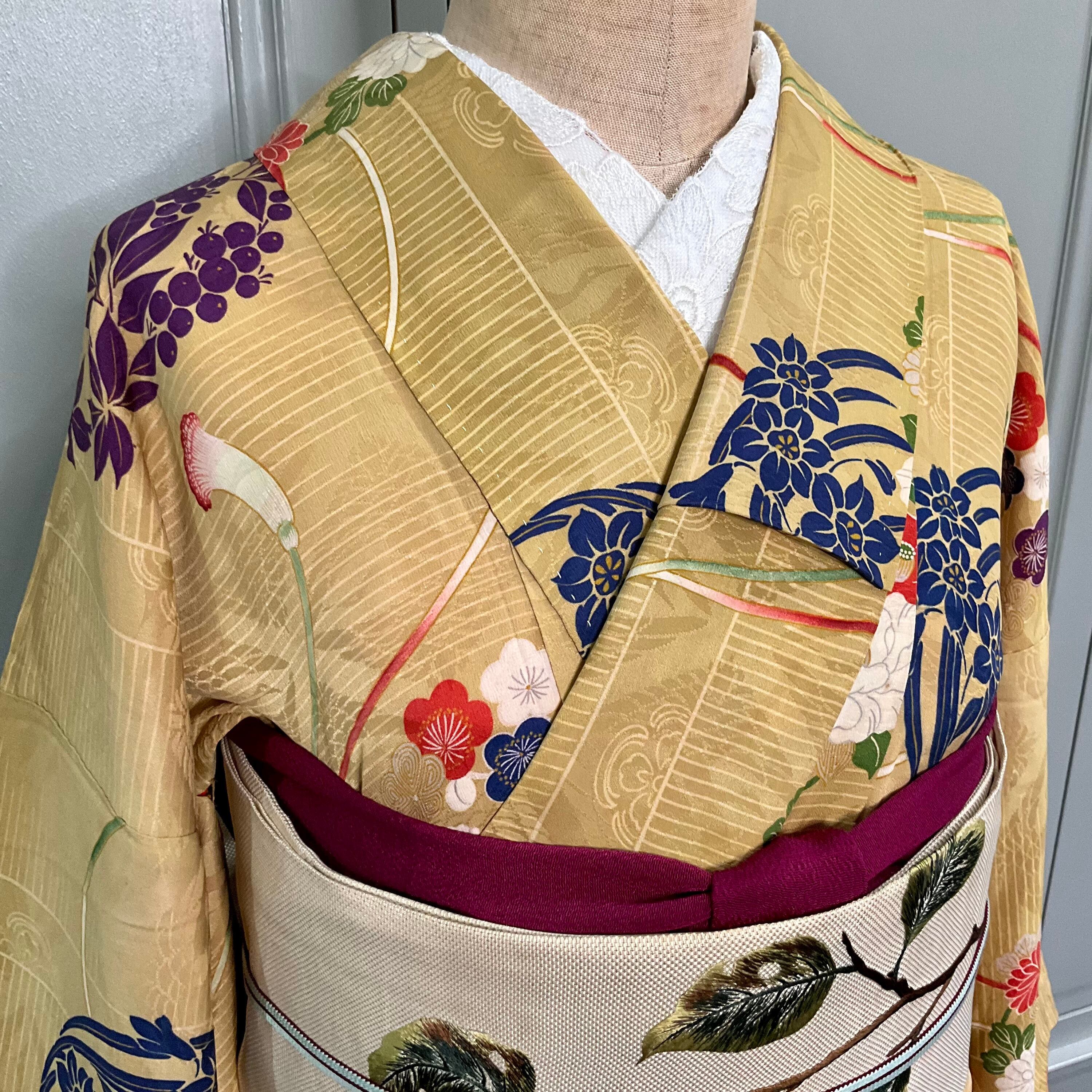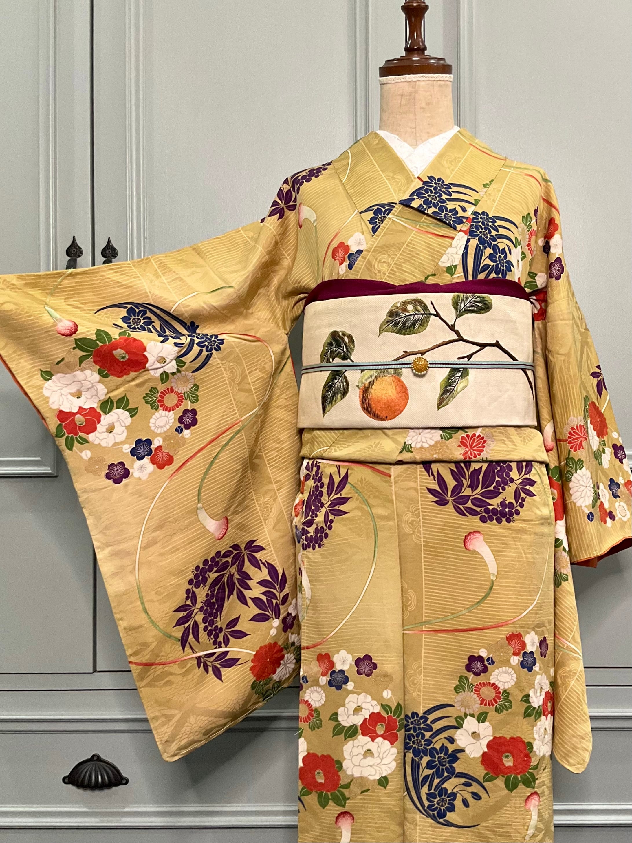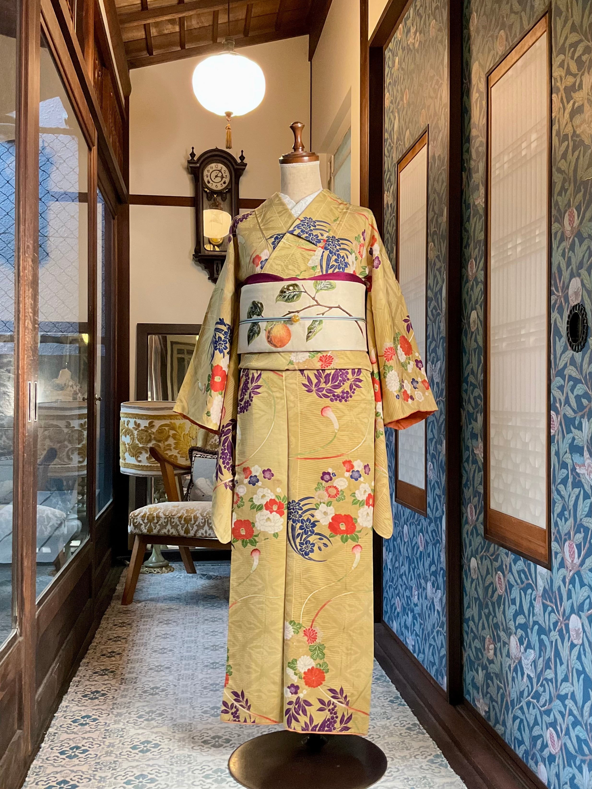 椿や南天、梅、菊などの秋から冬のお花が描かれ、大人っぽく上品な着こなしや羽織を合わせたアンティークらしい着こなしが似合います