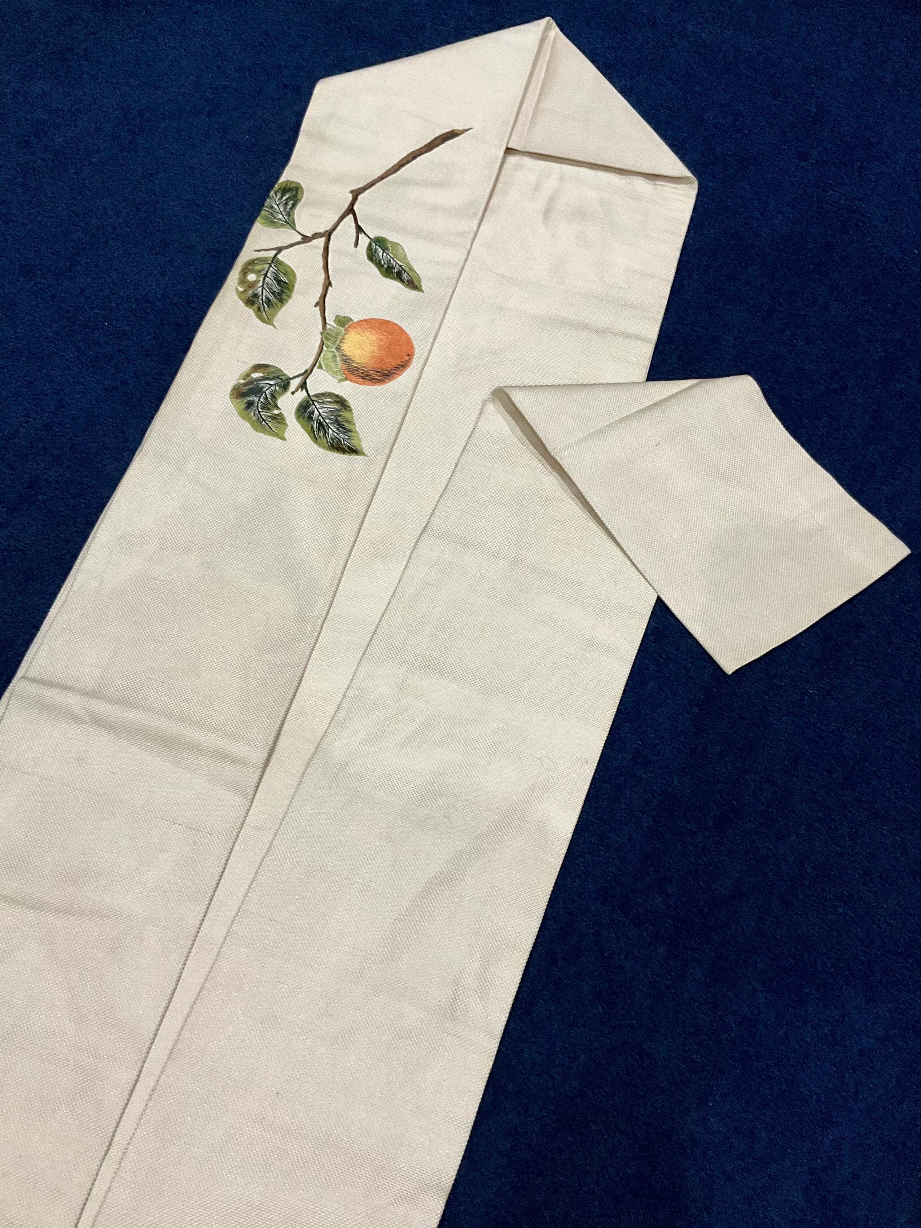 アイボリー地に柿が刺繍されたリサイクル名古屋帯です