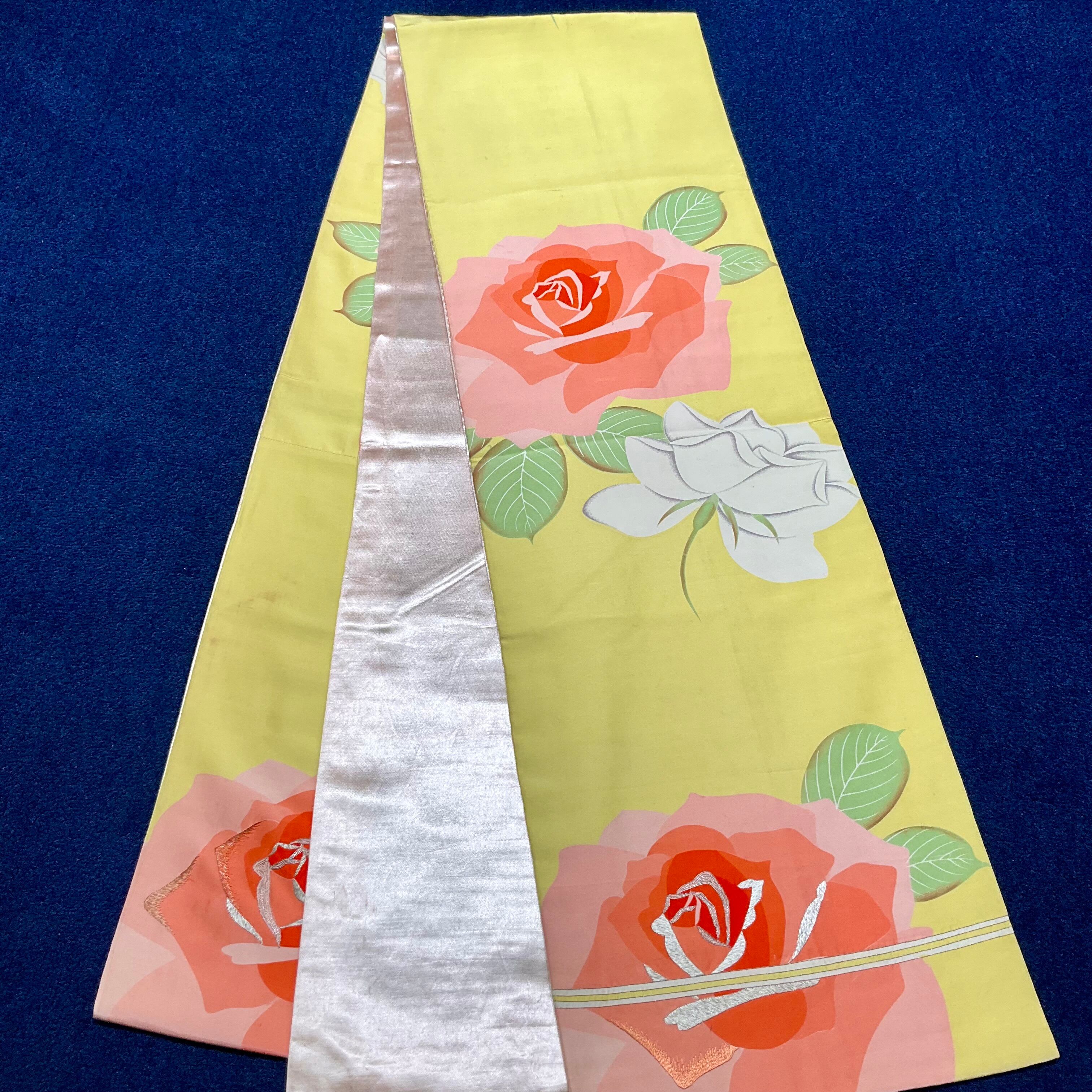 イエロー系の地色にバラが大胆にデザインされたお洒落なアンティーク昼夜帯です