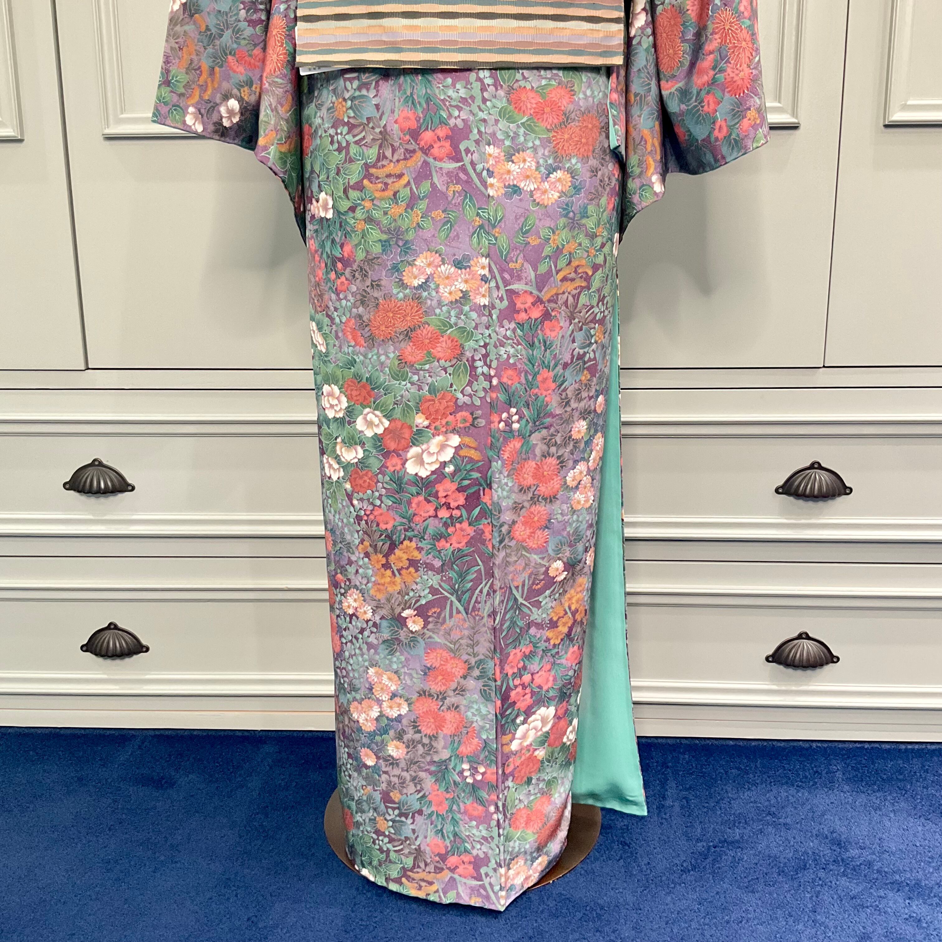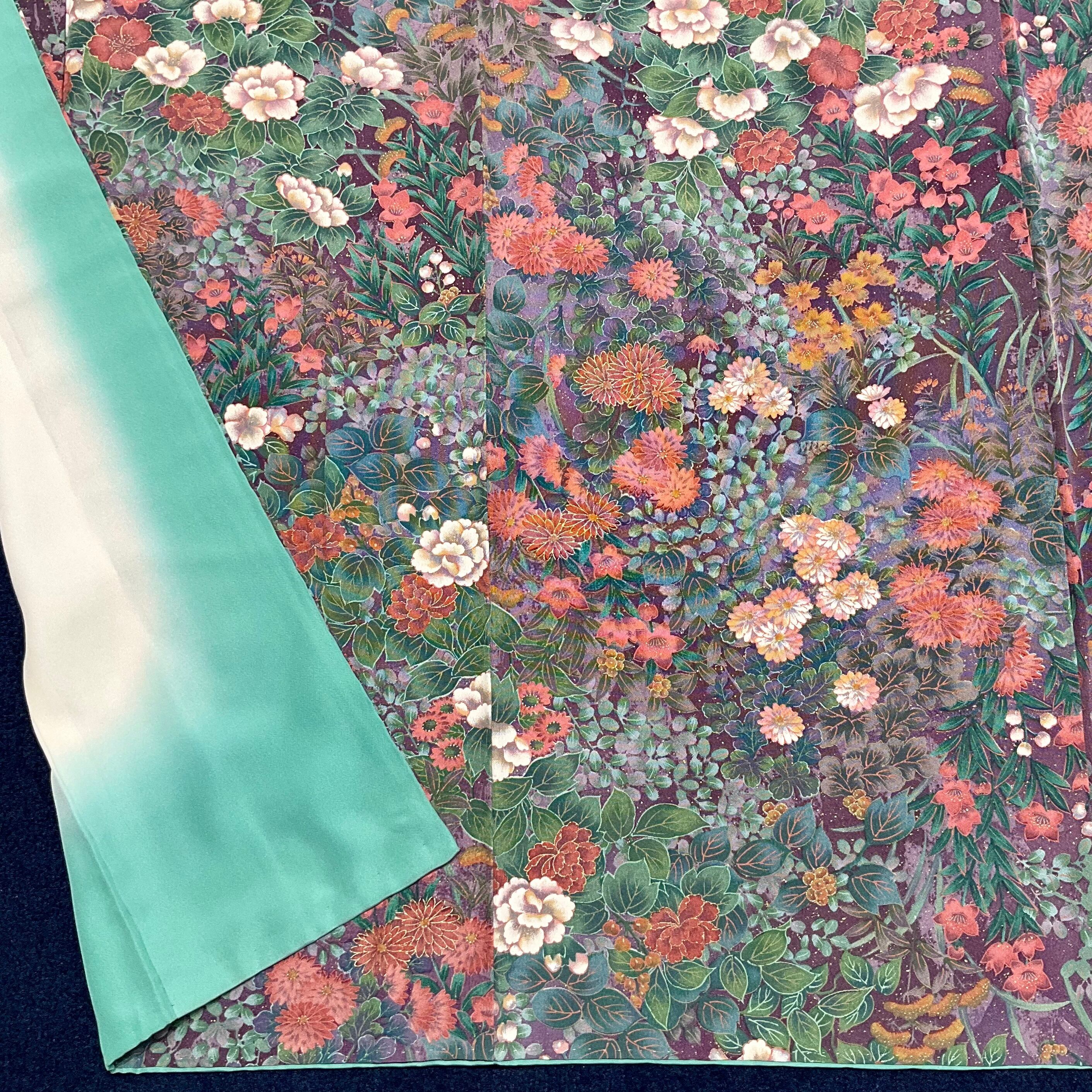 紫紺の地色に様々な花が美しく咲き乱れる小紋着物です