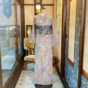 パープルやブルー、イエローなどのペールトーンカラーのグラデーションが華やかな小紋着物です