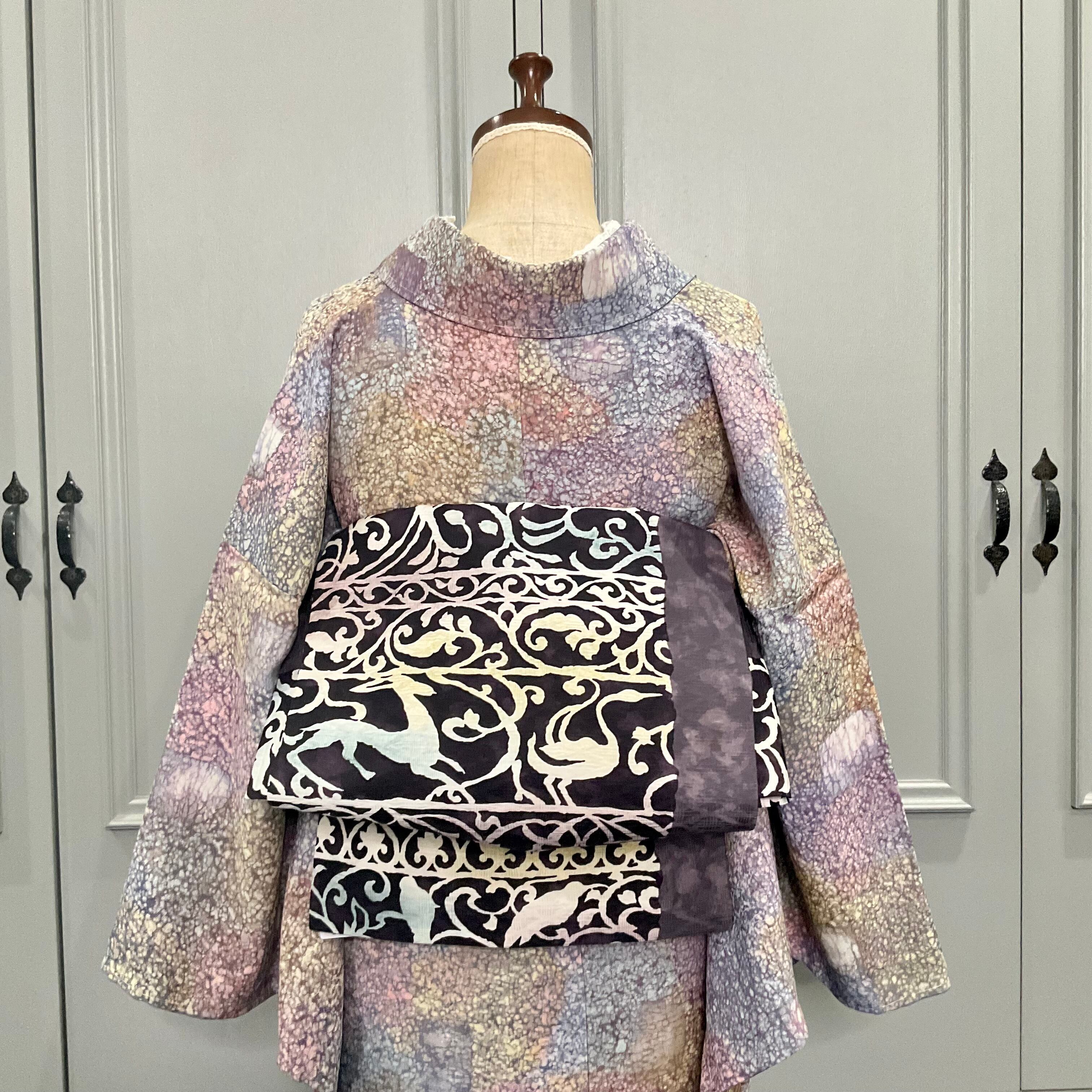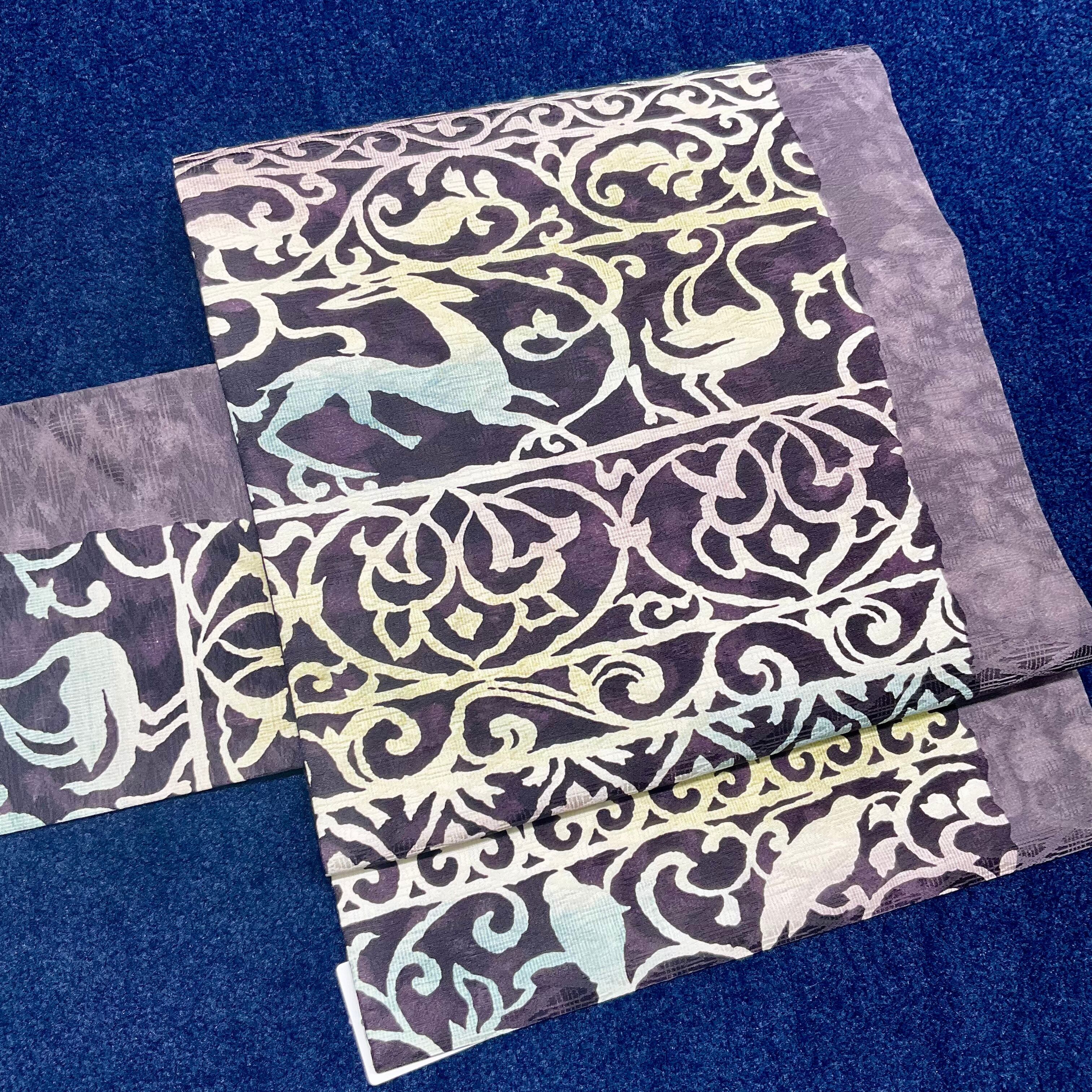 アール・ヌーヴォー調で鳥や鹿のような動物が影絵のように描かれたこちらの名古屋帯