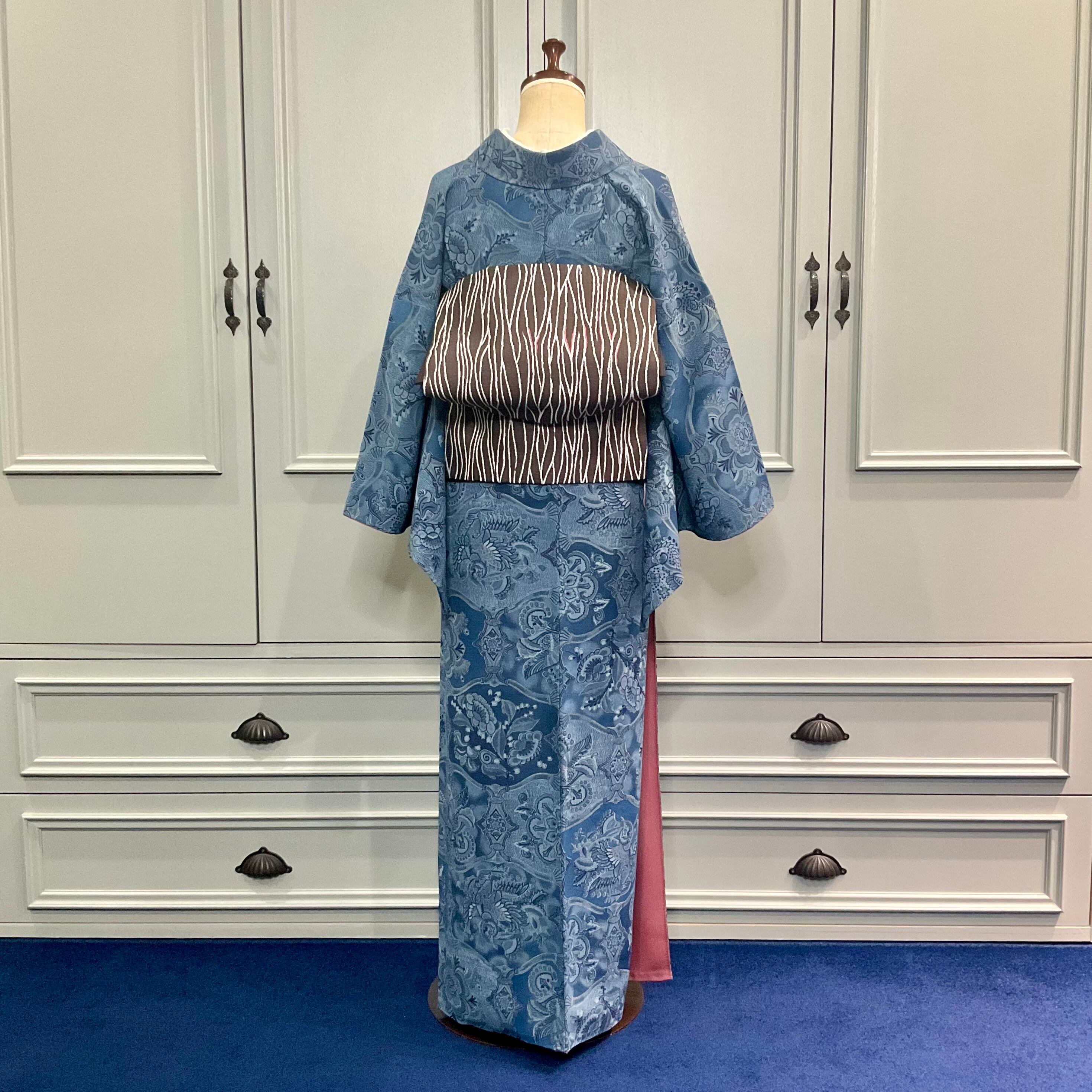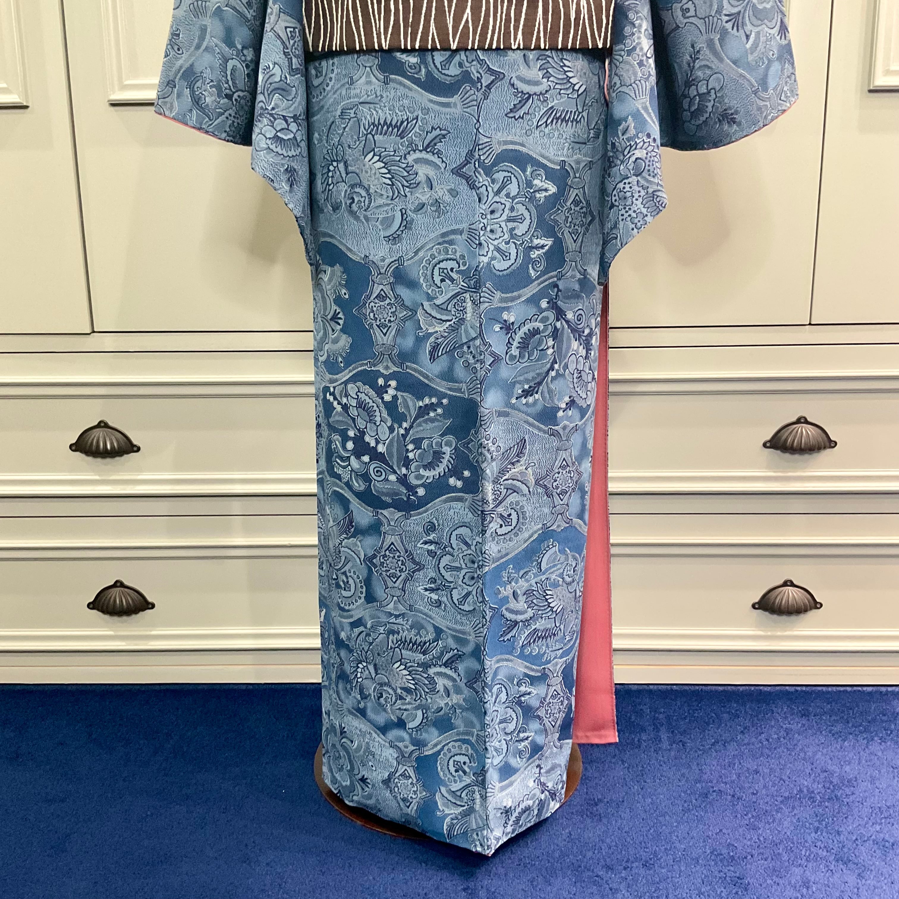victorian tile*アール・ヌーヴォー 縮緬 ちりめん ブルーグレー 小紋着物 A879