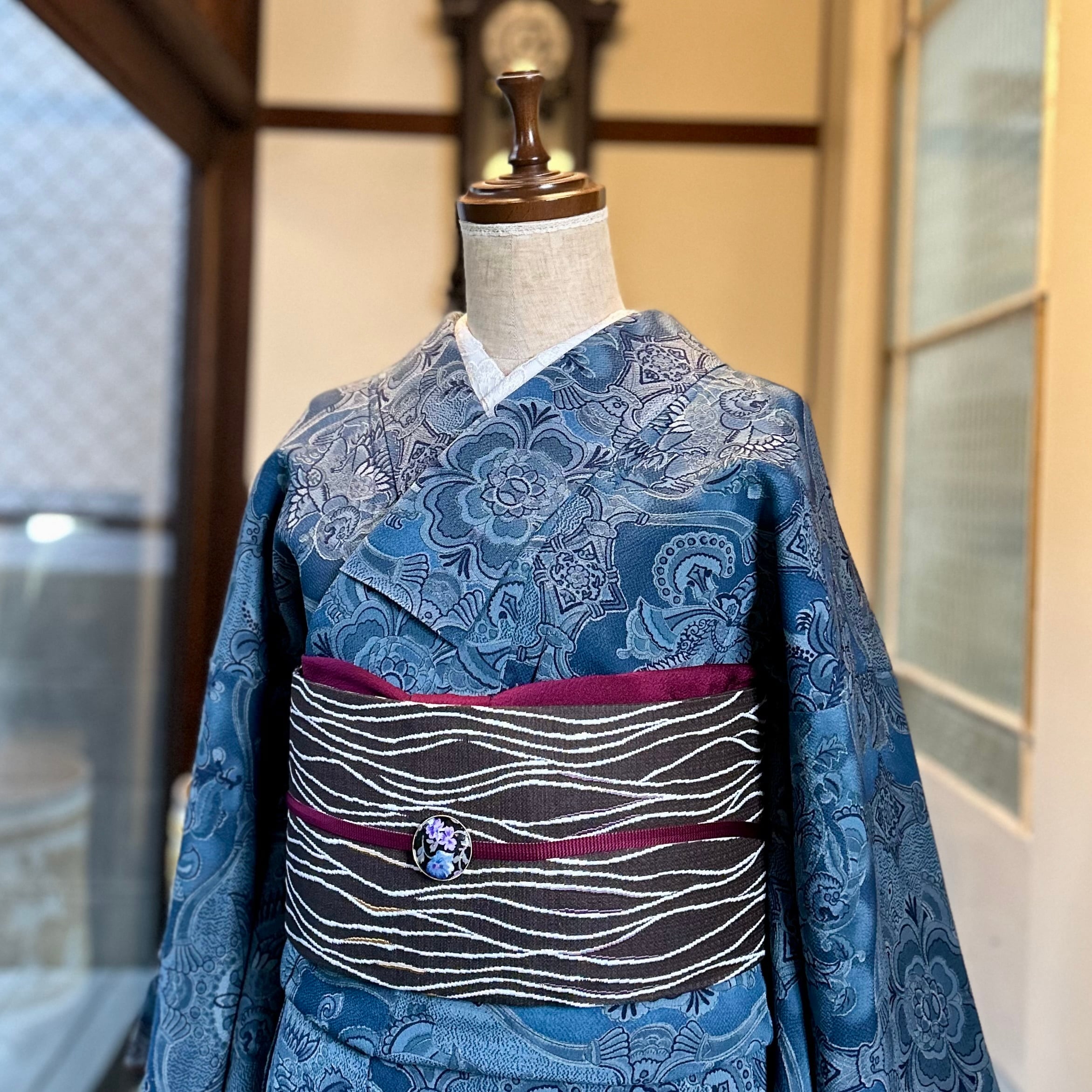 ブルーグレー系のちりめん地に西洋のタイルのようなアール・ヌーヴォー調の花や装飾模様が美しい小紋です