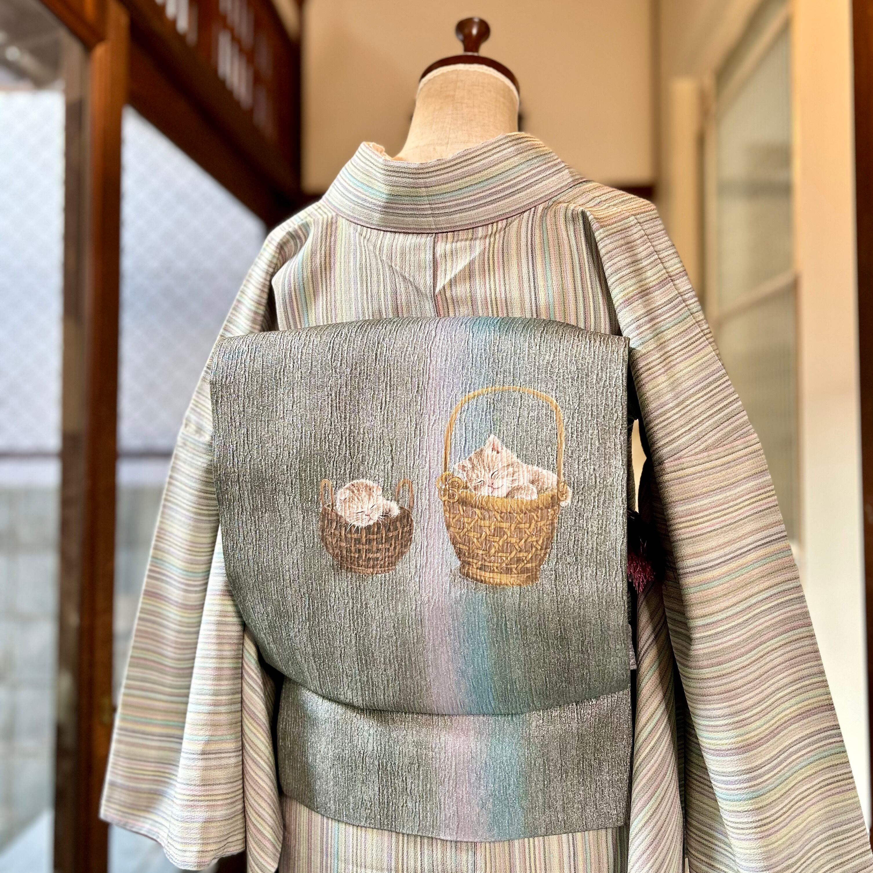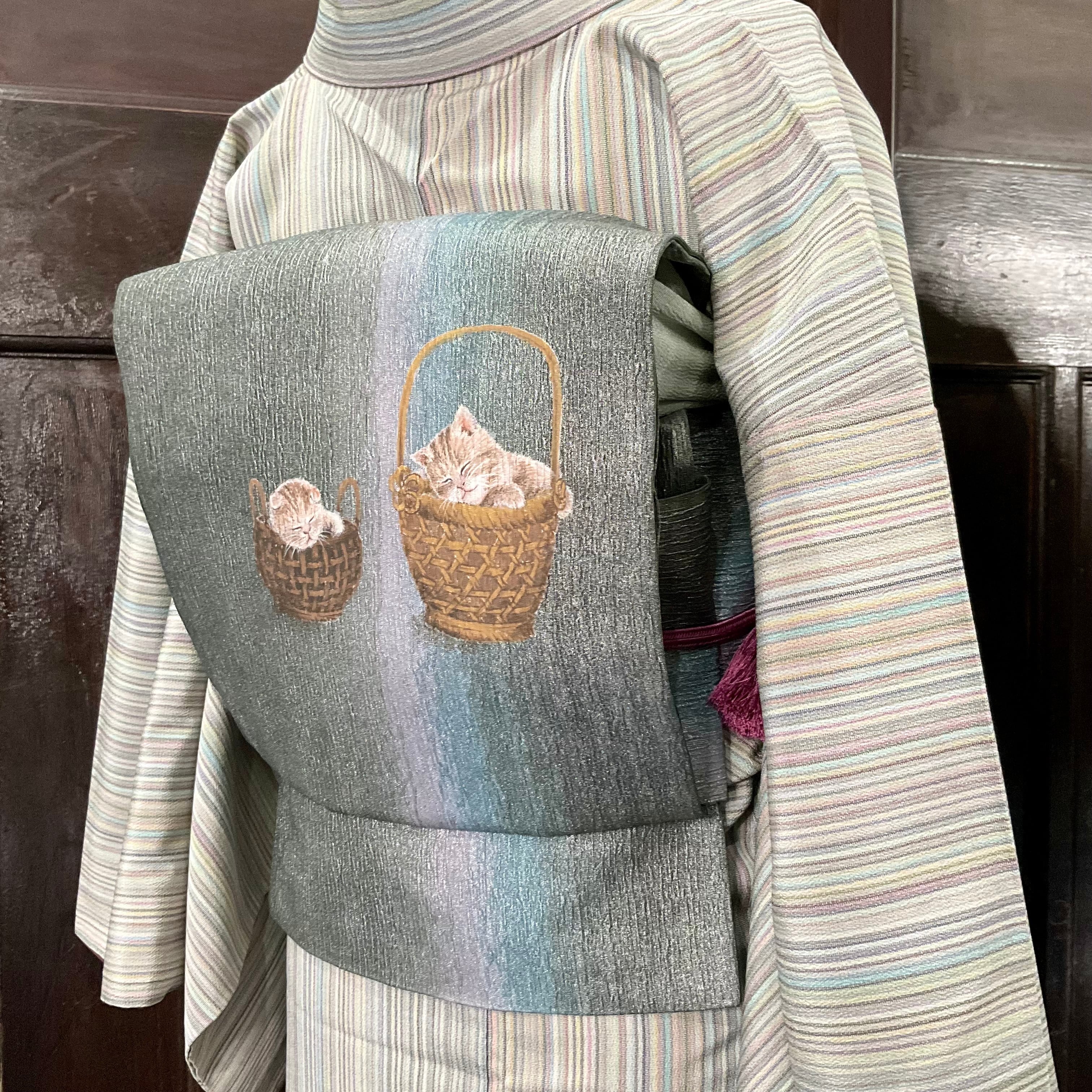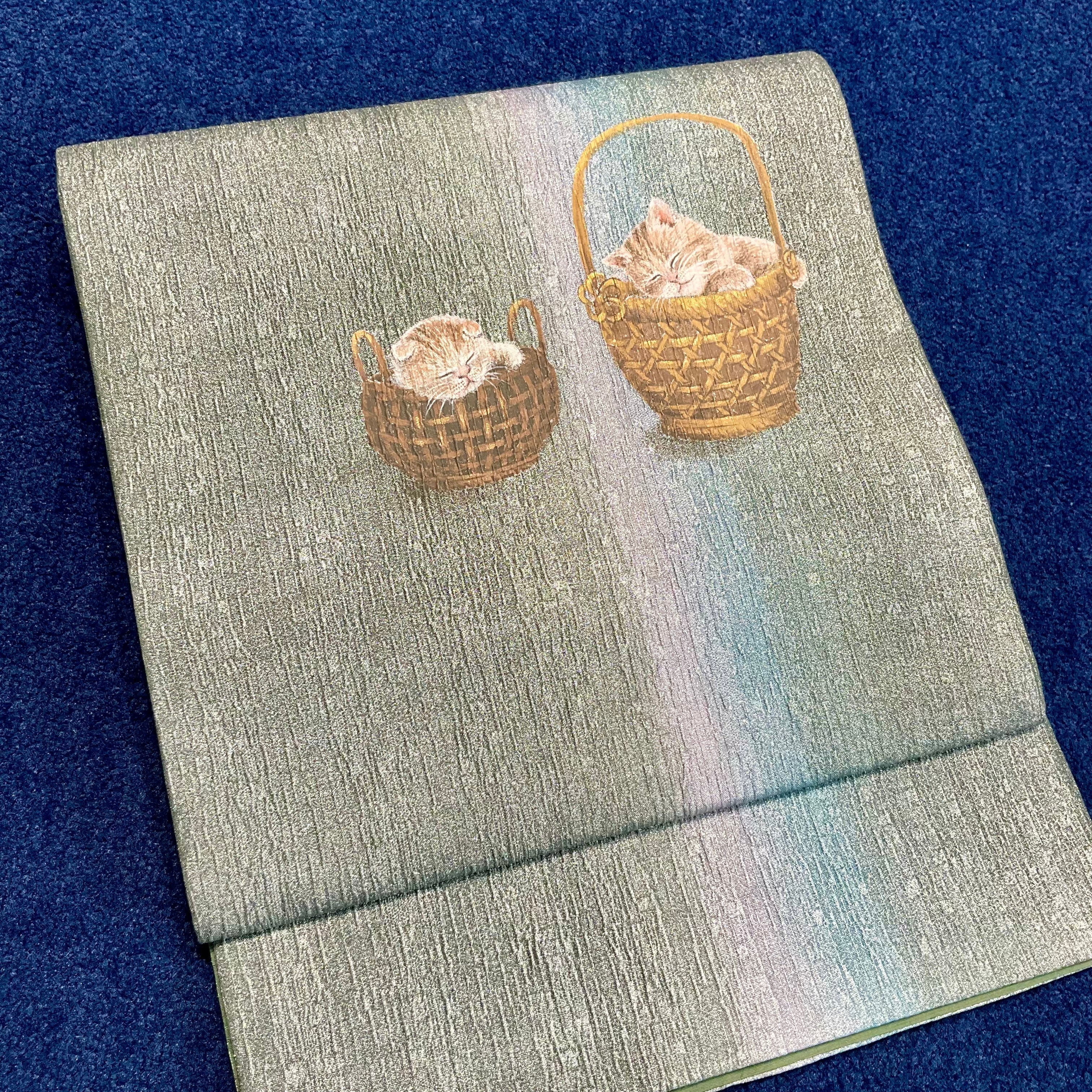 オリーブグリーンの地色にカゴで眠る猫ちゃんが愛らしい洒落袋帯です