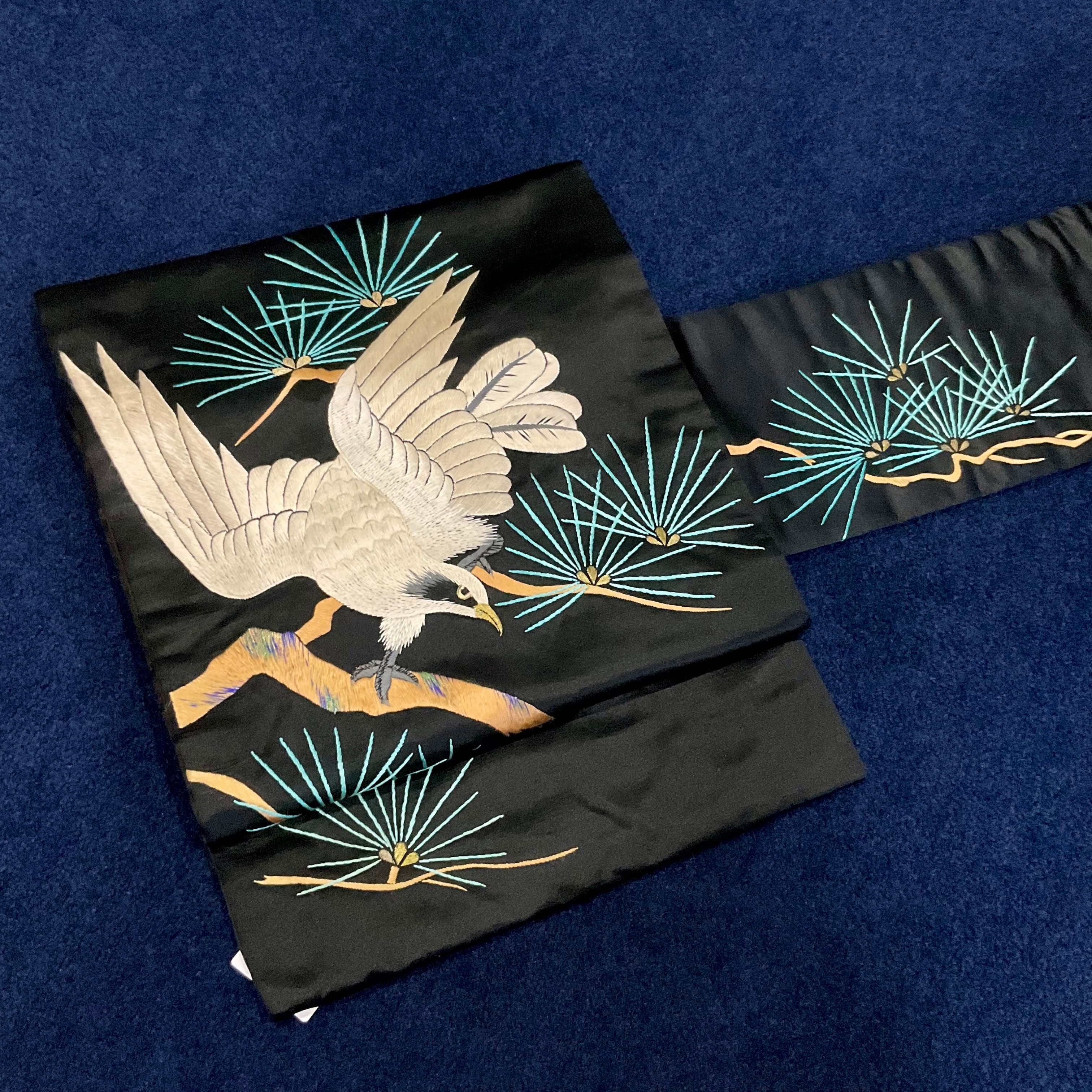 白鷹と松*鳥 刺繍 繻子 黒 アンティーク名古屋帯 A890