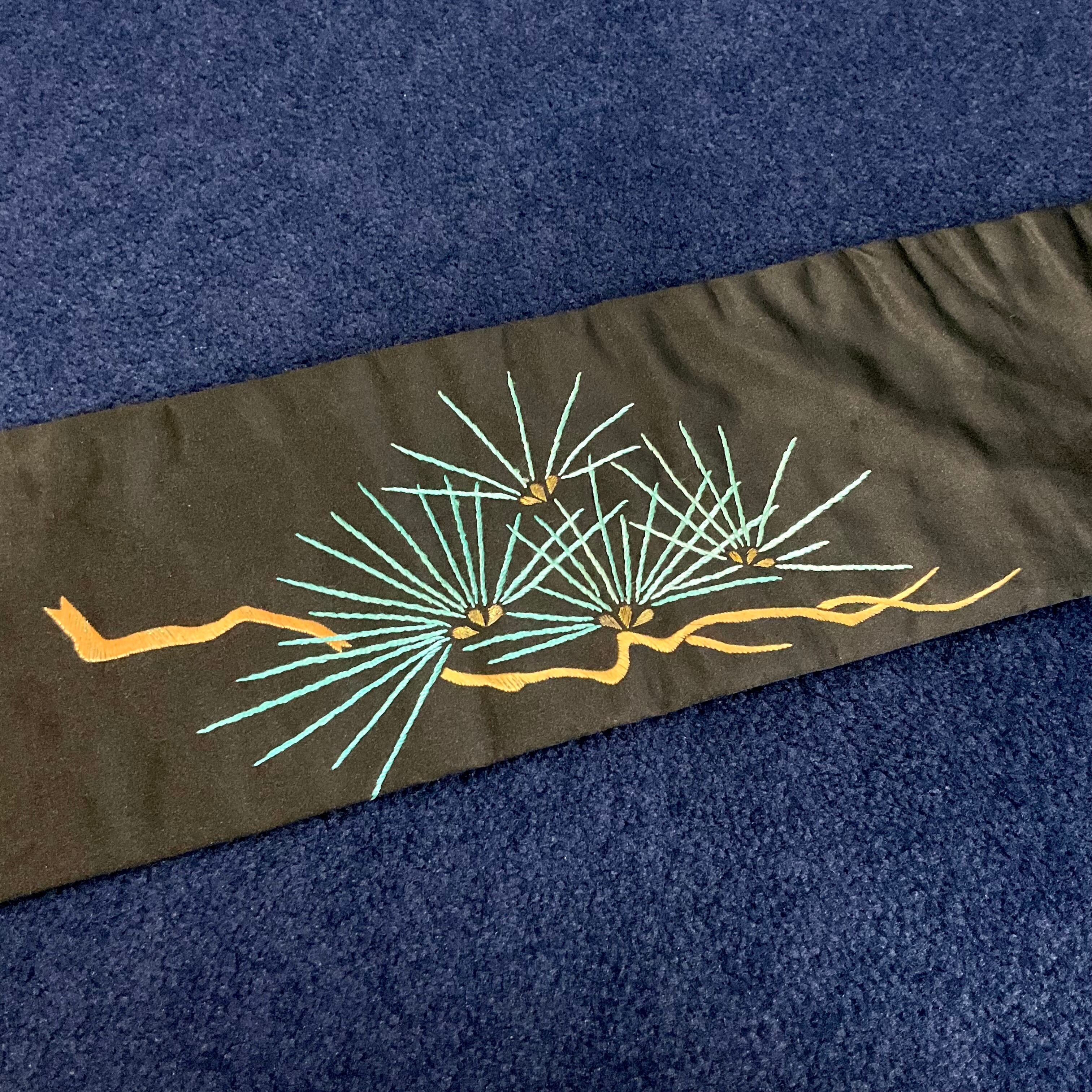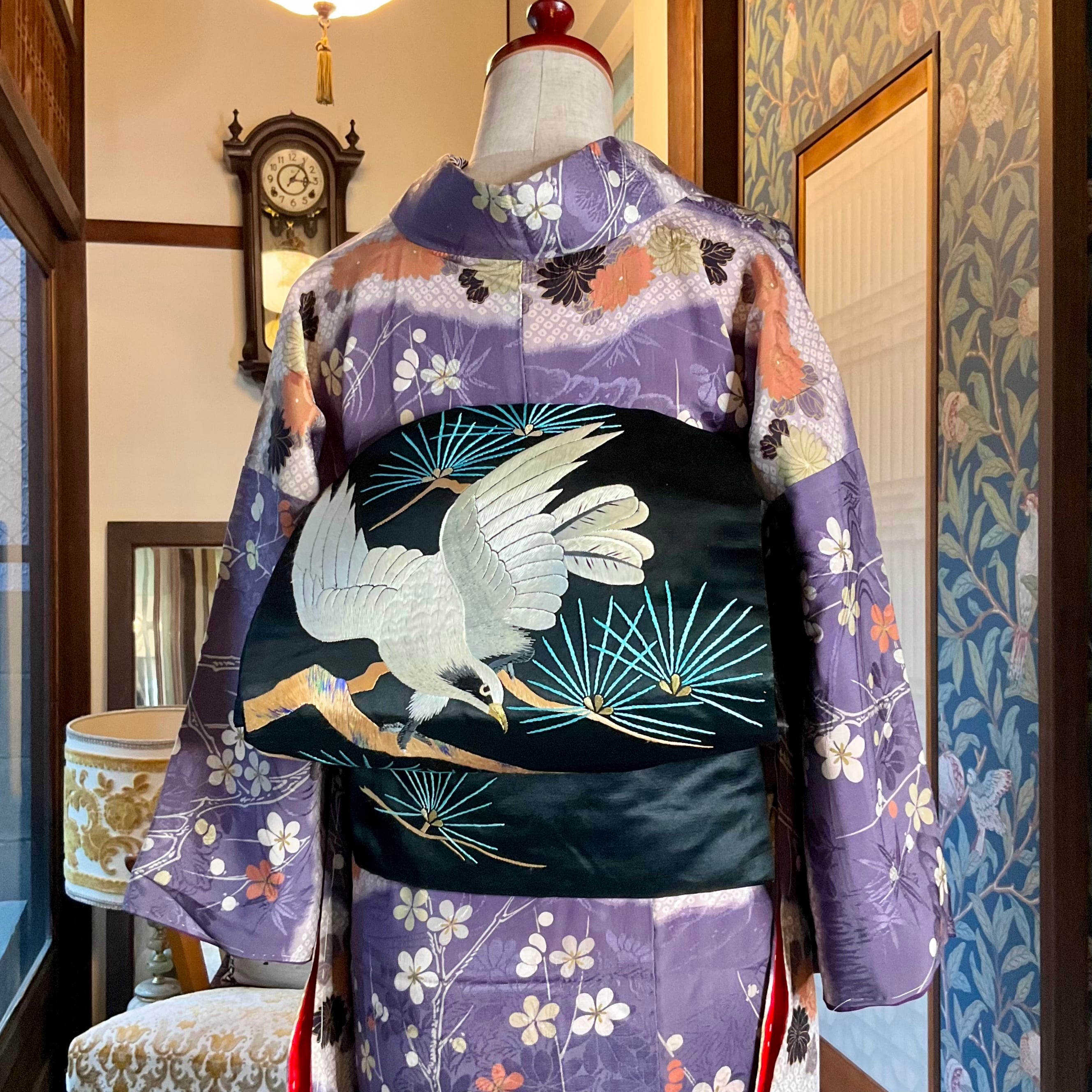 黒繻子地に、白鷹と松の刺繍がクールなアンティーク名古屋帯です