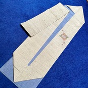 モスグレイ×ブルーグレイの色味の近い2色で彩られた地色に、抽象的な模様が相良刺繍であしらわれた名古屋帯です