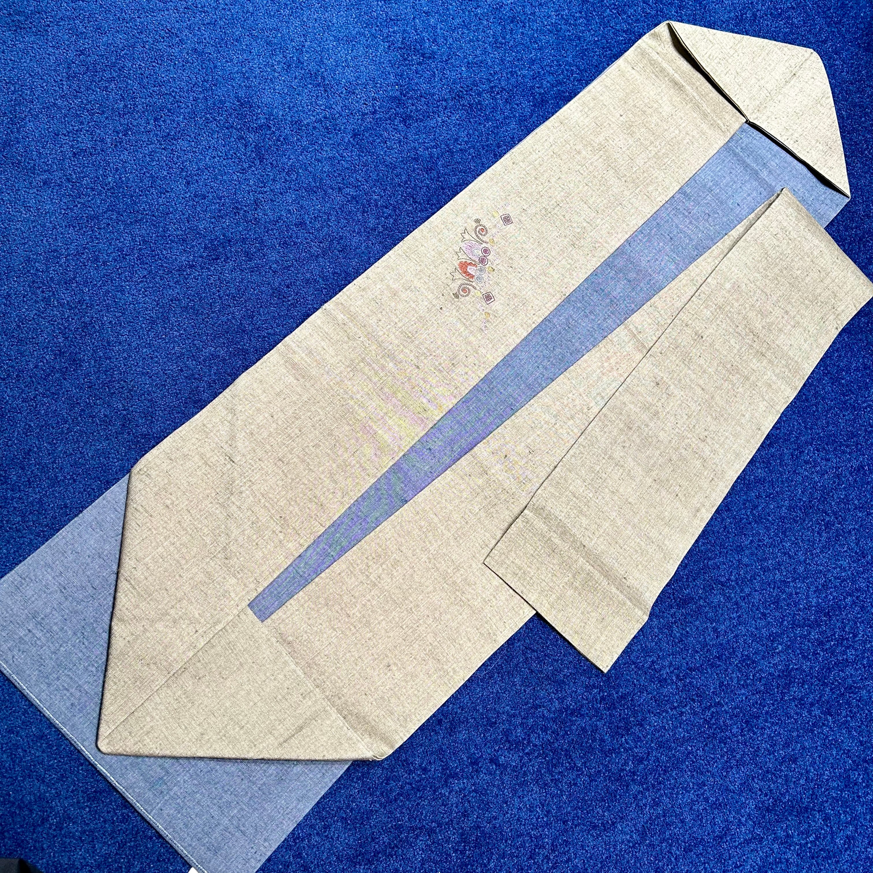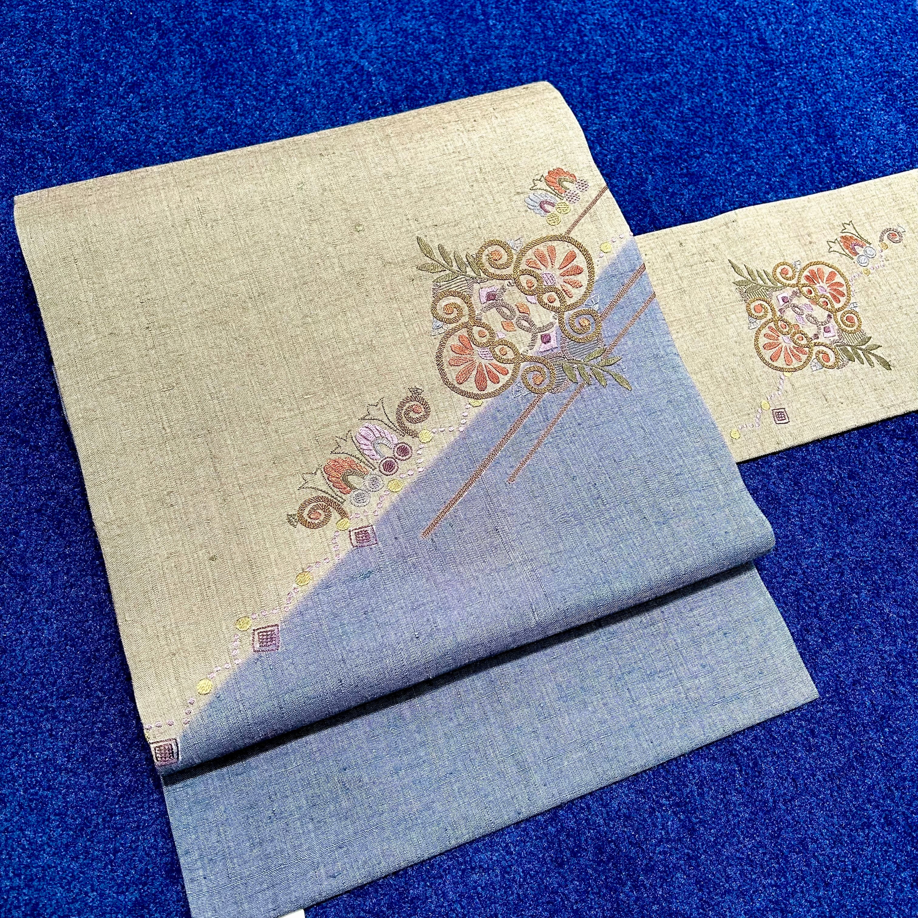 水辺の花*未使用品 相良刺繍 ブルー モスグレイ 名古屋帯 A893