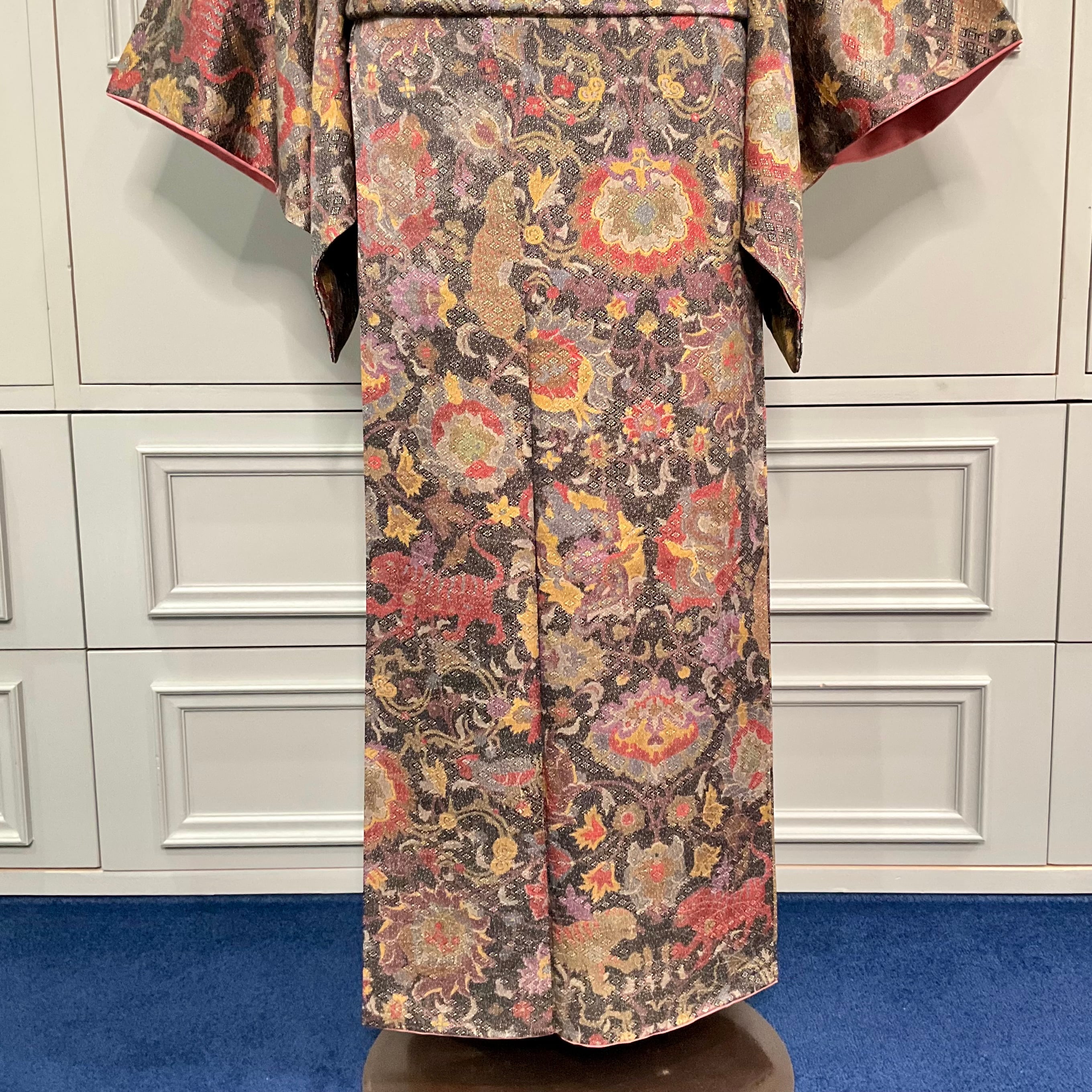 ブラックの地色に、唐花模様と珍しいトラ柄が描かれた小紋着物です