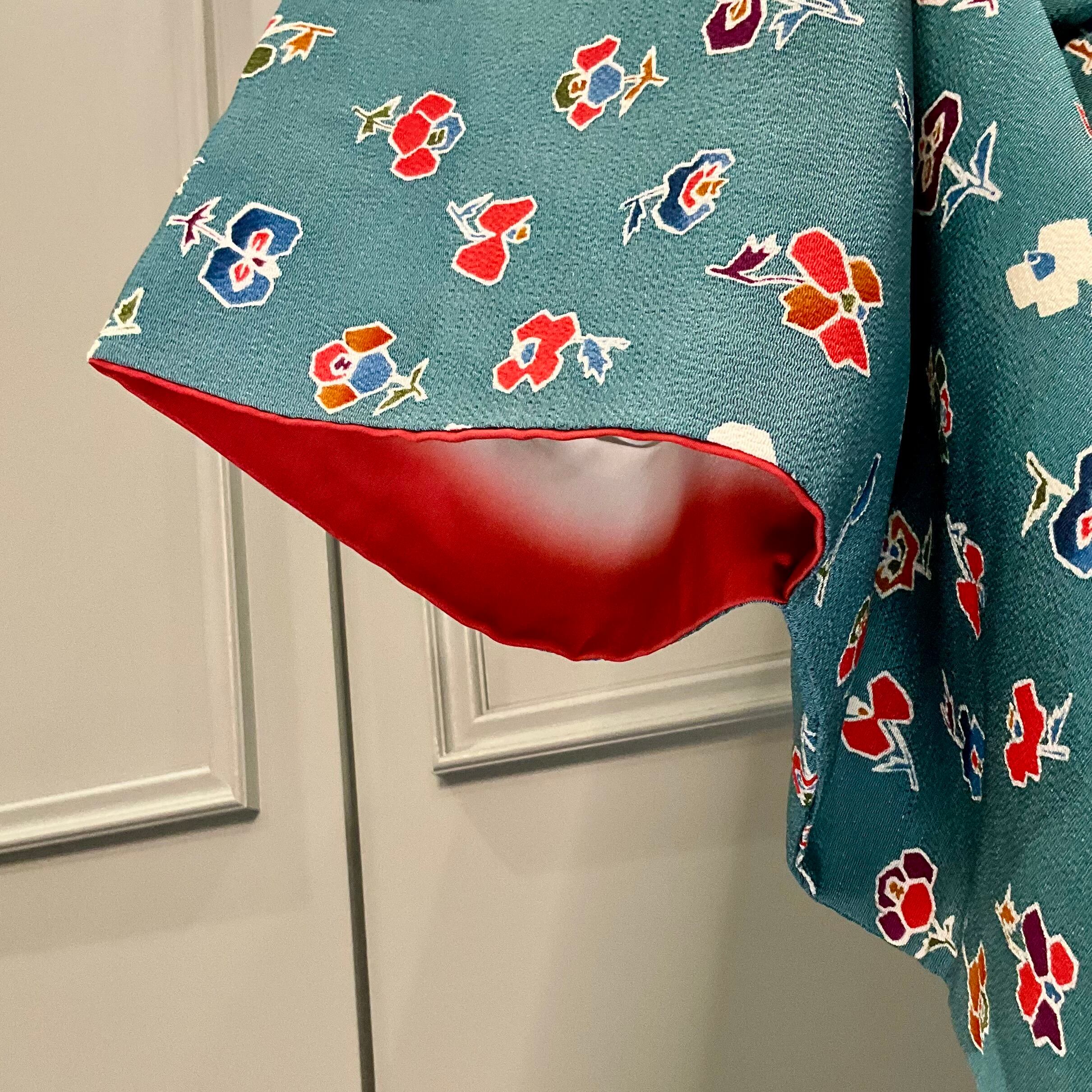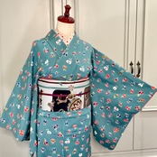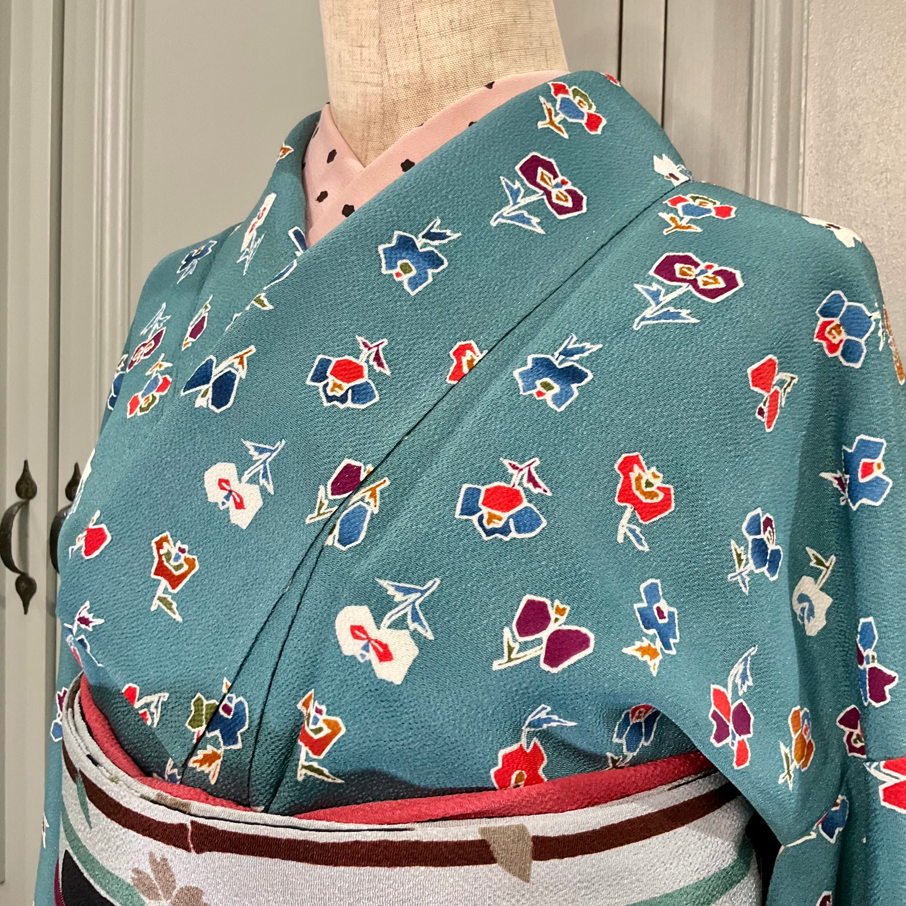 深い青緑色、花浅葱の地色に型染めの小ぶりで色とりどりのレトロな花模様が散りばめられた大人キュートな小紋です