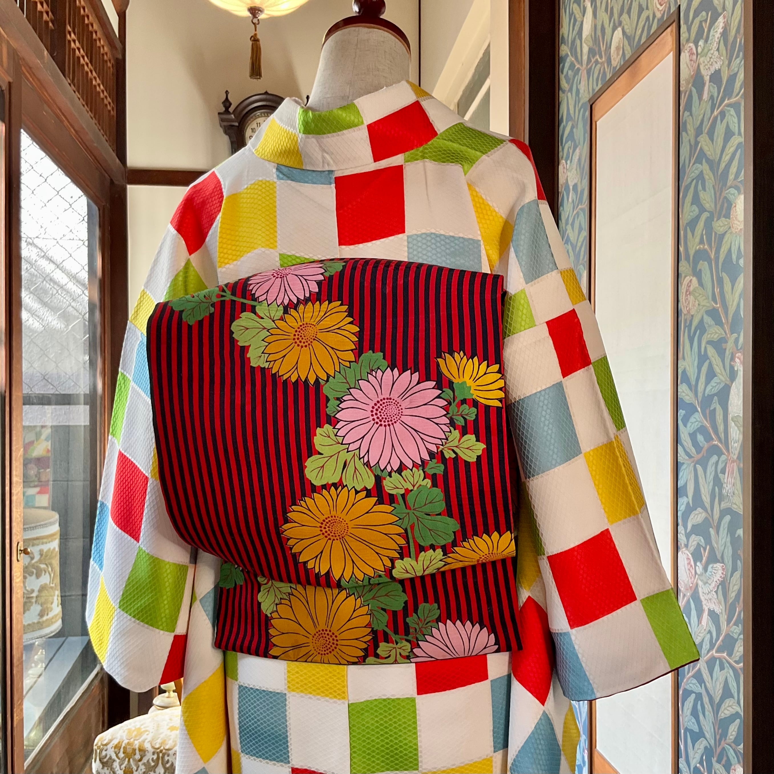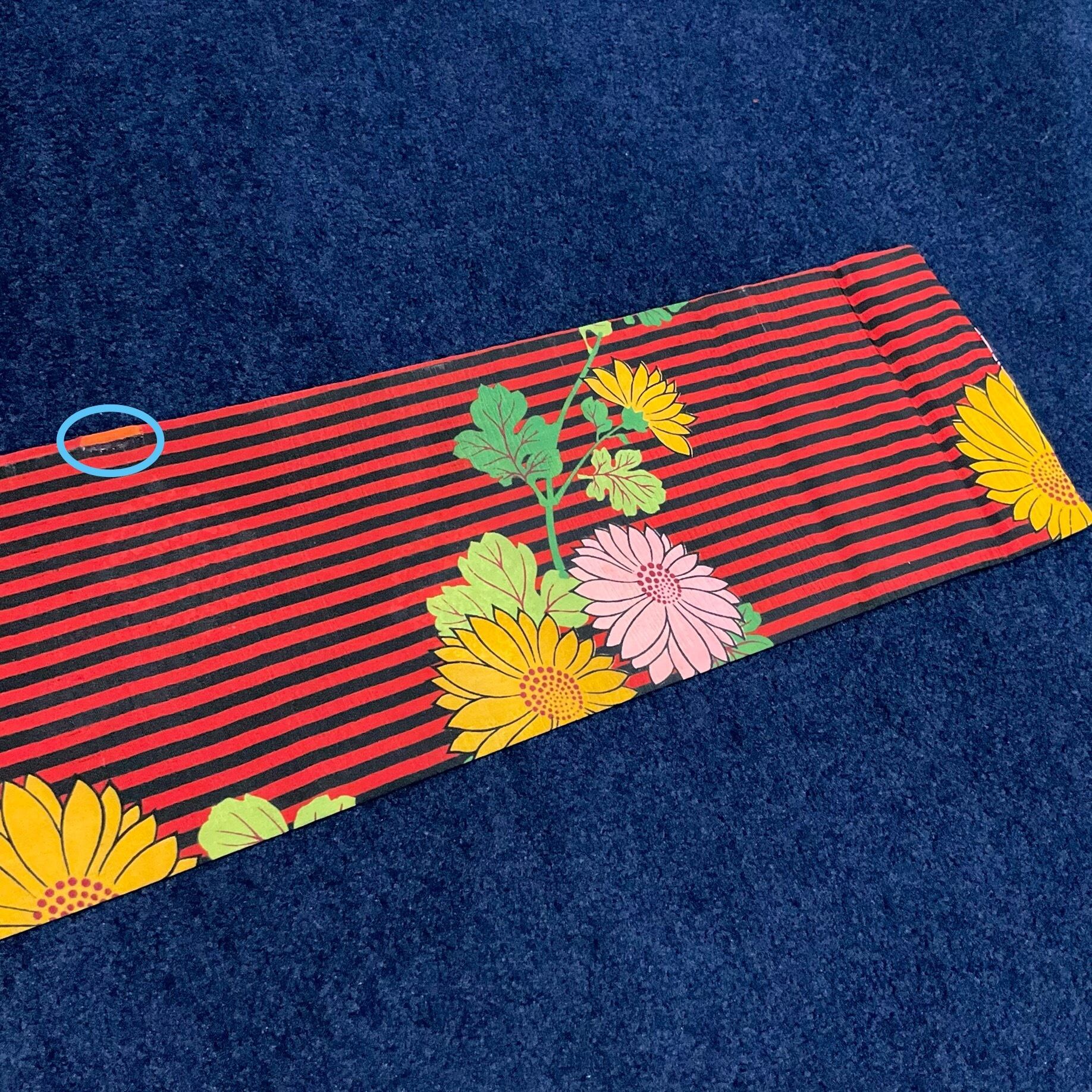 黒×赤のストライプ地に、菊がデザインされたアンティーク名古屋帯です
