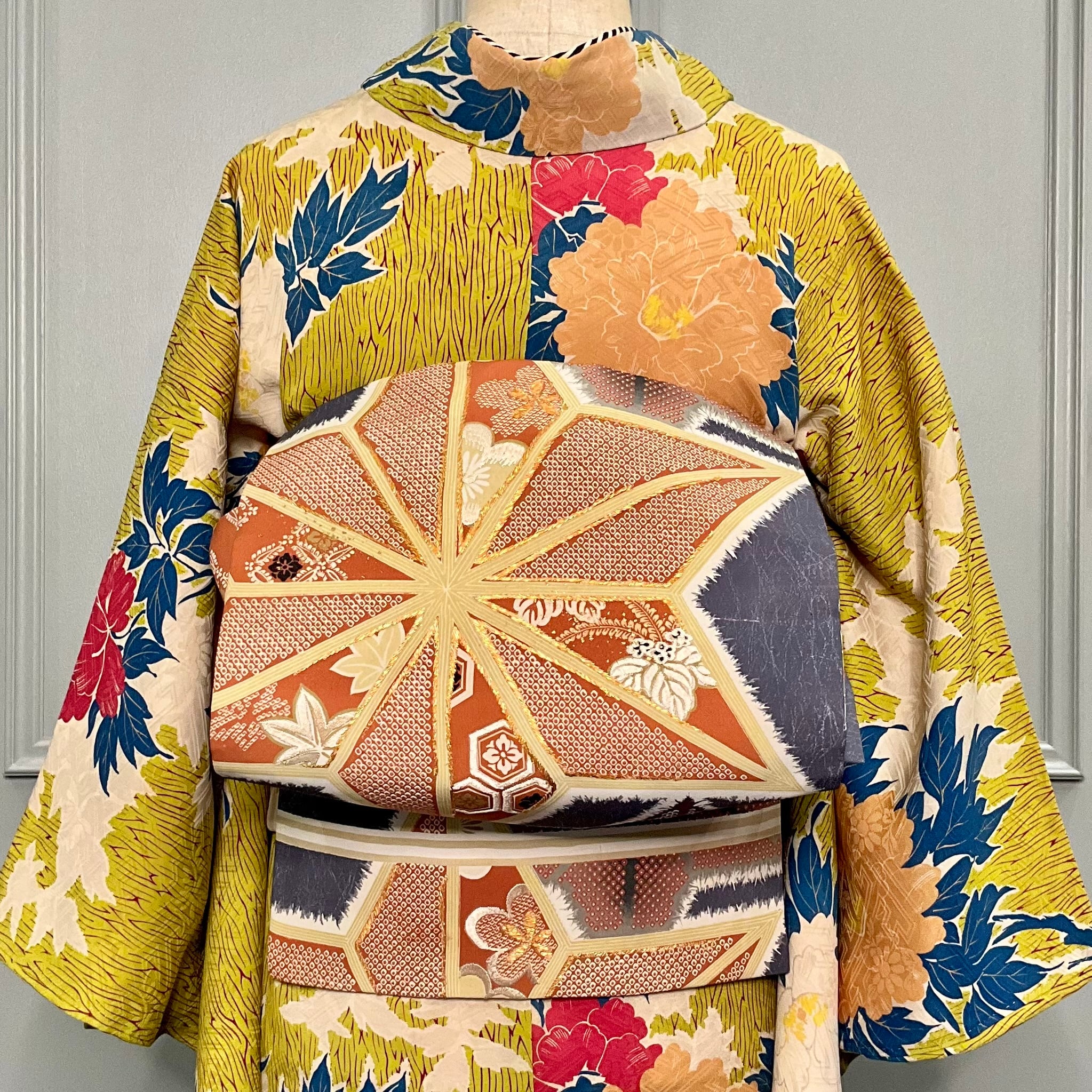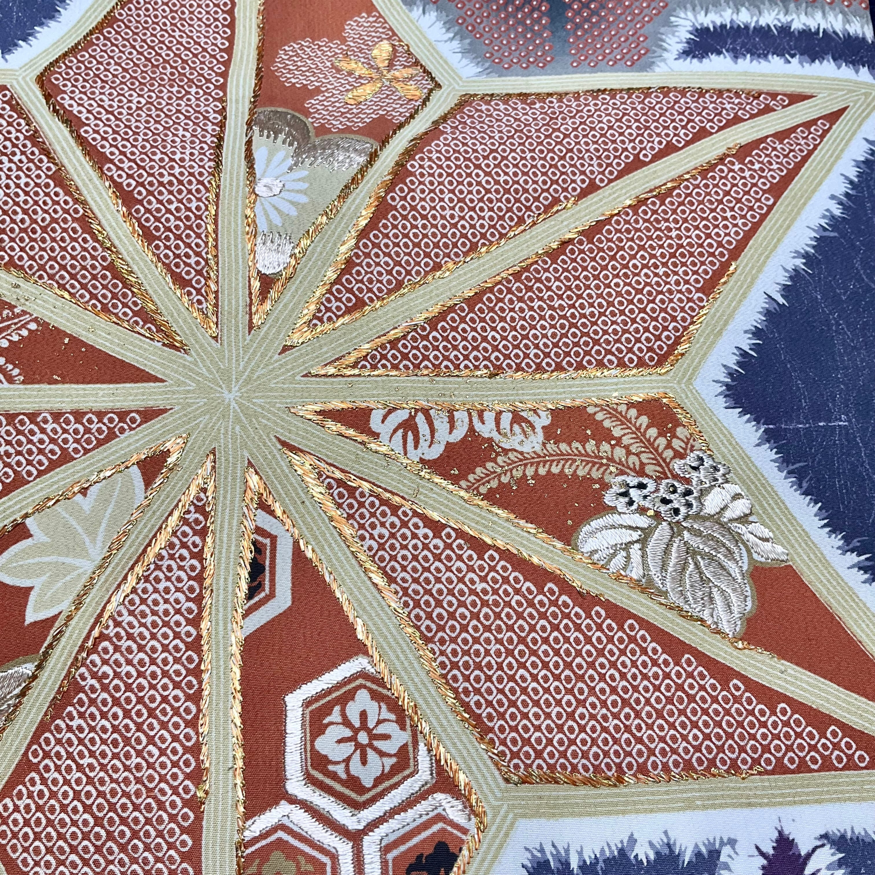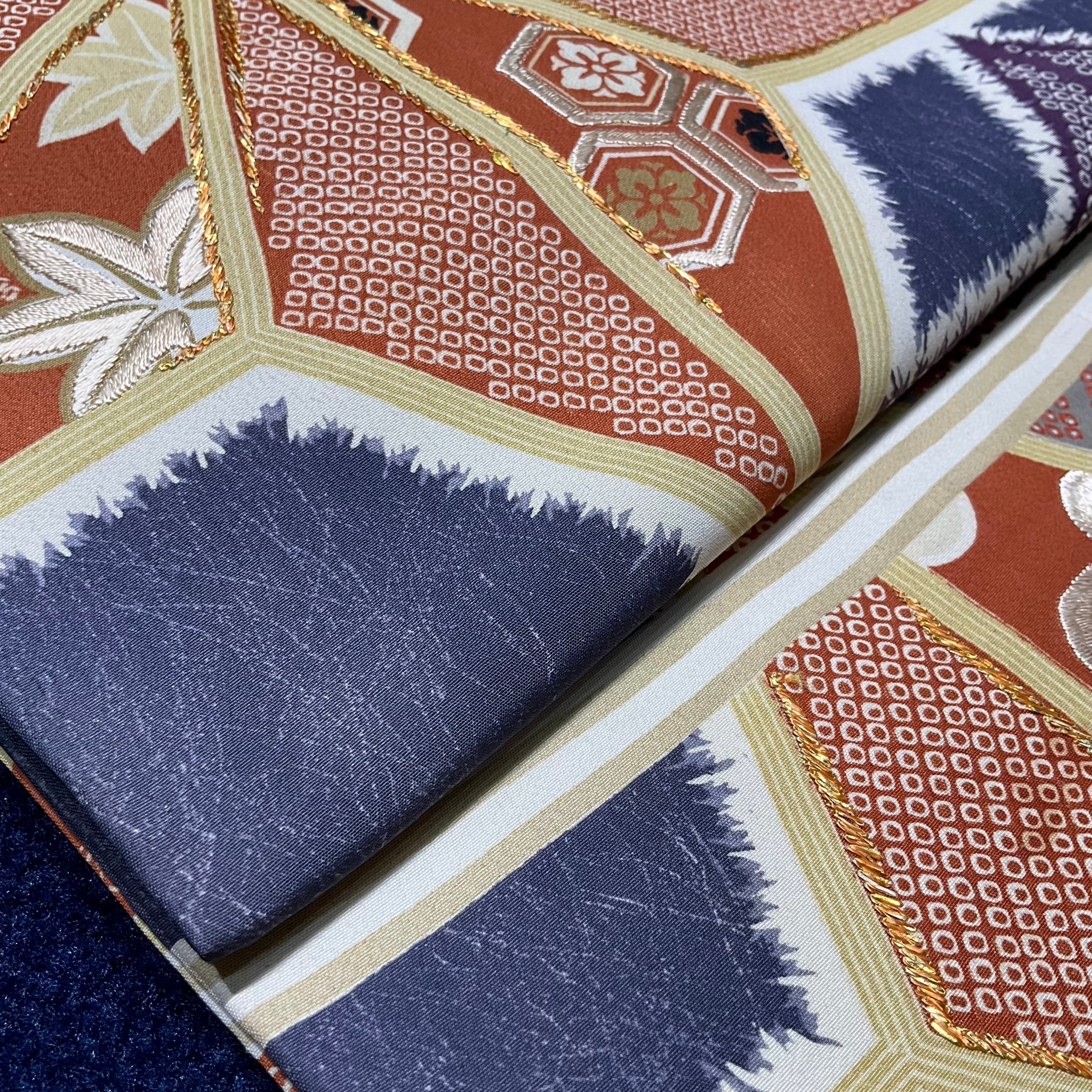 鹿の子模様の大きな麻の葉の中には、梅や紅葉が詰めこまれていています