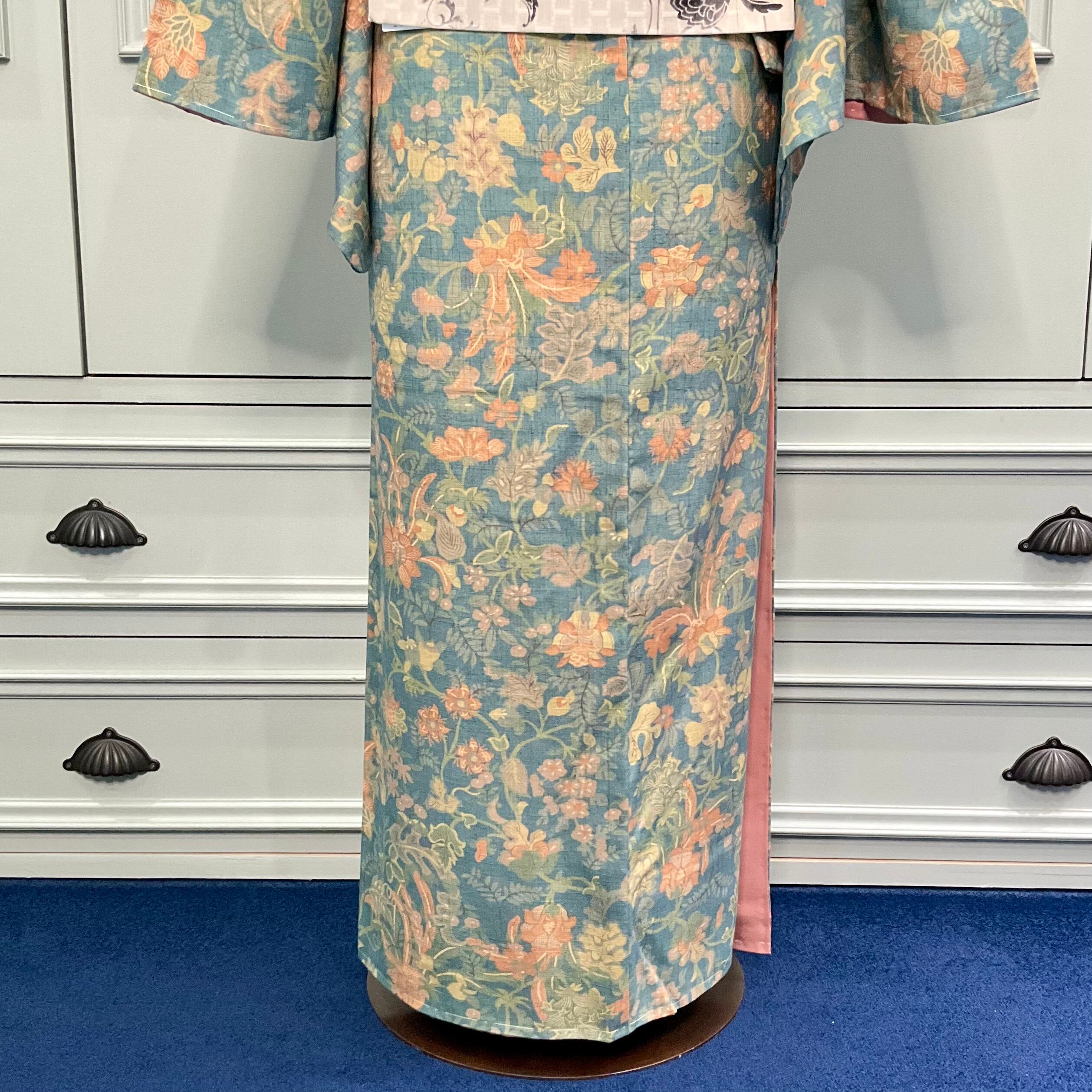 ブルーグリーンの地色に、やさしくボタニカルな更紗模様が素敵な、紬着物です♪