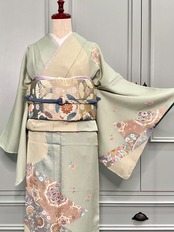 淡いセージグリーン系の縮緬地に、和モダンな模様の染めが美しい現代モノの訪問着です