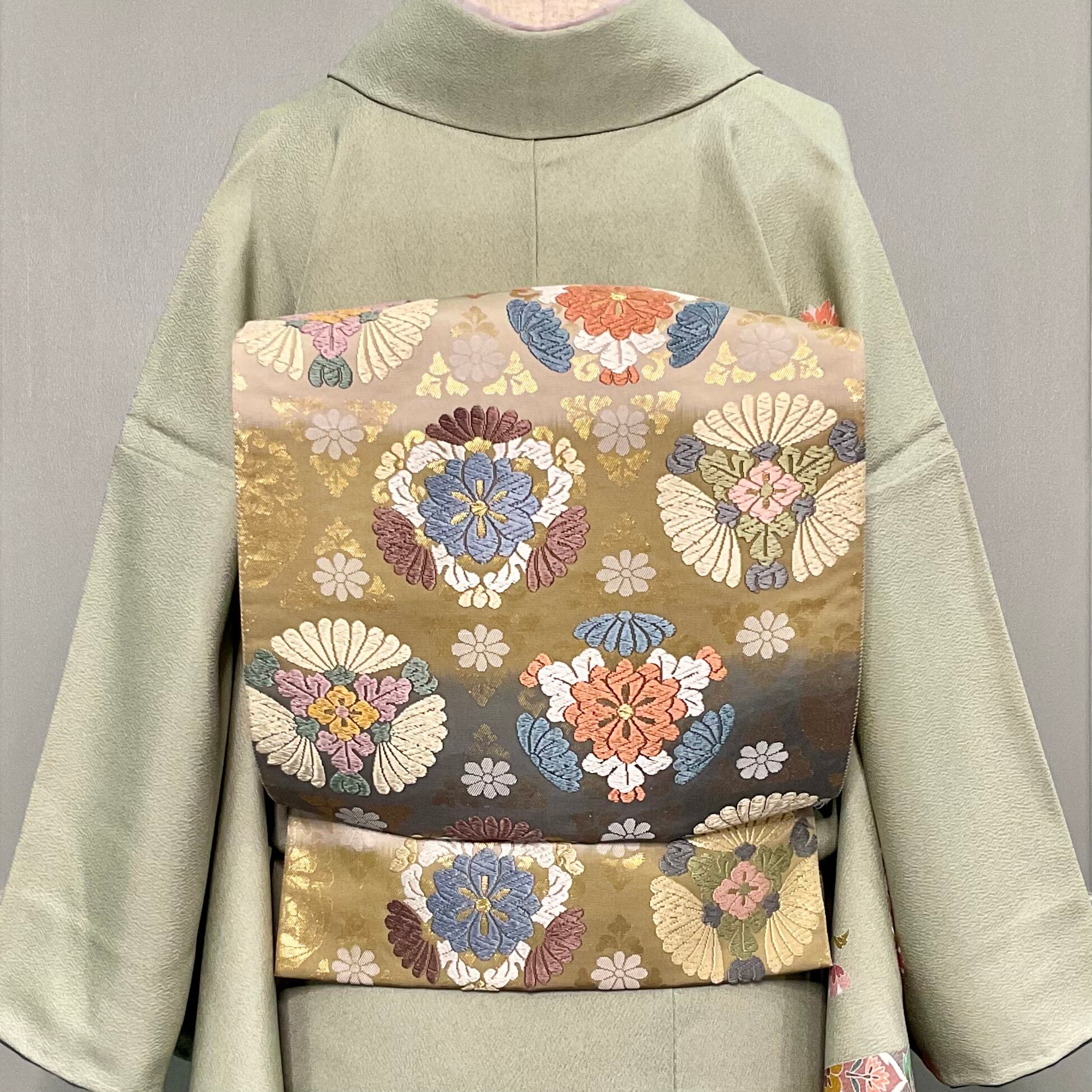 グレー×ゴールド×生成の3色の地色に、菊が文様化されているような唐織の美しい袋帯です