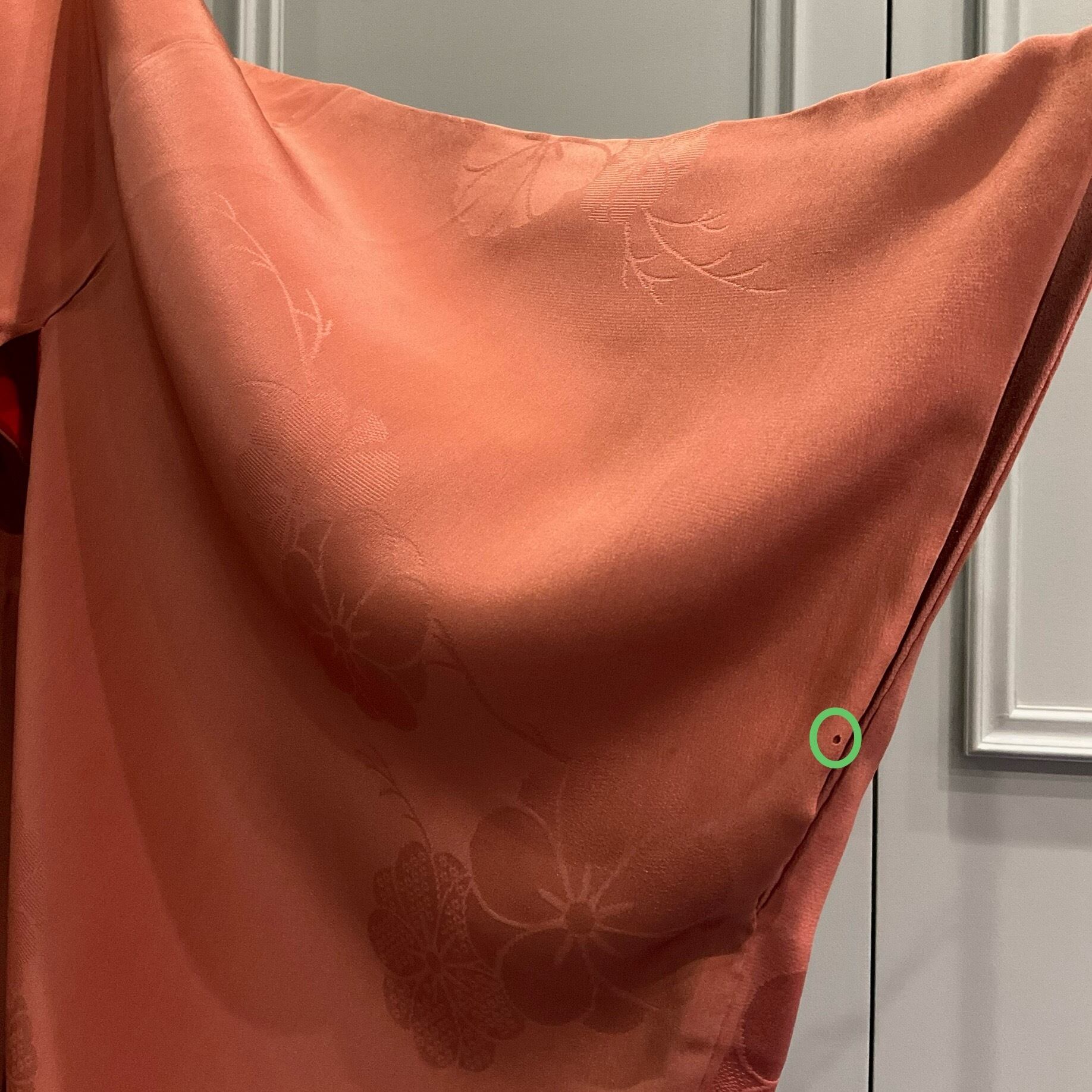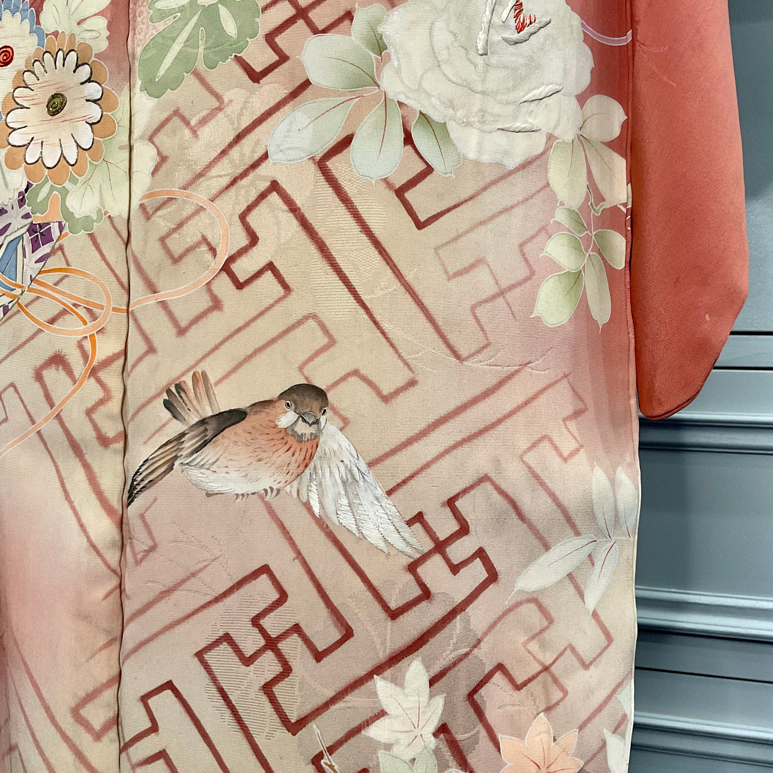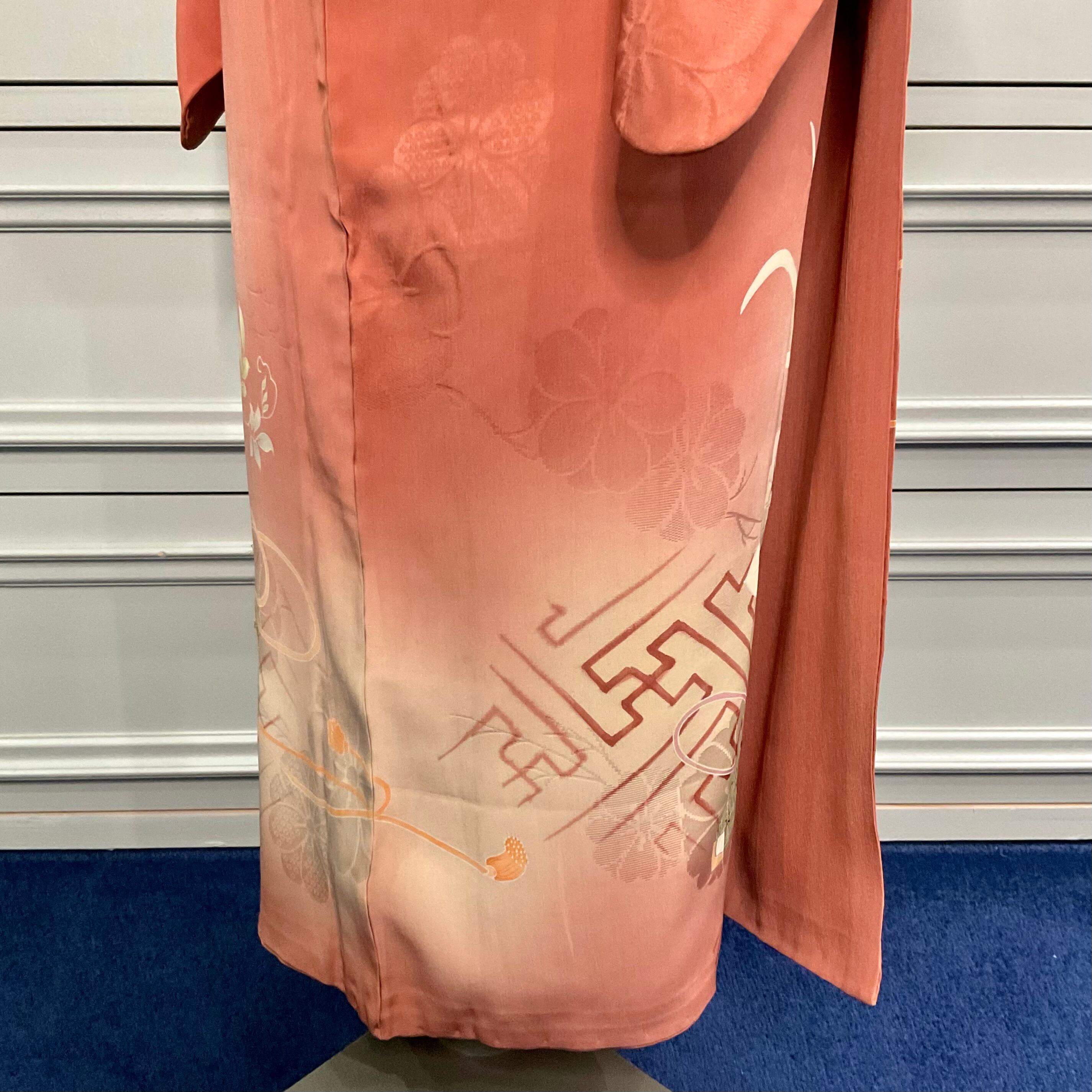 テラコッタ系の地色に、花熨斗やスズメが描かれた袷のアンティーク裾模様着物です